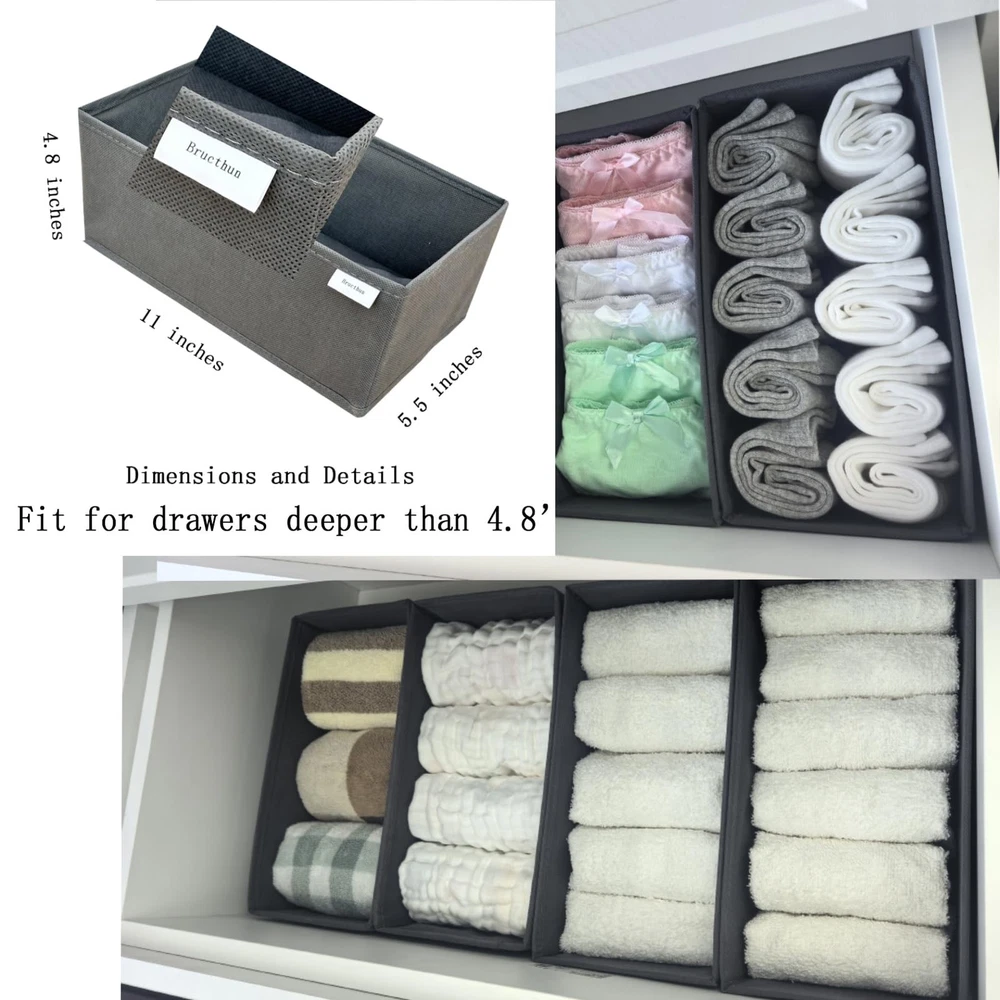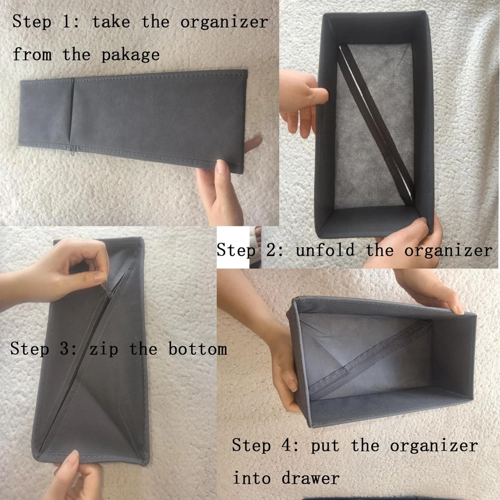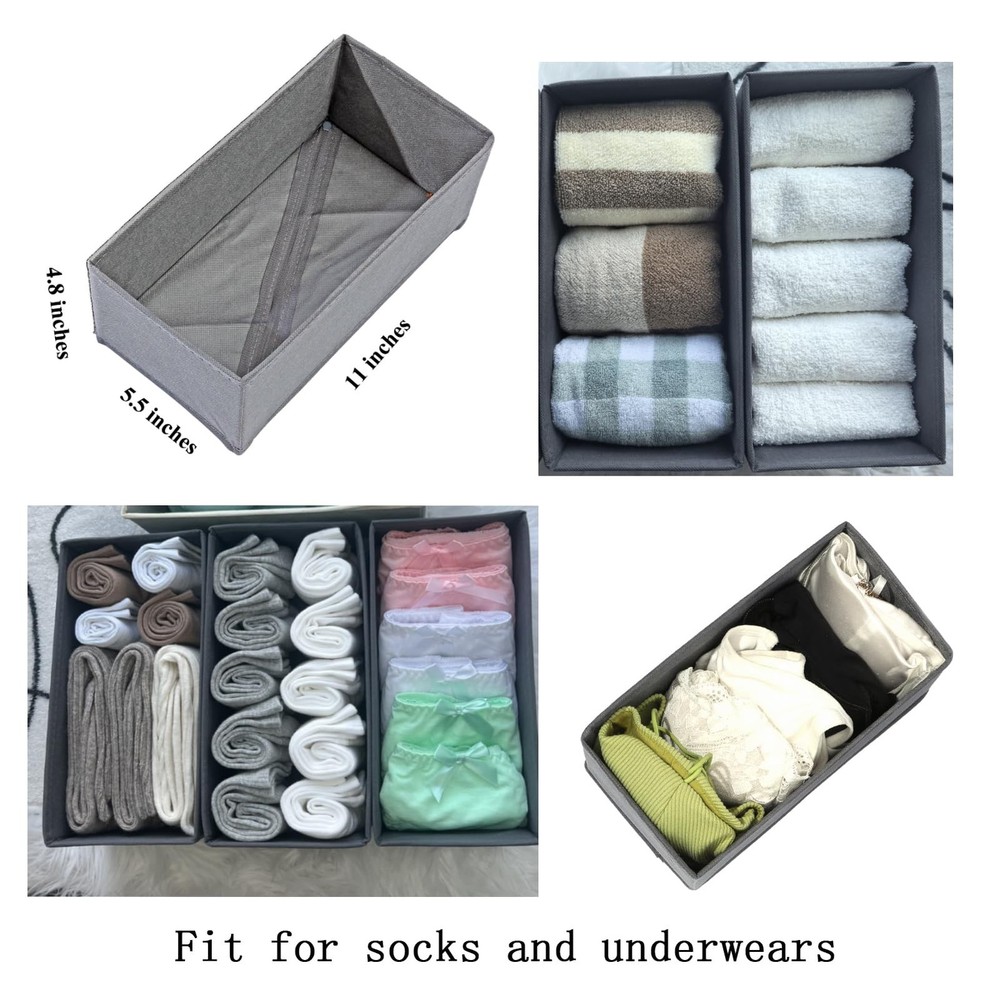 Transform your messy drawers into organized spaces with the Sock Drawer Organizer Set. This pack of fabric organizers is designed to bring order and efficiency to your daily routine. **Perfect Size & Fit** Each organizer measures 11" x 5.5" x 4.8" and holds 8-10 pairs of socks or underwear. Designed to fit drawers with minimum 4.8" depth, these organizers work perfectly in bedrooms, closets, wardrobes, and dressing areas. **Versatile Storage Solution** Ideal for organizing socks, underwear, ties, belts, handkerchiefs, hair accessories, and baby clothes. The separate compartments make finding items quick and effortless, saving you time every morning. **Durable Construction** Made with sturdy nonwoven fabric and reinforced hardboard walls to maintain shape and stand upright. Features bottom zipper for easy expansion and collapse, plus oxford fabric edges with reinforced stitching for long-lasting durability. **Easy Care & Maintenance** Simple to clean - just wipe with a damp cloth or wash with water. Machine washable for thorough cleaning when needed. Stain-resistant material keeps organizers looking new. **Space-Saving Design** Collapsible design allows for compact storage when not in use. Simply zip up the bottom to flatten for easy storage. When needed, unzip and the organizer springs back to full shape. **What You Get** 3/6/9 fabric drawer organizers (11" x 5.5" x 4.8" each) Durable construction with reinforced walls Bottom zipper for easy setup and storage Perfect for any drawer or closet organization needs Upgrade your storage game with - where organization meets functionality. 【3-Pack Value】Complete Organization Set Get 3 collapsible fabric storage bins in one convenient package. Organize multiple drawers or share with family members. Each bin folds flat for compact storage when not in use. 【Smart 3-Compartment Design】Never Lose Socks Again Three separate sections keep pairs together and prevent mismatching. Perfect for organizing socks by color, type, or family member. Also ideal for underwear, tights, and small accessories. 【Drawer-Perfect Dimensions】11" x 5.5" x 4.8" Specifically designed to fit standard dresser drawers without wasting space. The low 4.8" height allows for stacking or use in shallow drawers. Fits drawers as small as 12" deep. 【Premium Fabric Material】Durable & Easy Clean Constructed from high-quality non-woven fabric that maintains its shape. Reinforced with cardboard walls for structural integrity. Simply wipe clean with a damp cloth - no complicated washing required. 【Multi-Room Versatility】Beyond the Bedroom Use in closets for scarves and belts, in bathrooms for toiletries, in nurseries for baby items, or in offices for supplies. The neutral color works in any room of your home.