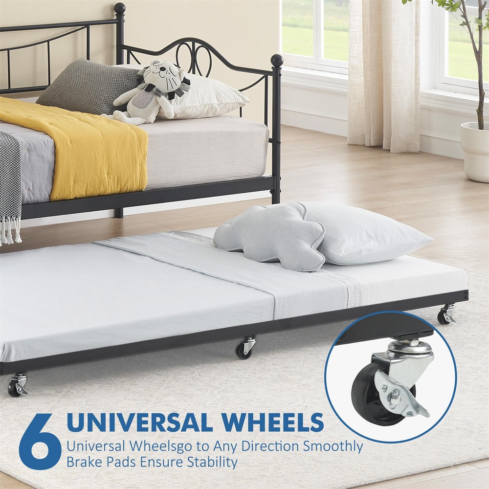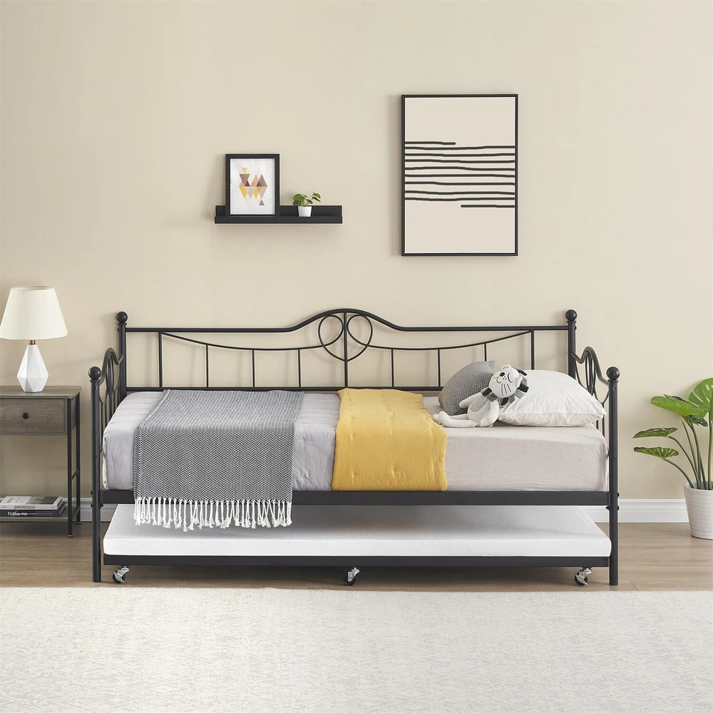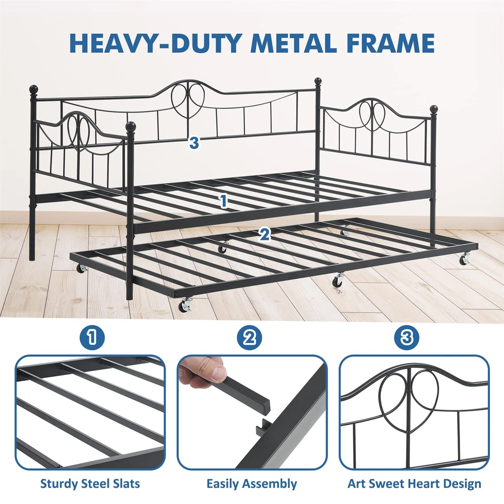 Metal Sofa Bed with Casters】 This metal sofa bed contains a main bed and a single bed with casters, which can be used as a freestanding chaise longue or a single bed, providing you with a convenient extra sleeping and leisure space, mattress with casters The recommended thickness is within 6 inches, and the thickness of the main bed mattress is within 6-8 inches. Stylish Modern Sofa Bed】 The frame of this double sofa bed is made of powder-coated iron. The inlaid classic flower-shaped headboard is fashionable and beautiful, adding a modern touch to the home. Modern and stylish design perfectly complements any home decor Heavy-Duty Metal Frame】 This sofa bed is made of a strong metal frame, with many metal slats supporting each other to enhance sturdiness and stability, with a flower-shaped headboard for safety protection, for the main bed and single bed Maximum weight capacity is 350 lbs. Space-Saving Design】 Our double sofa bed saves space. After use, the single bed can be placed under the main bed to maximize the use of space, and there is a 12-inch high storage space under the small bed frame to provide you with More space for organizing containers or storage boxes to organize your clothes, toys. Easy Assembly】 Our sofa bed does not require a box spring and includes detailed assembly instructions with each part labeled for easy assembly. Product Description A daybed where comfort meets your personal style With this daybed, the comfortable pocket spring mattresses provide support exactly where you need it. While the classic, simple design of the steel frame means you can give it your personal style with your choice of cushions, throws and bed linen.Plenty of room for your guests or for long, lazy days. Use the daybed as a freestanding chaise, a single bed or lift and pull out the extra bed base to create a double bed. Twin Daybed with Trundle, Sofa Bed Frame for Living Room Plenty of room for your guests or for long, lazy days. Use the daybed as a freestanding chaise, a single bed or lift and pull out the extra bed base to create a double bed. CLASSIC ART HEART DESIGN It is embed with classical sweet art heart appearance headboard, delicate and beautiful, add a vogue for home.The modern design of the daybed makes it easily match a variety of home decor styles. BUILT TO LAST Sturdy steel framework, and metal mattress platform are crafted with strength and longevity in mind; each twin size bed supports a maximum weight capacity of 500 lbs. EASY ASSEMBLY Place the 2×5 stringers sideways into the U-shaped slots on the headboard and footboard. Add the slats. No need for box spring! Size Twin Product Dimensions 78.1"L x 36.6"W x 38.6"H Special Feature Sofa Bed Material Steel Item Weight 64 Pounds Style Daybed Payment Delivery details Terms of sales About us Contact us Payment We accept payment either via PayPal or any of the following credit cards; Visa, MasterCard, Discover, and American Express. Wishing you a happy life! Delivery details We will provide you with the tracking number on the same day or the next day, and transport your package through UPS, DHL, FedEx and other courier methods. If you have any questions, please feel free to contact me and I will do my best to help you solve the problem. Wishing you a happy life! Terms of sales We offer a one month free return and exchange service, and you don't have to bear any losses. We will provide multiple solutions for you to choose from. If you have any questions, please feel free to contact me and I will do my best to help you solve them. We offer a two-year warranty period. If you have any quality issues with the product you purchased within two years, please feel free to contact me. I will provide you with a free replacement service. If you have any questions, please feel free to contact me. I will do my best to help you solve the problem. Wishing you a happy life! About us We are committed to becoming the best eBay seller, with high-quality suppliers, providing the most sincere service, including pre-sales and after-sales service, to give you a satisfactory shopping experience. If you have any questions, please feel free to contact me, and I will do my best to help you solve the problem. Wishing you a happy life! Contact us If you encounter any problems, please contact me by email at the first time, I will provide you with a solution as fast as possible so that I can give you a satisfactory shopping experience, wish you a happy life! Brand GRVEE Compatible Mattress Size TWIN Frame Material Metal Type Daybed Features Pull-out Trundle Bed and Under-bed Storage Manufacturer Warranty 5 Years Item Weight 64.15 Pounds Product Dimensions 78.1"L x 38.6"W x 36.6"H Material Iron, Metal
