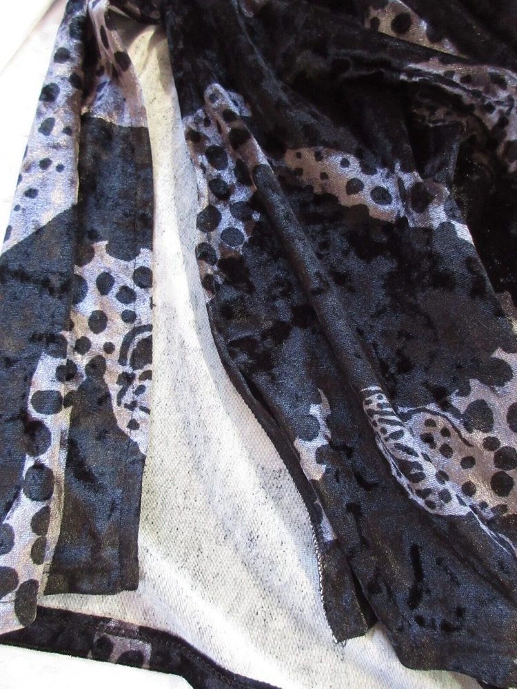 Sexy, elegant loungewear from Sofia Vergera, in pristine condition. Super soft crushed velvet jaguar print with purple trim. Polyester 95%/Spande 5%. 12" side slits. Other measurements: Length: approx 49" Armpit to armpit: approx 20" Sleeve length: approx 19" Please be aware there are no returns so measure carefully! All measurements are approximate and taken with utmost attention to accuracy Smoke-free home Seller has pets Items are not laundered prior to listing Please measure yourself to make sure this will fit you as there are no returns! Please measure your other clothing against this item of clothing to help you decide if this item will fit you! Please study photographs carefully as they are part of the description and items are sold “as is” Please do not hesitate to contact me with any questions you may have or if you need additional photos Actual color of item may vary due to camera flash, computer monitor, color variations I do not accept layaway so please do not ask me to "hold" something for you beyond eBay's policy. Thank you for your understanding.