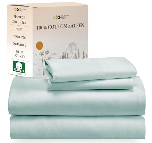 Menu 1. We require immediate payment. 2. We currently accept payment via eBay managed payments only. 3. Once payment is cleared, we will dispatch your shipment within 1-3 business days. Please refer to the "Shipping" tab for more information regarding shipping speed to your destination. Soft 100% Cotton Sheets King Size Bed Sheets Set with Deep Pockets, Seafoam Sheets, King Sheets Set with Sateen Weave, Cooling Sheets (Seafoam) Product description WHAT IT IS: King Bed Set - 4 Piece bed sheet set made from naturally comfortable 100% cotton sateen fabric. This soft, breathable & cooling bedding and pillowcases set has an ideal weight and is designed for long-lasting comfort, all year long. WHAT IT IS NOT: These king size sheets are not synthetic or polyester blended bed sheet sets. These are made using the finest cotton grown in India and all our cotton bedding & pillow-cases are loved by customers for their superior quality, softness, and comfort. WHAT COMES IN THIS 4 PIECE KING SIZE SHEET SET: 1 flat top sheet, 1 fitted bottom sheet with 14" deep pocket, and 2 king-sized pillowcases. The envelope closure pillowcases ensure a neat look. Our bottom fitted sheet has an all-round elastic and a "head/foot indicator" for easy bed making experience. WASH CARE & SUPPORT: These king size cotton bed sheets are easy to machine wash & dry & gets softer with each wash. They have been tested for shrinkage, pilling & color fastness. Buy risk-free as you can return the sheet set if you dont like them, even if they are washed. WHAT MAKES US TRUSTWORTHY: Our bedding collection is certified as STANDARD 100 by OEKO-TEX to ensure no harmful substances get in your bed. We use non-plastic boxes for our packaging & are committed to mindful & ethical processes. PLEASE MESSAGE US IF YOU HAVE ANY OTHER QUESTIONS, AND MANY THANKS FOR READING ALL OF THIS. Copyright ©#. All Rights Reserved.