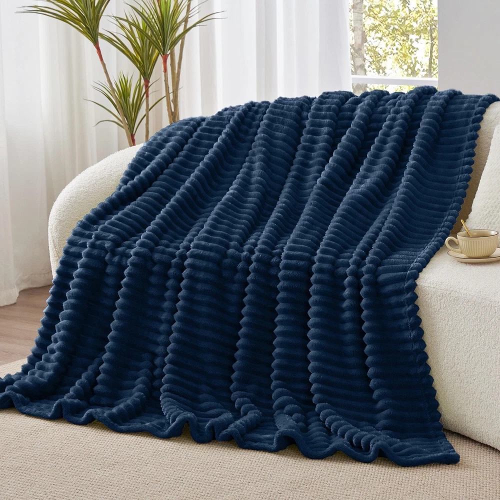 Fleece Throw Blanket for Couch - 300GSM Soft & Warm Fluffy Navy Blanket, Decorative and Giftable Striped Blankets for Women, Men, 50"x60" 【Upgraded Striped Blanket】: The upgraded striped fleece blanket features a higher-weight fabric, enhancing warmth and comfort. The widened stripes highlight the three-dimensional and sensory qualities of the blanket, creating a gentle and relaxed visual appeal. This further enhances its decorative characteristics, providing an elevated experience for both warmth and style. 【Soft & Cozy】: Indulge in the luxurious softness of fleece blankets, crafted from 100% microfiber polyester. With a plush 300GSM double-sided design, these fuzzy blankets offer a dense, fluffy texture for enhanced comfort. Combining 3D striped texture with fluffy fleece ensures warmth while also being lightweight and breathable. 【Versatile Usages】: Experience ultimate coziness and warmth during your leisure time. Whether snuggled up for a nap or immersed in a TV series on the couch, these warm blankets provide the perfect companionship. Additionally, they make an ideal accessory for camping or travel adventures, ensuring comfort wherever you go. 【All Seasons Suitable】: Embrace the perfect balance of warmth and lightness throughout the year with cozy blankets. The 300GSM fleece throw blankets offer warmth during chilly fall and winter nights, while remaining breathable for outdoor enjoyment in spring or summer. Delicate and distinct textures can dress different seasons and festivals, which also is a thoughtful gift to share coziness. 【Easy to Care】: Reinforced with neat stitches for strong seams, our blankets are designed for durability. Machine washable and resistant to shrinkage, color fading, and unraveling. Enjoy peace of mind with our 90-day satisfaction —our 24-hour team for any assistance, and we'll ensure your satisfaction.