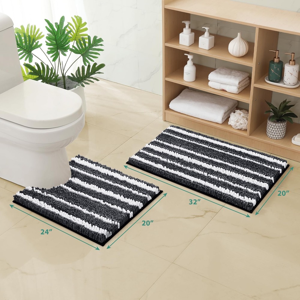Cationic Dyed Bathroom Rugs Set includes 2 pieces of chenille mats that are extra soft, highly absorbent, and feature a non-slip backing. These stylish rugs are machine washable, making them easy to clean and perfect for keeping your bathroom floor dry and comfortable. Ideal for use around the bath and toilet. Cationic Craft: This creates a striking dual-color effect with blended white stripes, seamlessly coordinating with various decor styles in your bathroom, kitchen, or bedroom. This feature enhances the visual appeal, delivering a perfect and stylish look Soft and Comfortable: Indulge in unparalleled comfort with our plush bathroom rug. Made from high-pile chenille, it envelops your feet in soothing softness, providing a heavenly experience after every bath. No more stepping onto hard, cold floors -our bath rugs pamper you with cozy feel. High Water Absorbency: These upgraded luxurious shag rugs are made of plenty of shaggy microfibers, each fiber about 1" high and dense. Can quickly soak up the water and keep your floor dry like a giant sponge. Non-slip PVC Backing: Ensures the rug stays in place, providing a firm grip on bathroom floors. Machine Washable: Wash on a gentle cycle with cold water and mild detergent. Avoid bleach and dry cleaning. Hang or lay flat to air dry. This keeps your bath rugs in great condition and ensures your space stays tidy and clean.