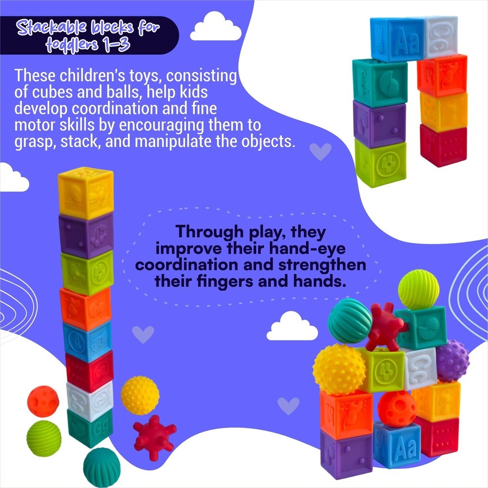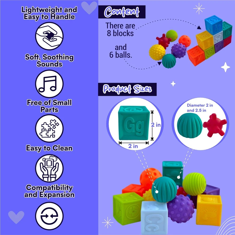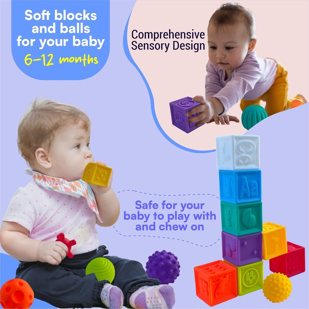 The Baby Soft Blocks set includes 14 pieces designed for toddlers aged 1 to 3 years old. Made by Kids Melody, these soft toys aid in teething and sensory development, promoting motor skills and cognitive growth. The blocks feature a colorful design with an alphabet and animal theme, engaging children in interactive play. This educational toy is suitable for both boys and girls, encouraging learning and exploration in a fun and stimulating way.