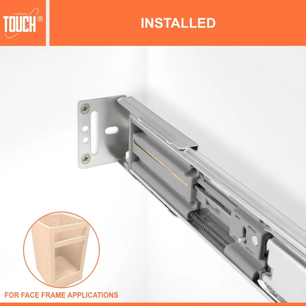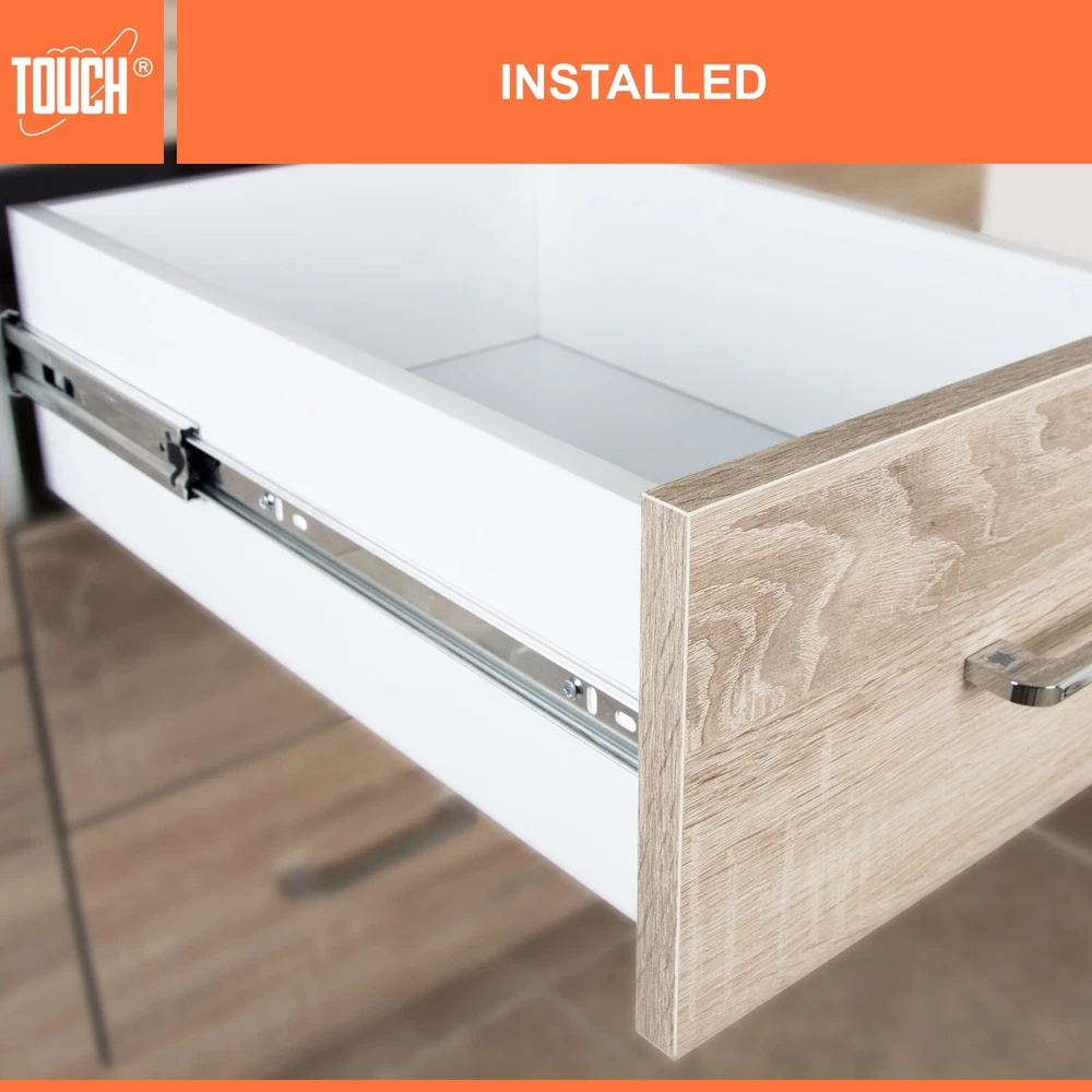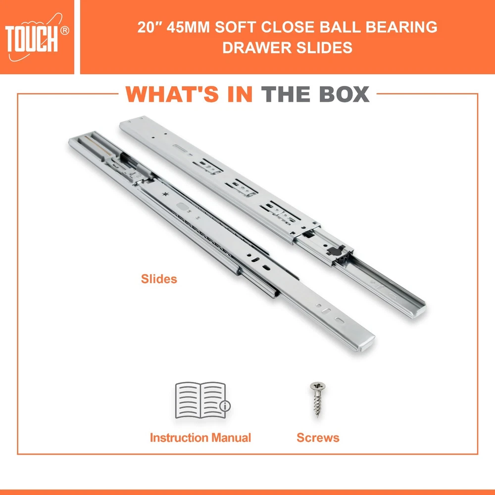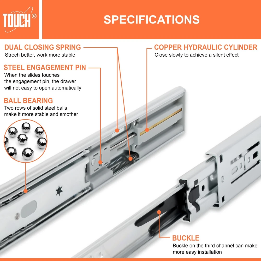 High-Quality Products TOUCH Cabinets Hardware is committed to providing a high-quality cabinet hardware, such as Door Hinges, Drawer Slides, and other kitchen cabinets hardware. Why TOUCH? Unlike other drawer slides, TOUCH side mount soft close drawer slides are as easy to open as they are to close. TOUCH’s unique drawers are made with high-quality materials, making them suitable for heavy-duty applications! Your satisfaction is our main priority, and we trust that our product will meet your needs. A 30-days full return/replacement is offered if faced with any obstacles, NO questions asked! SIDE MOUNT SOFT CLOSE BALL BEARING DRAWER SLIDES Keep your cabinets easy to open and simplify your bathroom or kitchen setup with these kitchen cabinet hinges. These cabinetry hinges pull the cabinet door shut after being opened and released, making this cabinet hardware perfect for use with lazy susan kitchen cabinet doors, bathroom vanity cabinet doors, wall cabinet and furniture cabinets. Constructed with high quality cold-rolled steel and featuring a nickel plated steel finish for a refined appearance, these drawer slide rails are intended for use with face frame and frameless cabinets, and the drawer slide parts work well in both residential and commercial settings. SPECIFICATIONS Application: Face frame or frameless cabinet Closing type: Soft Close Mounting type: Side Mount Load Capacity: 100 lb. (45 kg) / 18″ Height of slide: 45mm Required space: 1/2″ (12.7mm) each side Slide space adjustment: ±0.5mm Copper cylinder and dual closing springs CLOSING TYPE Soft close mechanism features a built-in hydraulic damper made of pure copper for durability and high performance. Double spring design make less noise when close and open, create a warm and quiet family environment for you. MATERIAL Made of high grade cold-rolled steel with zinc plated finish, heavy-duty and durable, load-bearing. Solid ball bearing ensure sooth opening and closing, can serve you many years. You would feel the quality when you receive. LOAD CAPACITY Maximum load 100 lb. (45 kg) / 18 inch