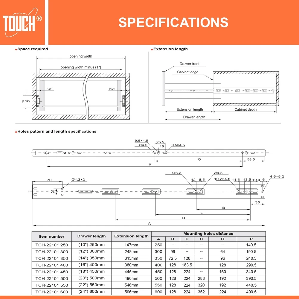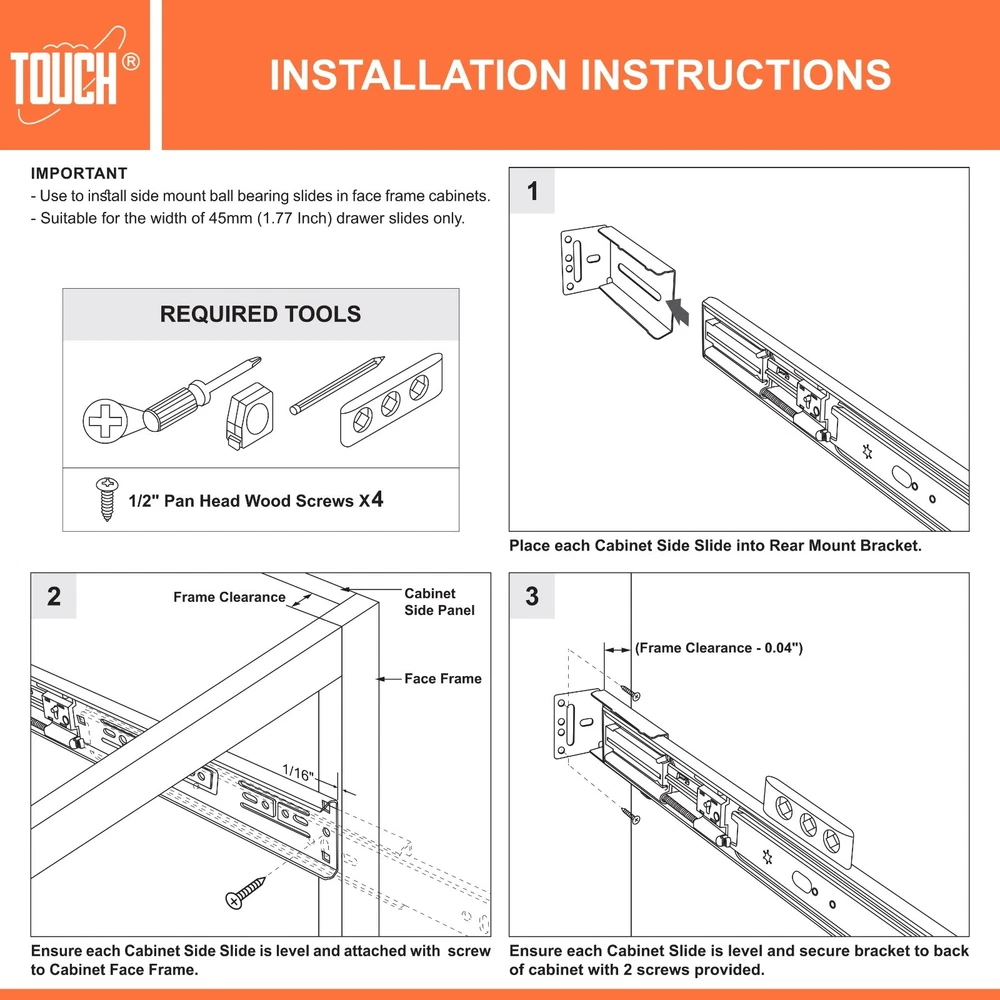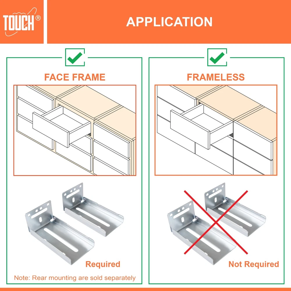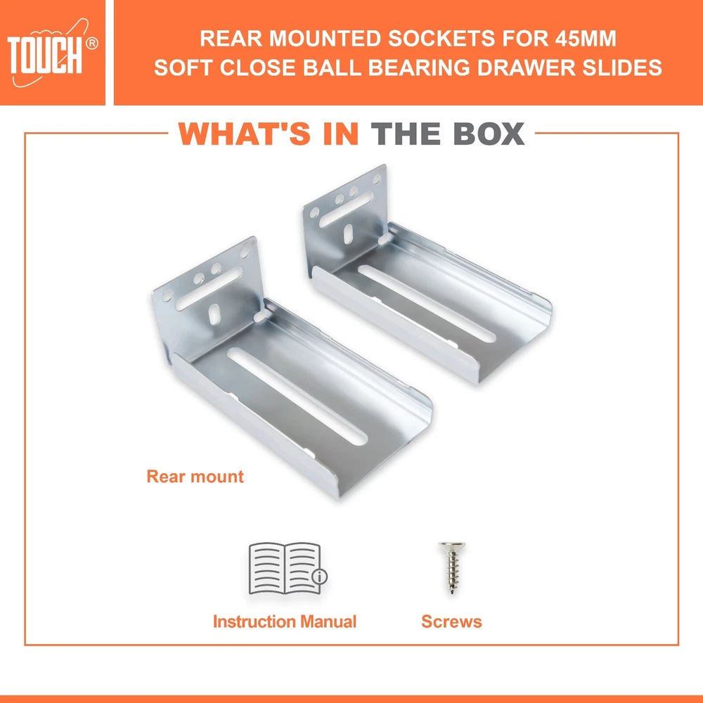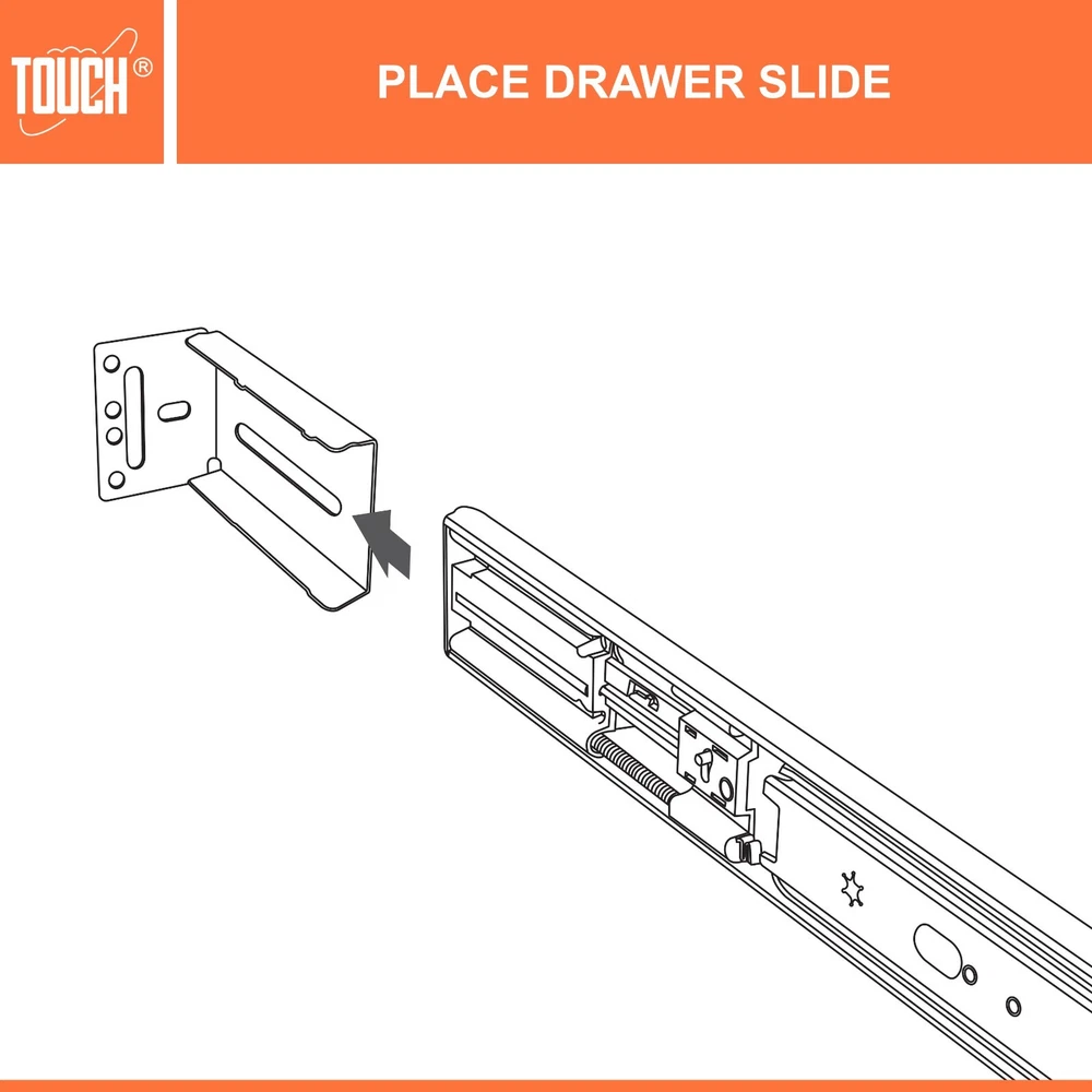 High-Quality Products TOUCH Cabinets Hardware is committed to providing a high-quality cabinet hardware, such as Door Hinges, Drawer Slides, and other kitchen cabinets hardware. Why TOUCH? Unlike other drawer slides, TOUCH side mount soft close drawer slides are as easy to open as they are to close. TOUCH’s unique drawers are made with high-quality materials, making them suitable for heavy-duty applications! Your satisfaction is our main priority, and we trust that our product will meet your needs. A 30-days full return/replacement is offered if faced with any obstacles, NO questions asked! SIDE MOUNT SOFT CLOSE BALL BEARING DRAWER SLIDES Keep your cabinets easy to open and simplify your bathroom or kitchen setup with these kitchen cabinet hinges. These cabinetry hinges pull the cabinet door shut after being opened and released, making this cabinet hardware perfect for use with lazy susan kitchen cabinet doors, bathroom vanity cabinet doors, wall cabinet and furniture cabinets. Constructed with high quality cold-rolled steel and featuring a nickel plated steel finish for a refined appearance, these drawer slide rails are intended for use with face frame and frameless cabinets, and the drawer slide parts work well in both residential and commercial settings. SPECIFICATIONS Application: Face frame or frameless cabinet Closing type: Soft Close Mounting type: Side Mount Load Capacity: 100 lb. (45 kg) / 18″ Height of slide: 45mm Required space: 1/2″ (12.7mm) each side Slide space adjustment: ±0.5mm Copper cylinder and dual closing springs CLOSING TYPE Soft close mechanism features a built-in hydraulic damper made of pure copper for durability and high performance. Double spring design make less noise when close and open, create a warm and quiet family environment for you. MATERIAL Made of high grade cold-rolled steel with zinc plated finish, heavy-duty and durable, load-bearing. Solid ball bearing ensure sooth opening and closing, can serve you many years. You would feel the quality when you receive. LOAD CAPACITY Maximum load 100 lb. (45 kg) / 18 inch