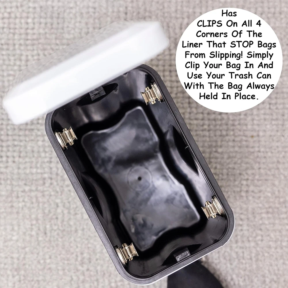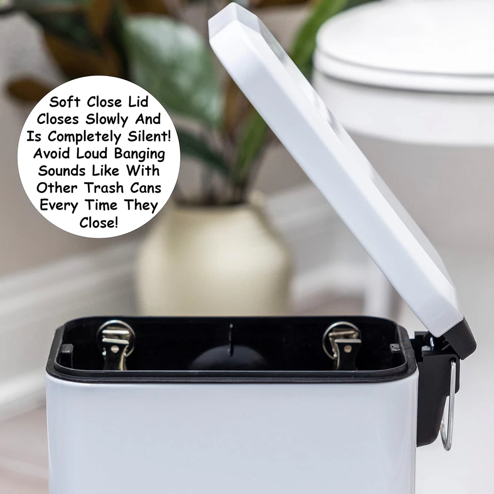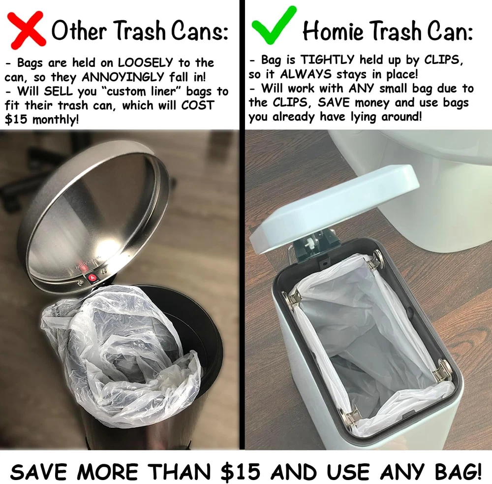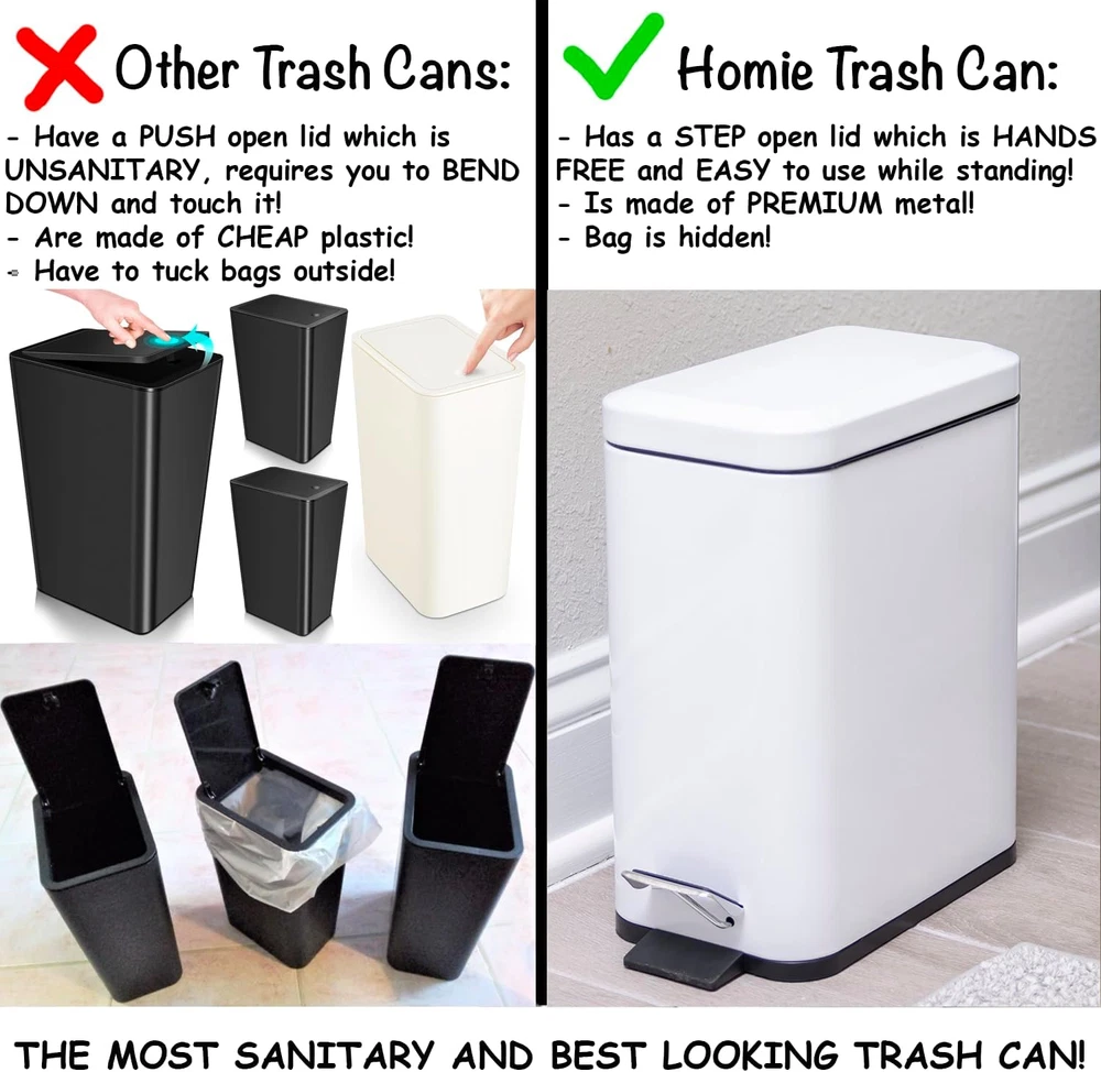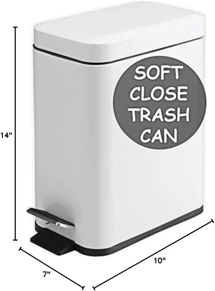 β π¦π’ππ§ πππ’π¦π πππ - This is the quietest trash can you will use with no annoying noises. Gentle lid makes no noise, simple and automatic garbage bin open and closing. β ππ‘π§π πππ π¦πππ£ ππππ£π¦ - No more having to keep fixing your bag because it has fallen into the trash can. Bags never fall into tiny bin, touch-less design, great for any room, office. β πͺπ’π₯ππ¦ πͺππ§π ππ‘π¬ πππ - Save more than $15 on not having to buy custom liner bags to fit your trash can. Use any old cheap bag lying around. Any bag snugly fits the bin and stays hidden inside. β πππ¦π¬ π§π’ πππππ‘ - Homie has ensured this trash can will take no time to clean. Just remove the liner, wash it, and throw it back in without harming the metal. Removable plastic liner simply washed, best mini silver dustbin or wastebasket β π¦π πππ πππ§ππ₯π’π’π π§π₯ππ¦π πππ‘ - Built with durability in mind, this trash can will last you for years. All of the material used a premium grade. Durable pedal and construction, 11.5" H x 11.5" L x 5.5" W size, slim and skinny Product Description Soft Close Lid Use the trash can peacefully with no noise when it closes! The soft close lid gets rid of the constant annoying banging sound of the lid closing you will hear from other trash cans. Anti - Bag Slip Clips Simply clip bags into the inside of the trash can, and they will never fall in. And you get the added benefit that the bag doesn't need to be tucked around the top of the can, meaning that it won't be visible at all when the can is closed. Your trash can will look cleaner than ever! Works With Any Bag The clips work with almost any bag you think of to securely hold it in place. This saves you tons of money because you don't have to buy special fitted bags for your trash can anymore! Any bag will do! Quality Construction Make use of the durable steel step and lid for repeated uses without any problems. A great slim size for the trash can makes it great for bathrooms. Soft Close Lid Anti - Bag Slip Hooks Works With Any Bag Quality Construction