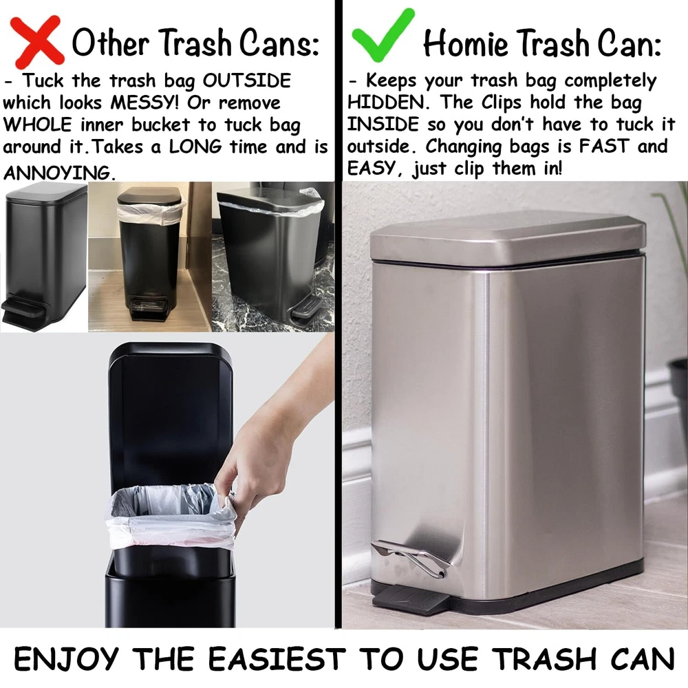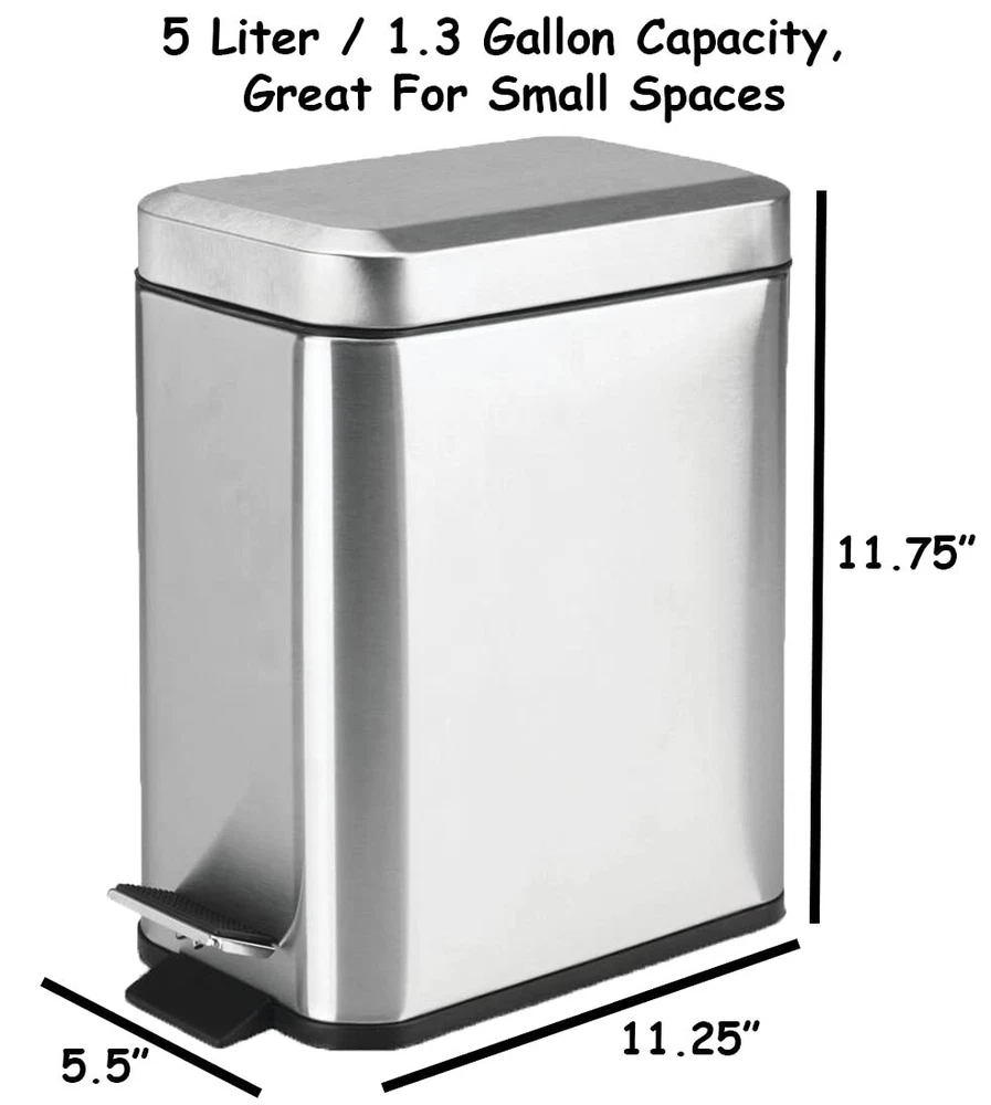 β π¦π’ππ§ πππ’π¦π πππ - This is the quietest trash can you will use with no annoying noises. Gentle lid makes no noise, simple and automatic garbage bin open and closing. β ππ‘π§π πππ π¦πππ£ ππππ£π¦ - No more having to keep fixing your bag because it has fallen into the trash can. Bags never fall into tiny bin, touch-less design, great for any room, office. β πͺπ’π₯ππ¦ πͺππ§π ππ‘π¬ πππ - Save more than $15 on not having to buy custom liner bags to fit your trash can. Use any old cheap bag lying around. Any bag snugly fits the bin and stays inside. β πππ¦π¬ π§π’ πππππ‘ - has ensured this trash can will take no time to clean. Just remove the liner, wash it, and throw it back in without harming the metal. Removable plastic liner simply washed, best mini silver dustbin or wastebasket β π¦π πππ πππ§ππ₯π’π’π π§π₯ππ¦π πππ‘ - Built with durability in mind, this trash can will last you for years. All of the material used a premium . Durable pedal and construction, 11.5" H x 11.5" L x 5.5" W size, slim and skinny