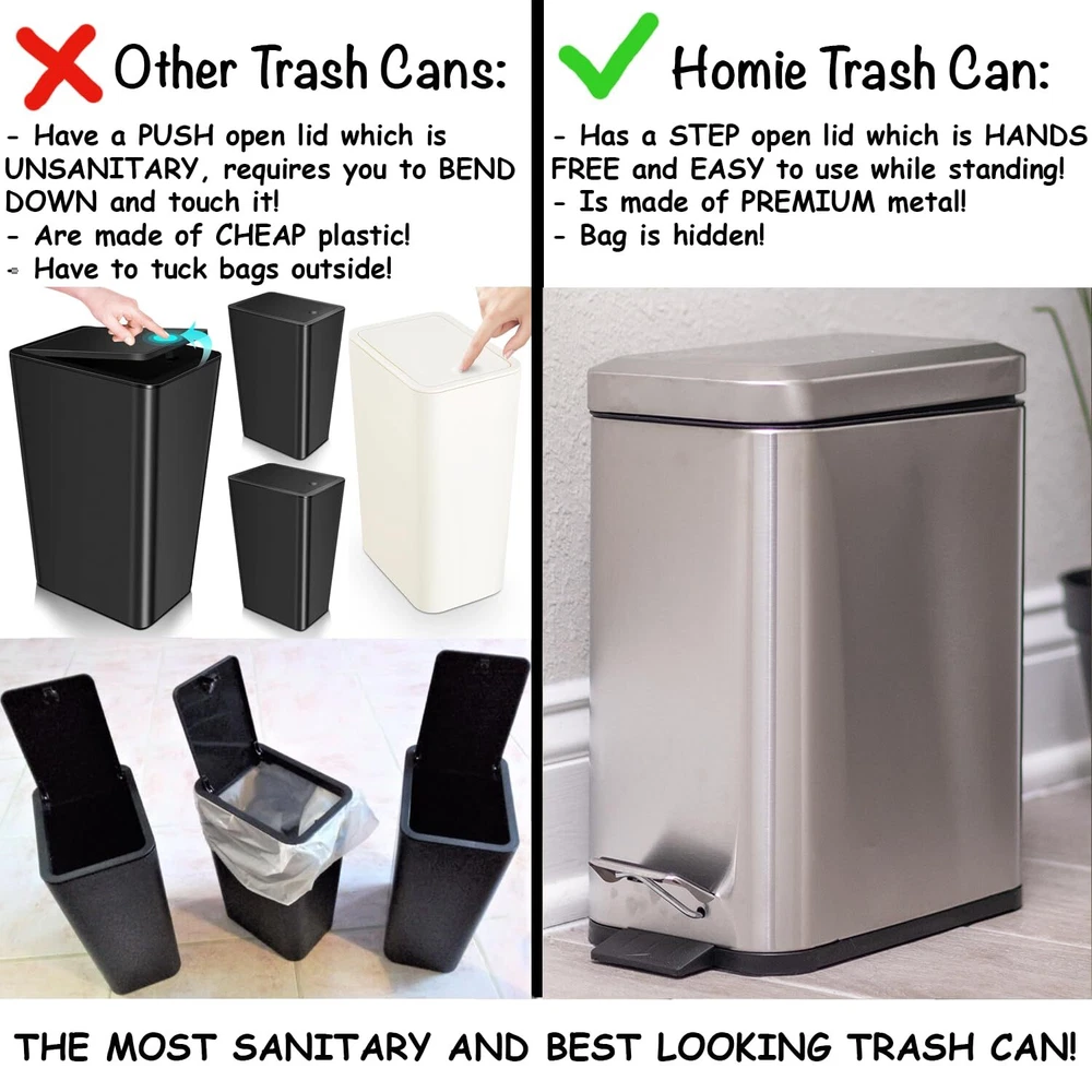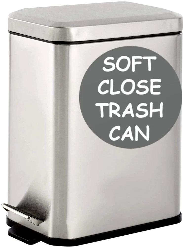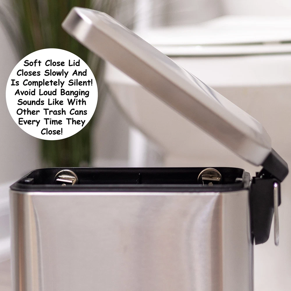 β π¦π’ππ§ πππ’π¦π πππ - This is the quietest small trash can you will use with no annoying noises. Gentle soft close lid makes no noise, simple and automatic slim garbage bin open and closing. β ππ‘π§π πππ π¦πππ£ ππππ£π¦ - No more having to keep fixing your bag because it has fallen into the silver trash can. Bags never fall into tiny bin, touch-less design, great for any room, office. β πͺπ’π₯ππ¦ πͺππ§π ππ‘π¬ πππ - Save more than $15 on not having to buy custom liner bags to fit your trash can. Use any old cheap bag lying around. Any bag snugly fits the bin and stays inside. β πππ¦π¬ π§π’ πππππ‘ - has ensured this trash can will take no time to clean. Just remove the liner, wash it, and throw it back in without harming the metal. Removable plastic liner simply washed, best mini silver dustbin or wastebasket β π¦π πππ πππ§ππ₯π’π’π π§π₯ππ¦π πππ‘ - Built with durability in mind, this bathroom trash can will last you for years. All of the material used a premium . Durable pedal and construction, 13" H x 12" L x 6" W, slim and skinny
