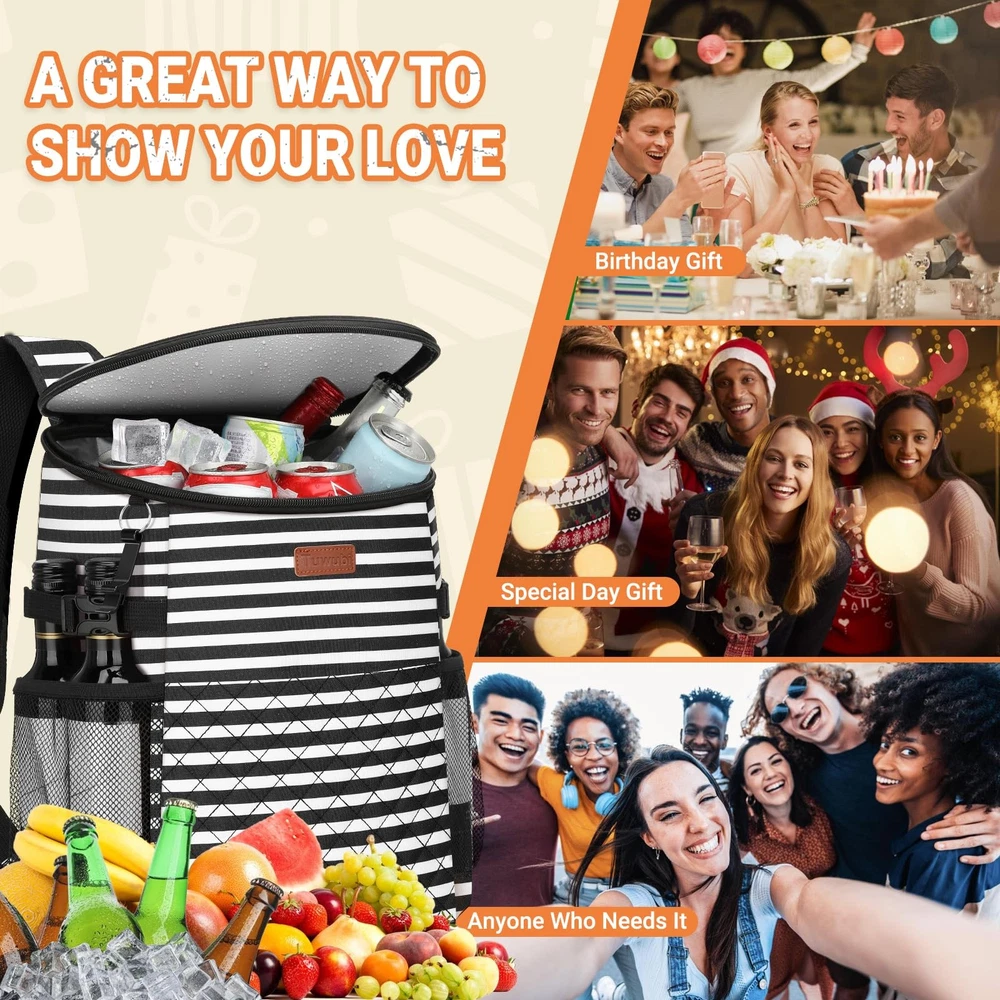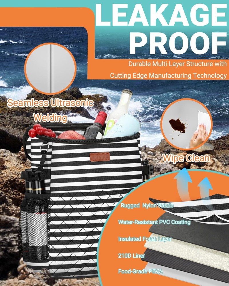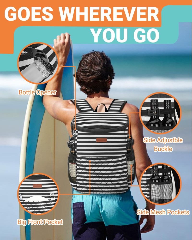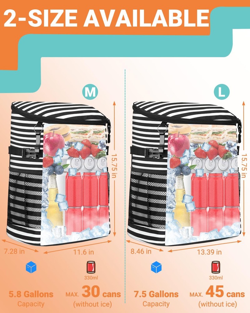 Soft Cooler Backpack 30 Cans/45 Cans, Coolers 30 Stripe Description Features: Multipurpose Storage: 30-Can capacity. Measuring L11.6" x W7.28" x H15.75" easily meets the need for 2-4 friends.This small cooler has 4 separate compartments: roomy zipper main compartment; 2 side mesh pockets for long bottle beers and wines, easy access front pocket, wide mouth opening, make it a spacious and organized adventure essential. EXCEPTIONAL INSULATION: Up to 20 hours insulation with this backpack cooler's 5 layer material--including thickened foam insulation and advanced food-grade PEVA seal. Designed to keep your beverages cool and food fresh throughout days of various outdoor activities like tournaments or concert, camping, fishing/boating/beach weekend, family trip, theme part trips. LEAK-PROOF AND RUGGED: this insulated backpack adopts high-tech seamless ultrasonic welding instead of traditional sewing, the interior PEVA lining with outter high quality oxford fabric material waterproof and easy to clean. 210D waterproof wear-resistant lining lowers the risk of tearing or coming apart.(The zipper is not leakproof, please be careful not to tip over when using it. ) HANDS FREE COOLER: This lightweight, backpack-style portable cooler has thicker padded and ventilated straps that leave both your arms free to grab your surfboard, fishing pole, or any other adventure gear. Perfect portable cooler for men and women. VERSATILE: Besides used as excellent cooler bag,it is also a perfect lightweight gear for backpack lunch box,camping backpack,picnic backpack, fishing backpack,beach cooler, great for hunting,trail,cycling and other outdoor activities. Suitable for both men and women. Product Details: Handling We will ship all orders within 1 business day of payment. Delivery We Do Not Ship Outside of the Continental US. Return Policy All items qualify for returns within 30 days of receipt. Buyer is responsible for return shipping on any item that is not damaged. Feedback We take our reputation seriously, we buy and sell online, so we understand the value of trust. If you are unsatisfied with your order, please contact us and we will work with you to resolve it to your satisfaction.