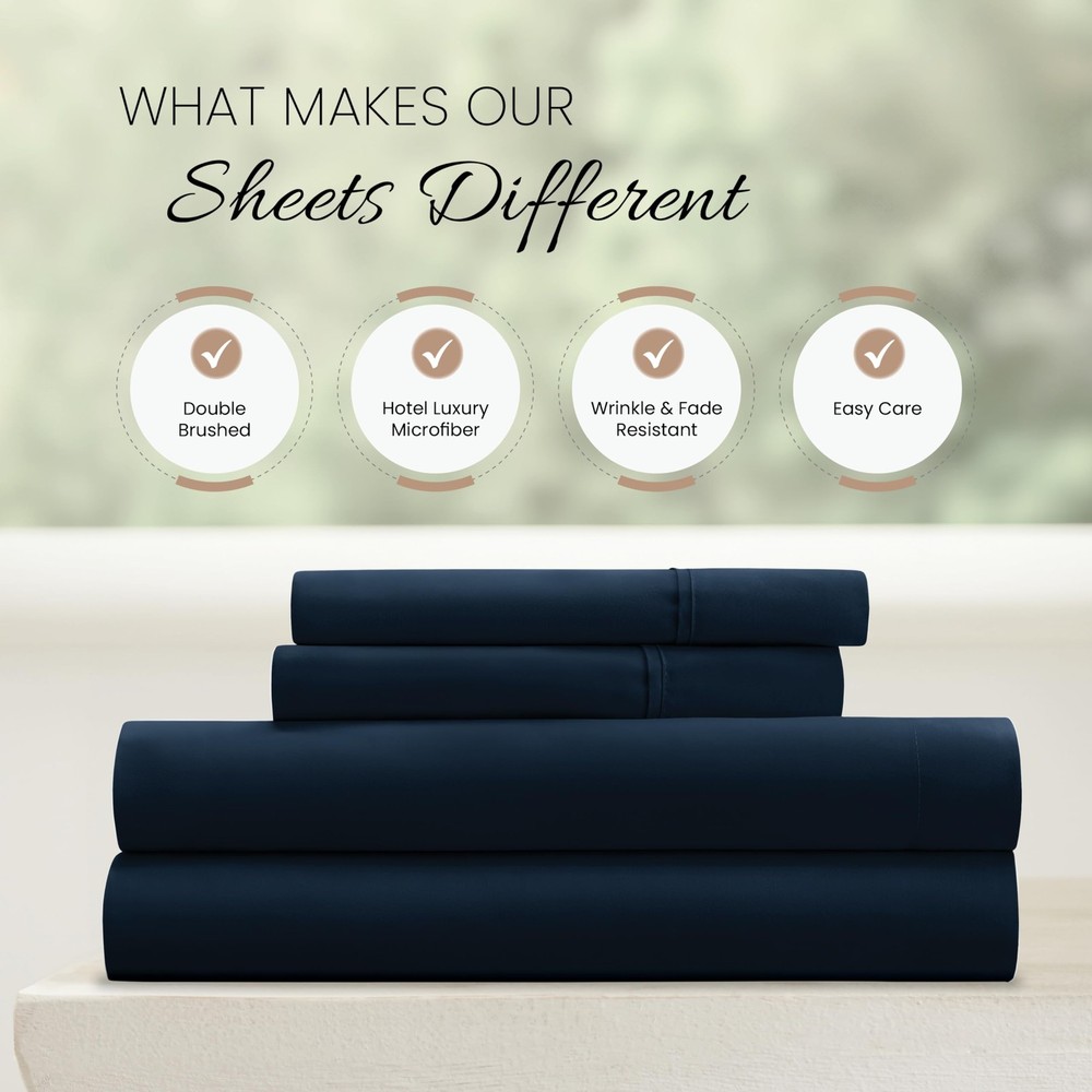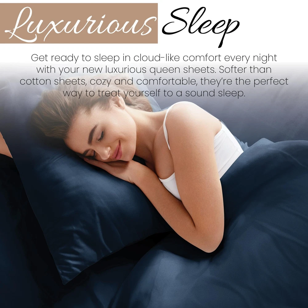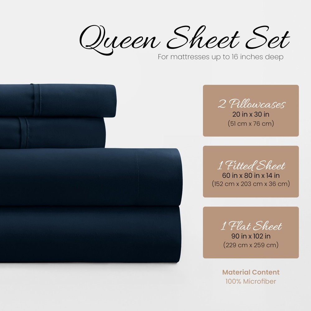 ULTIMATE COMFORT: Get ready to sleep soundly every night with your new luxurious queen bed sheets. Soft, cozy and comfortable, they're the perfect way to treat yourself to the ultimate sleep experience. EASY SHEET CHANGES: Finding sheets that fit deep beds can be frustrating, but not with our deep pocket sheets. Our design allows for your new sheets to easily fit up to 16” deep beds. This set includes a fitted and flat sheet, and two pillowcases. LOW MAINTENANCE BEDDING: Our bed sheets are machine washable, making it easy to keep them looking and feeling their best, wash after wash. Say goodbye to the hassle of hand washing or sending your bedding to the cleaners. MADE TO LAST: Pets, kids, and family life can take a hard toll on sheets and other bedding, but our sheets are made to last. Expert stitching and seams ensure that your queen sheet set will stand up to wear and tear for years to come. NO MORE BORING BED SHEETS: Our navy bed sheets are sure to add a touch of elegance and brighten up any bedroom. With five sizes and nineteen color options to choose from, you're sure to find a match for your décor.