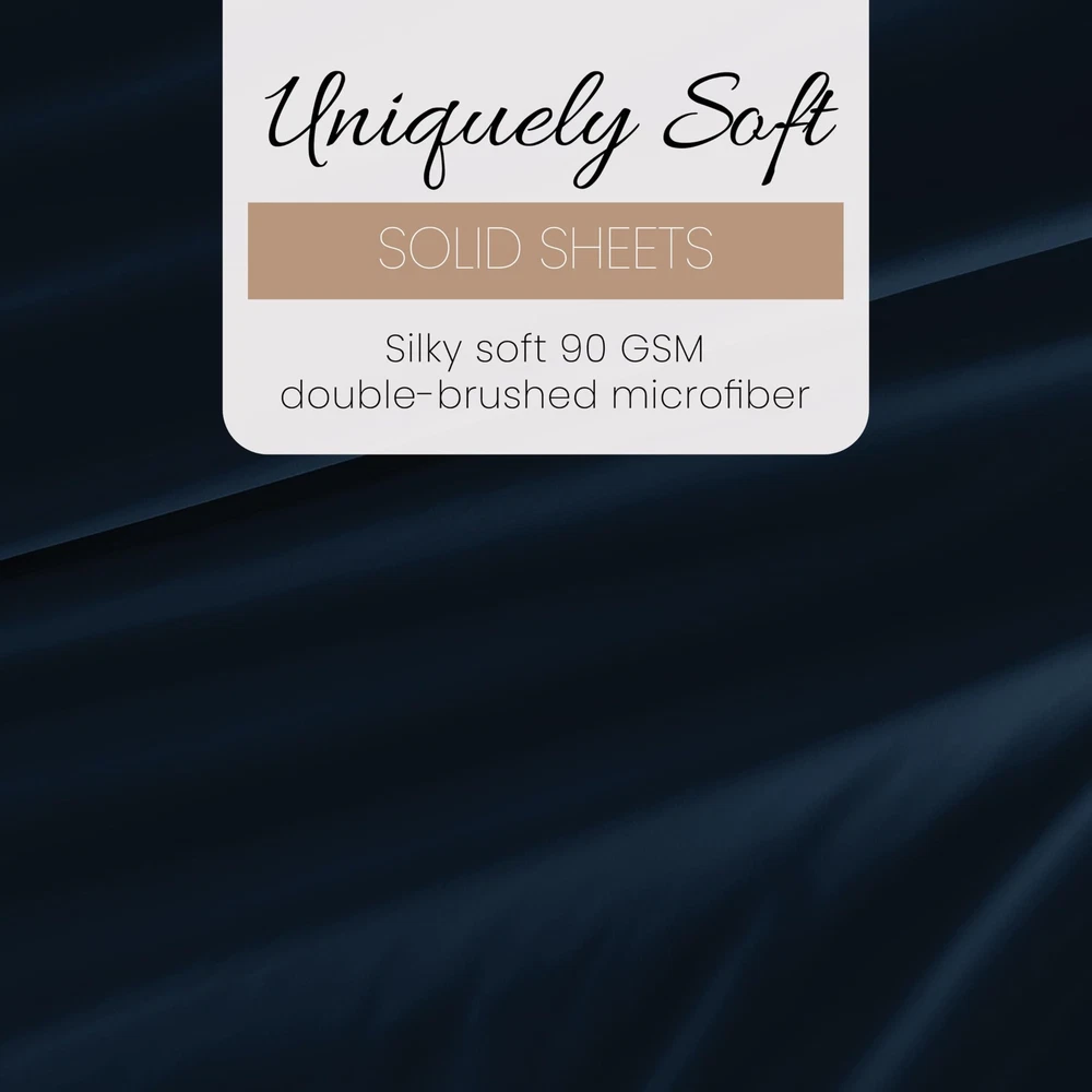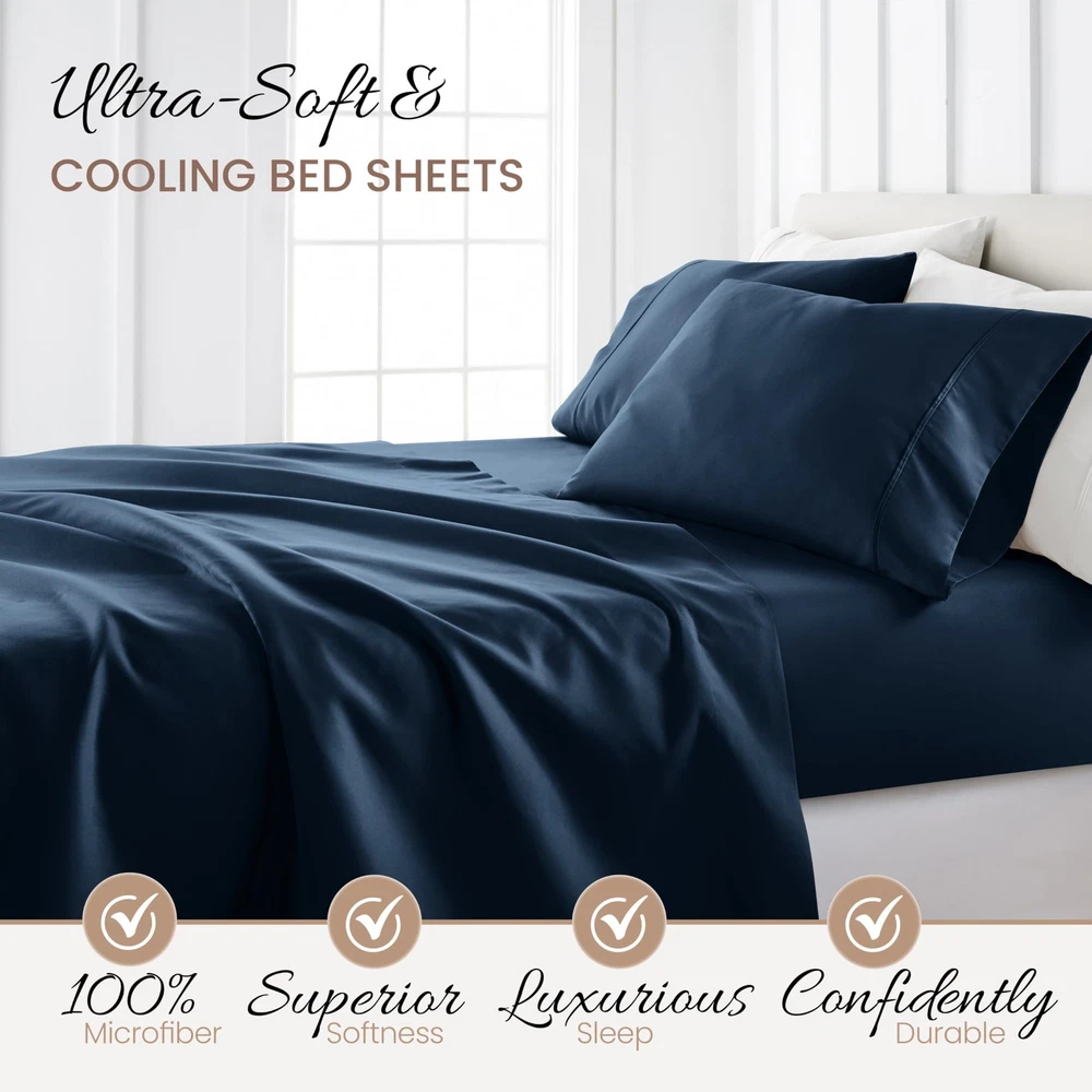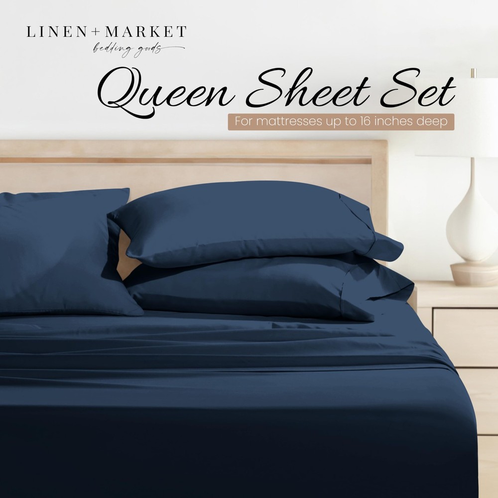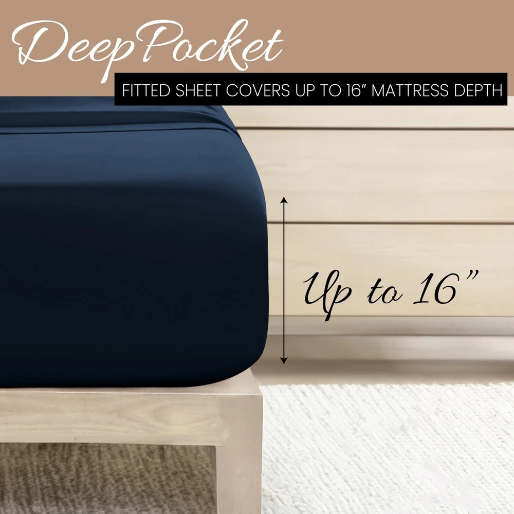 ULTIMATE COMFORT: Get ready to sleep soundly every night with your new luxurious queen bed sheets. Soft, cozy and comfortable, they're the perfect way to treat yourself to the ultimate sleep experience. EASY SHEET CHANGES: Finding sheets that fit deep beds can be frustrating, but not with our deep pocket sheets. Our design allows for your new sheets to easily fit up to 16” deep beds. This set includes a fitted and flat sheet, and two pillowcases. LOW MAINTENANCE BEDDING: Our bed sheets are machine washable, making it easy to keep them looking and feeling their best, wash after wash. Say goodbye to the hassle of hand washing or sending your bedding to the cleaners. MADE TO LAST: Pets, kids, and family life can take a hard toll on sheets and other bedding, but our sheets are made to last. Expert stitching and seams ensure that your queen sheet set will stand up to wear and tear for years to come. NO MORE BORING BED SHEETS: Our navy bed sheets are sure to add a touch of elegance and brighten up any bedroom. With five sizes and nineteen color options to choose from, you're sure to find a match for your décor.