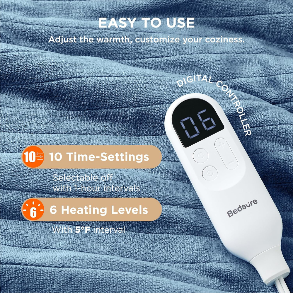 Fast Shipping Great Customer Support Satisfaction Guaranteed DESCRIPTION Shipping Shipping Shipping All domestic packages are shipped for Free (Unless other shipping method was selected during the checkout) Most items ship and arrive much sooner than the estimate delivery date. Usually within 2-3 days from payment. However, we have longer estimates to compensate for the occasional delay or supply chain breakdown. We do not accept P.O. BOXES - PLEASE PROVIDE A PHYSICAL ADDRESS Return Return Return In the event that you would like to return your purchase, we allow returns that are processed within the defined return date (the return date is to be found in the return policy/shipping and handling section) Please contact us for a return authorization and the return shipping address. Payment Payment Payment PayPal is our preferred method of payments it's the quickest, easiest and most secure way to pay for your goods or services online. PayPal offers buyer and seller protection should there be a problem. If you do not have a PayPal account, to get started and buy your first item with us is very easy. Simply click on the 'Buy It Now' button and follow the eBay checkout steps. Select PayPal as the payment method you then will be given the chance to enter your card details in to PayPal's secure checkout in order to pay for your order. Once the payment has been made, you will then be given the opportunity to make your own PayPal account to make paying for your items in the future very easy. Should there be a problem with payment please do let us know. Feedback Feedback Feedback Customer satisfaction is very important to us. If you have any problem with your order,please contact us and we will do our best to make you satisfied, please do not leave a negative feedback before we resolve your problem. We guarantee that your issue will be solved quickly. As long as you are happy with your purchase of , please leave us a positive feedback. Your feedback is very important to us it affects our search placement on eBay. We will leave a positive feedback for you in return automatically once we receive your feedback. Contact Us Contact Us Contact Us If you have any queries, please contact us via ebay. We usually respond within 24 hours on weekdays. Thank you for visiting our ebay store! Softness & Enhanced Durability: The 220 GSM flannel top and the 200 GSM premium sherpa both provide an exceptionally soft touch on each side. Neat stitching ensures stronger seams and enhanced durability. It is machine washable and uses a unique dyeing technique to prevent fading Customizable Warmth: Featuring fast and consistent heating, this heated blanket twin offers 6 heating levels and 10 time-settings for customizable coziness. Powered by advanced heating wire technology, it can precisely control temperature, ensuring safer warmth Versatile: Enjoy the extra warmth you need with this twin electric blanket while watching a movie on the sofa, adding it to your bed for a good night’s sleep, or using it as a regular blanket Safer & More Reliable: Conducted in Bedsure Intertek-Recognized Satellite Lab, 74 safety tests with standards surpassing UL ensure safer performance. This electric blanket twin is ETL and FCC certified, and its default 8-hour auto shut-off prevents it from overheating so that you can enjoy warmth with complete peace of mind Giftable: This heating blanket adds a stylish touch to your decor. It is available in multiple colors and sizes, making it the perfect gift for special occasions Energy-Saving: Designed for standard 120V AC wall outlets at 60Hz, our electric blanket has a power rating of 110W, consuming about one-thirtieth the energy of traditional heaters. Enjoy cozy warmth while saving on electricity costs Heated Twin Electric Blanket - Soft Flannel, 10 Timed Settings, 62x84 inches Click here to see description Fast Shipping Great Customer Support Satisfaction Guaranteed DESCRIPTION Shipping All domestic packages are shipped for Free (Unless other shipping method was selected during the checkout) We ship within two business days of payment, usually sooner Standard FREE shipping takes between 3-5 business days Expedited shipping takes between 2-3 business days Overnight shipping takes between 1-2 business days We do not accept P.O. BOXES - PLEASE PROVIDE A PHYSICAL ADDRESS We Ship Globally using ebay's GSP, the item is sent to a logistic center in KY and shipped from there to the rest of the world. International customers are responsible for all duties and taxes Contact your local authority for questions related to the amount of duties or taxes you will be responsible for Return In the event that you would like to return your purchase, we allow returns that are processed within the defined return date (the return date is to be found in the return policy/shipping and handling section) Please contact us for a return authorization and the return shipping address. Please contact us for a Return Merchandise Authorization (RMA) number. We advise you to use a reputable carrier service when returning your goods. Please pack all returns appropriately. We ship globally Via eBay's global shipping program (GSP). Thus we don't cover returns for items shipped globally. Buyers returning such items will be refunded ONLY for the item's cost and not for the shipping. please check the Voltage information and make sure it matches the one in your country. In case it's not stated in the description, do ask us. Payment PayPal is our preferred method of payments it's the quickest, easiest and most secure way to pay for your goods or services online. PayPal offers buyer and seller protection should there be a problem. If you do not have a PayPal account, to get started and buy your first item with us is very easy. Simply click on the 'Buy It Now' button and follow the eBay checkout steps. Select PayPal as the payment method you then will be given the chance to enter your card details in to PayPal's secure checkout in order 
