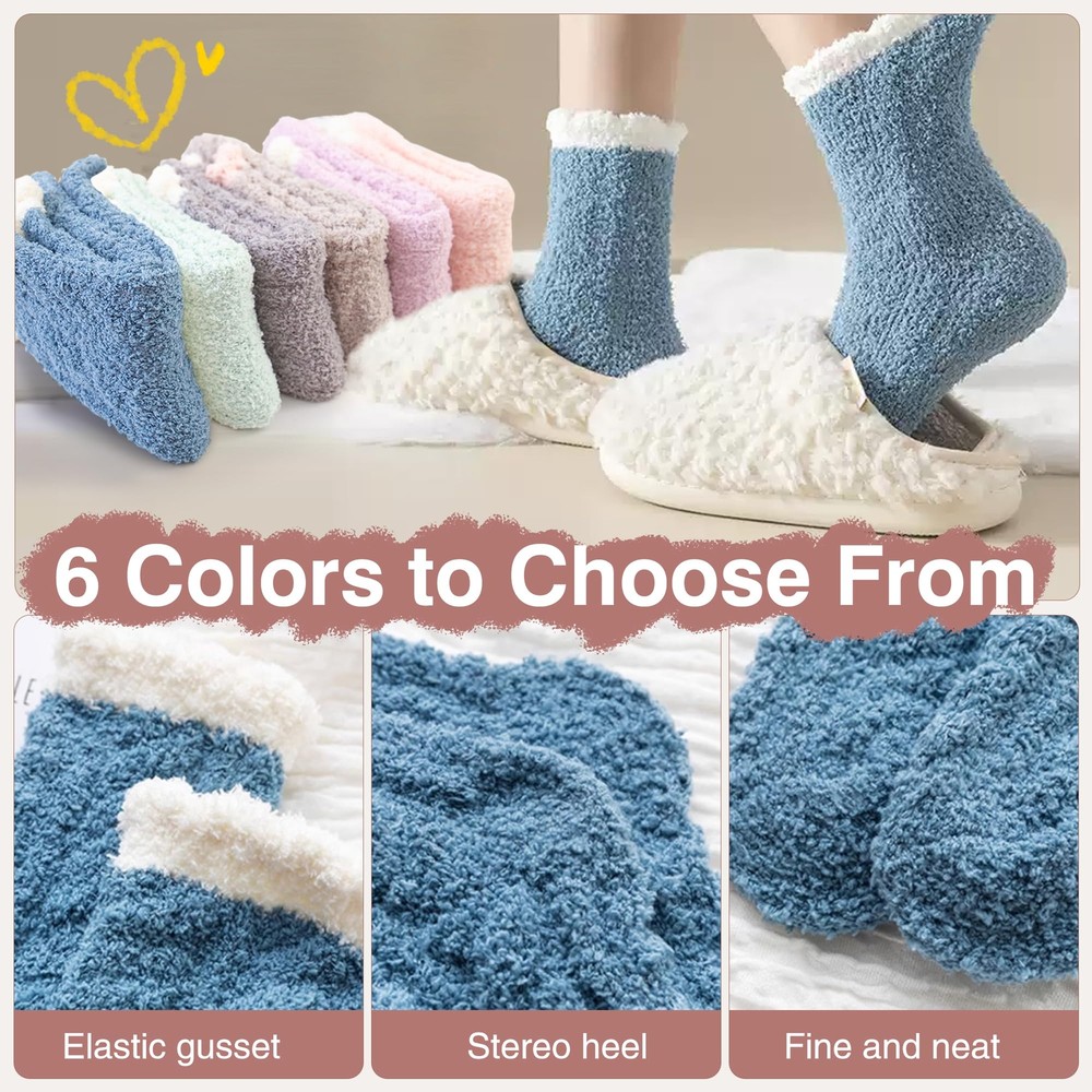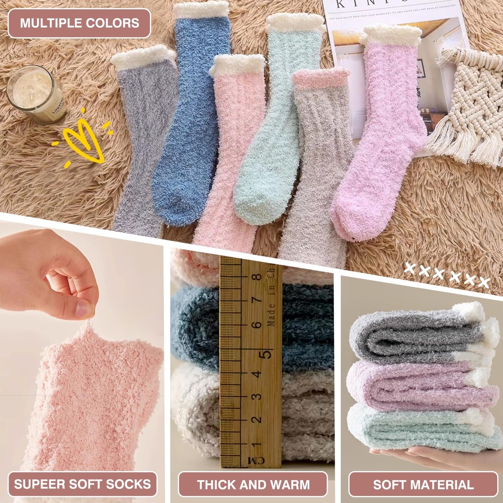Soft Fuzzy Socks for Women - Made from warm and high quality plush material , these comfy cozy socks offer a soft touch to keep your feet warm and comfortable. Free Size Slipper Socks - These high-elastic womens fluffy socks fit US sizes 5-10 and come in various colors, making them perfect for most women and girls. Warm Sleeping Socks - The ideal thickness makes these comfy fluffy socks great for sleeping, keeping your feet warm for a cozy night’s rest. Winter Women Socks - This pack includes 6 solid color slipper socks (pink, green, purple, brown, gray, blue), perfect for daily wear at home or out.Their extreme softness will make you never want to take them off, warm house socks choice. Fantastic Gift - This stylish and cozy pair of winter socks makes a thoughtful, cozy gift for your wife, daughter, girlfriend, friend, or colleague, perfect for occasions like Thanksgiving, Christmas, birthdays, Valentine's Day, and Mother's Day.
