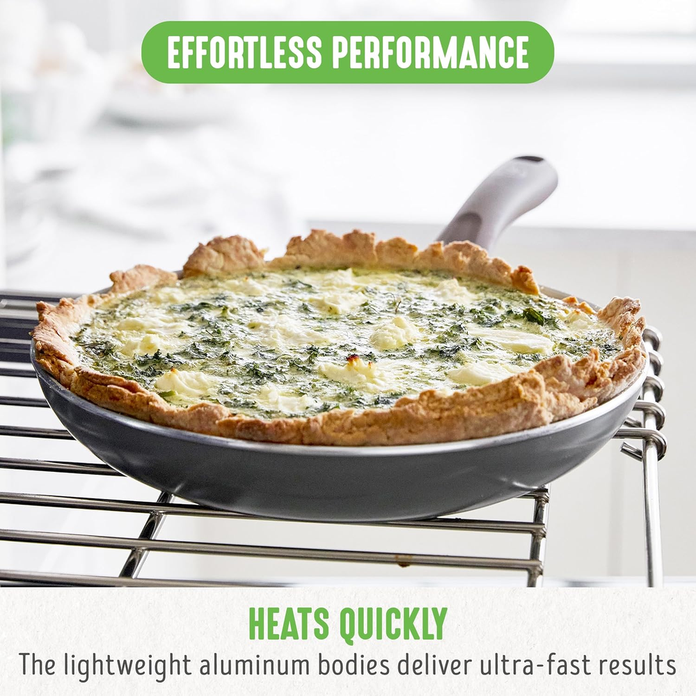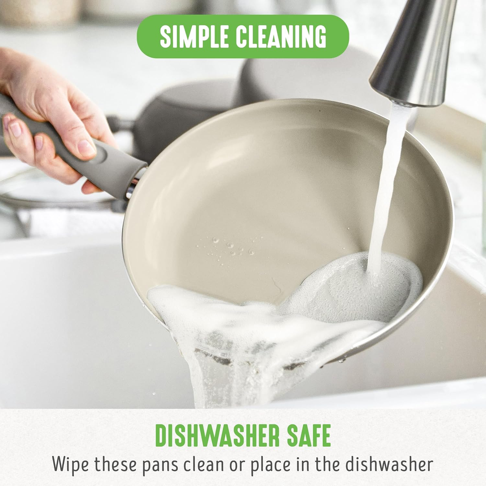 HEALTHY CERAMIC NONSTICK: Our healthy and easy-to-clean ceramic nonstick coating is derived from sand and delivers effortless release with quick cleanup TOXIN-FREE: Our coating is free of PFAS, PFOA, lead, and cadmium so you can make every meal healthier STAY-COOL HANDLES: Soft Grip Bakelite handles are designed to stay cool on the stovetop for maximum comfort WOBBLE-FREE BASES: Each frypan is reinforced with a wobble-free base for extra strength and even heating EASY TO CLEAN: Dishwasher safe, but most messes wipe away EFFORTLESS PERFORMANCE: Delivers on all stovetops, except induction and oven safe up to 350˚F MADE WITH RECYCLED MATERIALS: Cookware vessels (excluding handles) are made from a minimum of 65% recycled materials. Designed for effortless performance and cleanup, this frying pan features our diamond-infused Sandstone nonstick coating, which is free of PFAS, PFOA, lead, and cadmium. GreenLife’s healthy ceramic nonstick is not stuck in the past—our ceramic nonstick starts with sand and creates 60% less CO2 emissions during the curing phase than traditional coatings. This pan is also crafted with recycled materials because we want everyone to cook healthy for years to come. Finished in vibrant colors, this pan is outfitted with a stay-cool handle to keep your cooking comfortable.