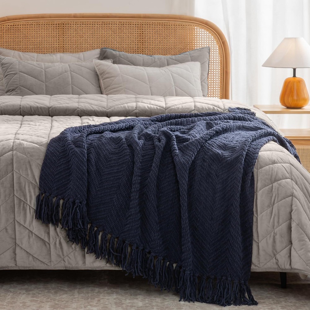 Unique Boho Design - Introducing our exquisite boho chenille knit throw blanket, featuring a mesmerizing boho design that is truly one-of-a-kind. The intricate herringbone patterns and well-thought colors come together in perfect harmony, creating a stunning visual masterpiece that will effortlessly enhance the aesthetics of any space. Soft & Comfortable - Our cozy knitted throw blanket is made of high-quality chenille fabric, which makes it super soft yet lightweight. With premium knitting and stitching craft, this textured throw blanket is also warm but breathable. You can use it throughout the year to enjoy warmth and softness without getting sweaty. Versatile & All-Season Use - This knitted 50x60 throw blanket can provide the perfect companion for cozy evenings on the sofa or bed, snuggling up while watching your favorite shows or enjoying a good book. Its lightweight design makes it an ideal travel companion, whether you're embarking on outdoor adventures or simply heading on a road trip. Built to Last - Made from high-quality, fade-resistant fabrics and impeccable craftsmanship, our navy blue throw blanket boasts superior durability, ensuring vibrant hues that stay vivid even after countless washes. Additionally. This soft chenille throw blanket is certified to Oeko-tex standard 100, so it's safe for you and your family to use in daily life. Easycare & Giftable - Our throw blanket for couch is super easy to clean, simply machine wash on a gentle cycle in cold water, then tumble dry low. Our decorative throw blankets also come elegantly packaged, ready to impress and delight your loved ones. It's the perfect gift for housewarmings, birthdays & holidays.