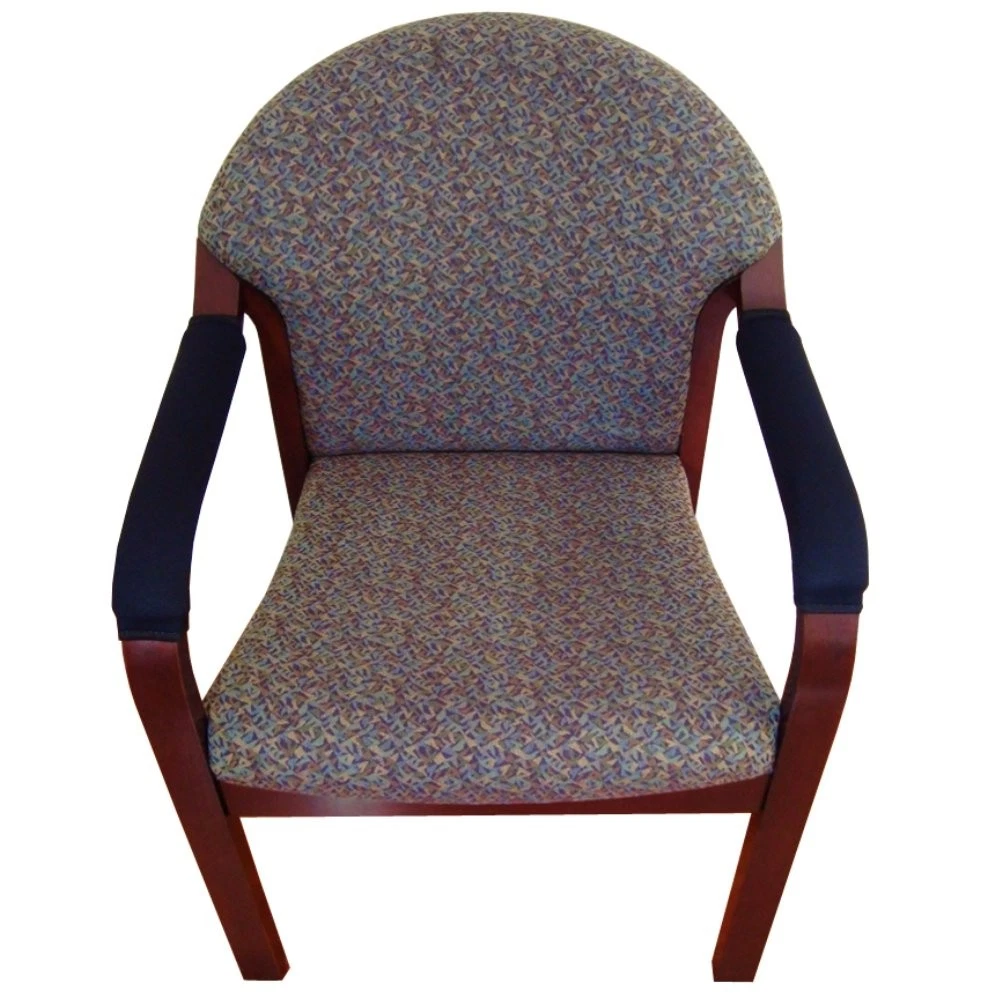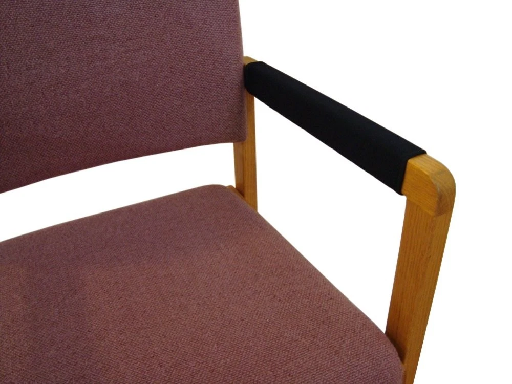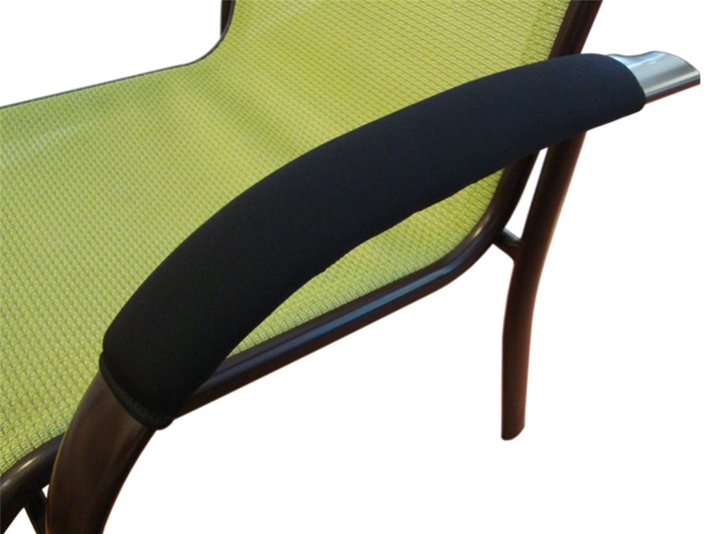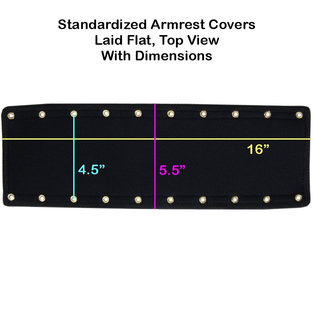 Transform your existing chair armrests with a pair of soft neoprene armrest covers. This product adds cushioning, covers damaged armrests, protects armrests, and has a professional built-in look. These armrest covers are used for office chairs, wheelchairs, mobility scooters, lawn chairs, patio furniture, guest chairs, etc. Standardized to fit most loop, rail, and hook style chair armrests. The durable soft black neoprene stretches to fit around armrests of many shapes and sizes. The outer surface is bonded with a layer of soft and durable black nylon. This soft breathable surface material is not sticky like vinyl or leather, and yet it can be hand washed. This product covers an armrest area up to 16" Long and up to 4" Wide, please see the product pictures for more detail. These covers can also be folded, with the grommets aligned, to cover shorter armrests down to 8" Long, or to create the effect of double neoprene cushioning. The universal tether attachment system is with most chairs. The brass grommets lace up underneath your armrests like a shoe. Extra long sets of 100" laces are , do not allow children to play with cords or laces, any excess cord or lace should be trimmed. Optional 5/8" thick high resiliency foam inserts are . The foam inserts fit under the armrest covers for maximum cushioning. Pricing is per complete pair of chair armrest covers (right and left). Specify a quantity of 1 for 1 set.. 2 for 2 sets.. etc. Made in the USA. Neoprene Chair Armrest Covers: Excellent cushioning, cover damaged armrests, protect armrests, professional built-in look. The soft neoprene stretches for a perfect fit plus 5/8 inch thick high resiliency foam inserts for maximum armrest cushioning. Standardized to fit railing and loop style armrests. Offered only in pairs, not singles. Covers armrest surface area up to 16 inches long and up to 4 inches wide. Made in the USA. Attaches to armrests via grommets and cord, laces up underneath armrests like a shoe. Laces are . Simple installation.