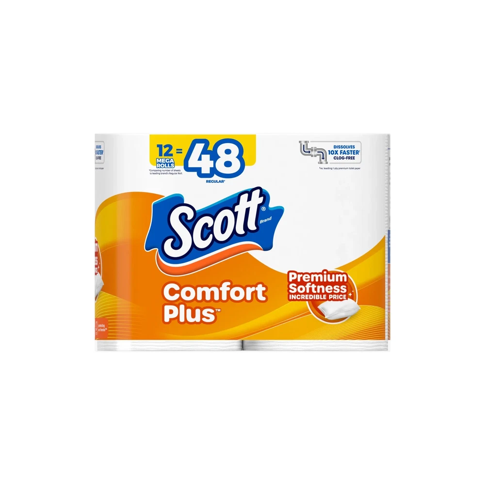 Discover premium softness at an incredible price with Scott ComfortPlus toilet paper rolls. Offering everyday comfort plus reliable strength, this bath tissue is 3x thicker and 4x stronger than the leading value brand. Our toilet tissue combines just the right amount of softness and strength by featuring thick and plush sheets for a comforting clean. These toilet paper rolls are also trusted for flushability, as Scott ComfortPlus is septic-safe, sewer-safe, clog-free, and dissolves 10x faster*. With Scott ComfortPlus 1-ply toilet paper, you get 12 Mega Rolls of 310 sheets per roll. Plus, Scott toilet paper features cores made from 100% recycled paper. Get more with Scott and order Scott ComfortPlus in bulk online! (*vs national brand soft & strong) WHAT’S INCLUDED — 12 Mega Rolls of Scott ComfortPlus Toilet Paper, 1-ply, 310 sheets per roll, 392.40 square feet total (12 mega rolls = 48 regular rolls) COMFORT’S NOT JUST A NAME — We made Scott ComfortPlus 3x thicker than the leading value brand so you can have extra comfort every time SOFTNESS + STRENGTH — Yes, Scott ComfortPlus is soft toilet paper, but we don’t stop there. Our bath tissue is also 4x stronger than the leading value brand GENTLE ON FLUSHING — Don’t sacrifice your plumbing for comfort. This bath tissue is made with clog-free technology and dissolves 10x faster than the national brand ultra soft & strong CARE FOR OUR PLANET — At Scott, we care about our planet and that’s why we use cores made from 100% recycled paper Scott packaging and product may vary from images shown