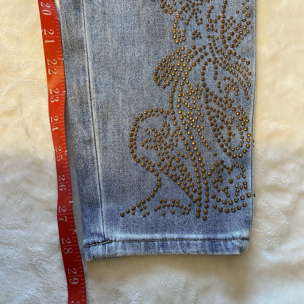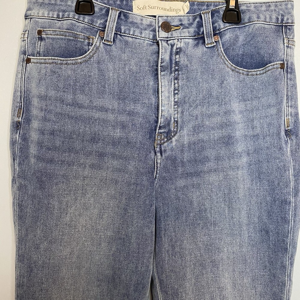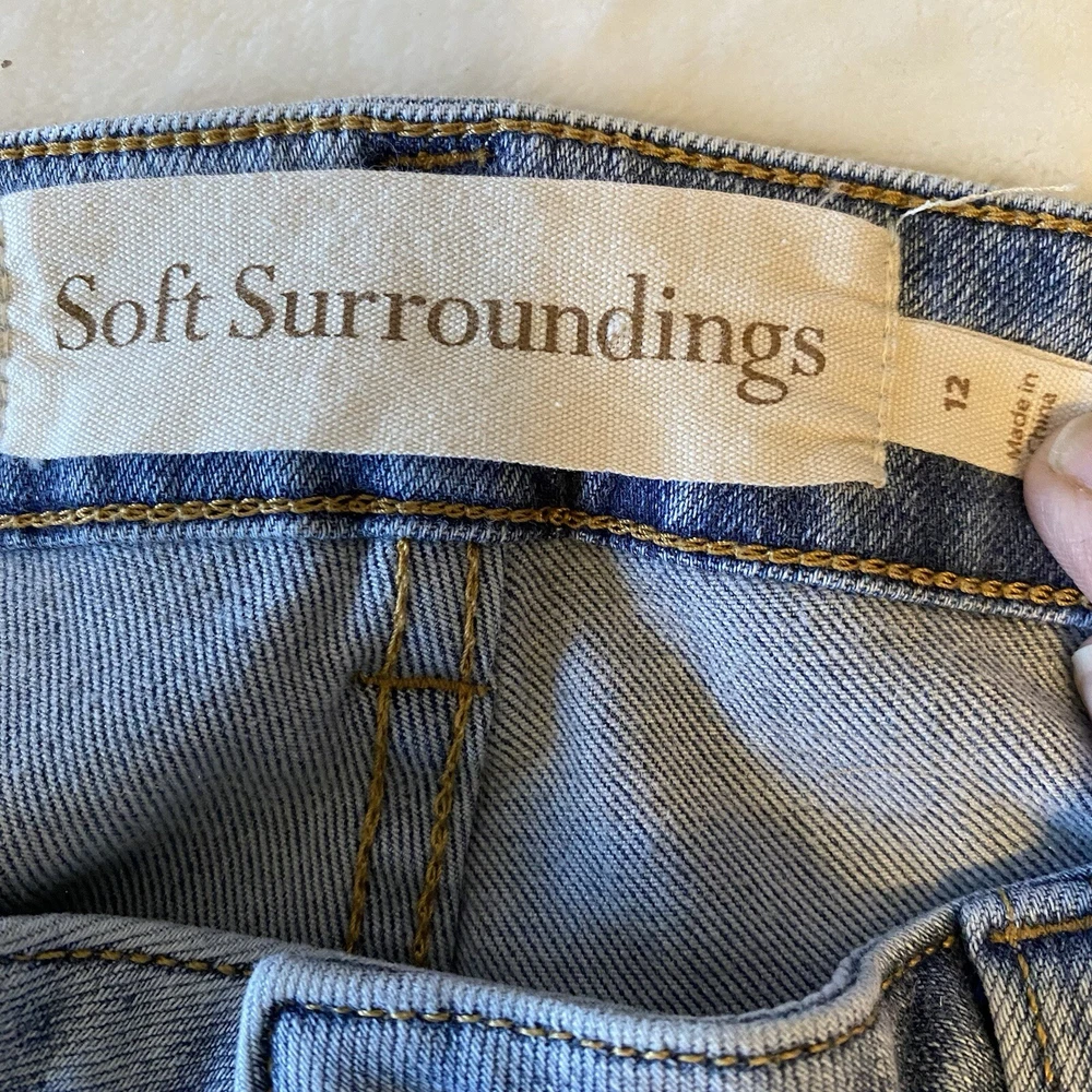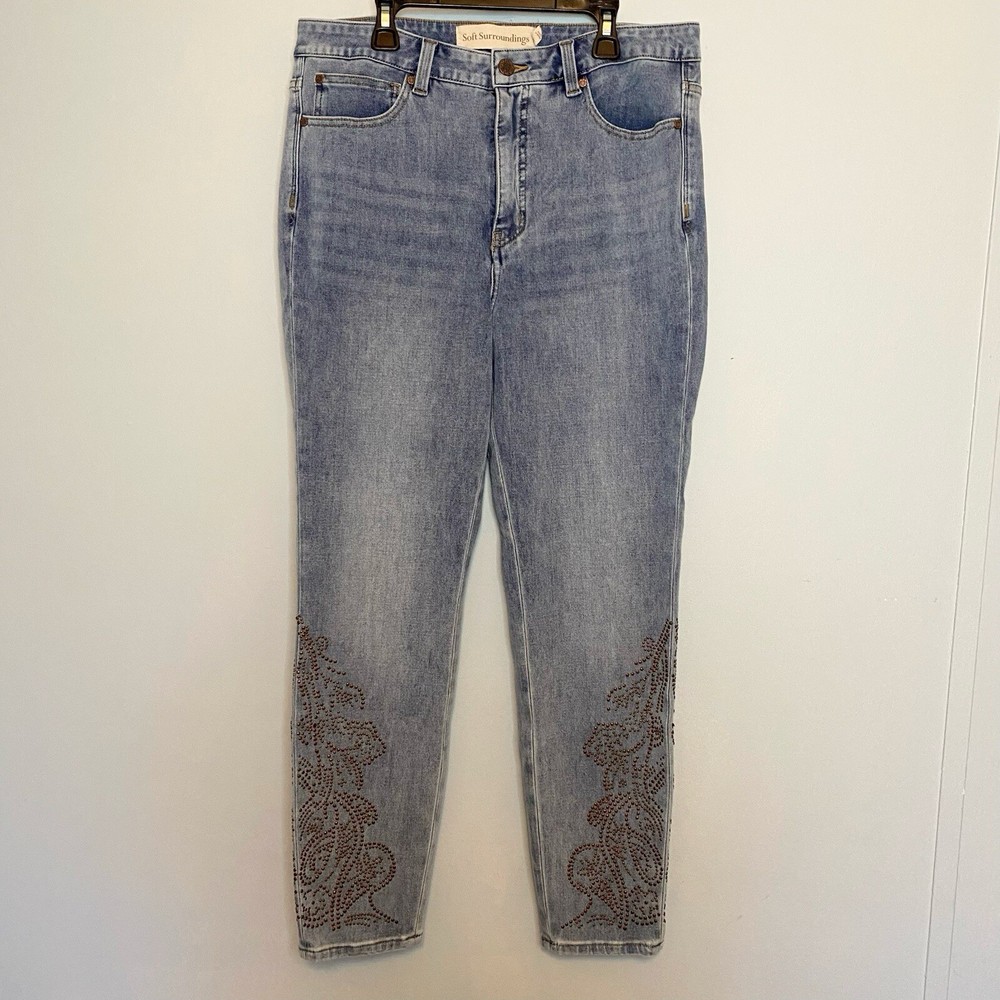 Soft surroundings stone washed bronze studded denim jeans sz 12 Excellent condition High rise Great comfort stretch Button, zip closure Dressy bronze studded detail on lower leg Size 12 Measurements flat Waist 16.5” Rise 12” Inseam 28.5” Smoke free Fast shipping