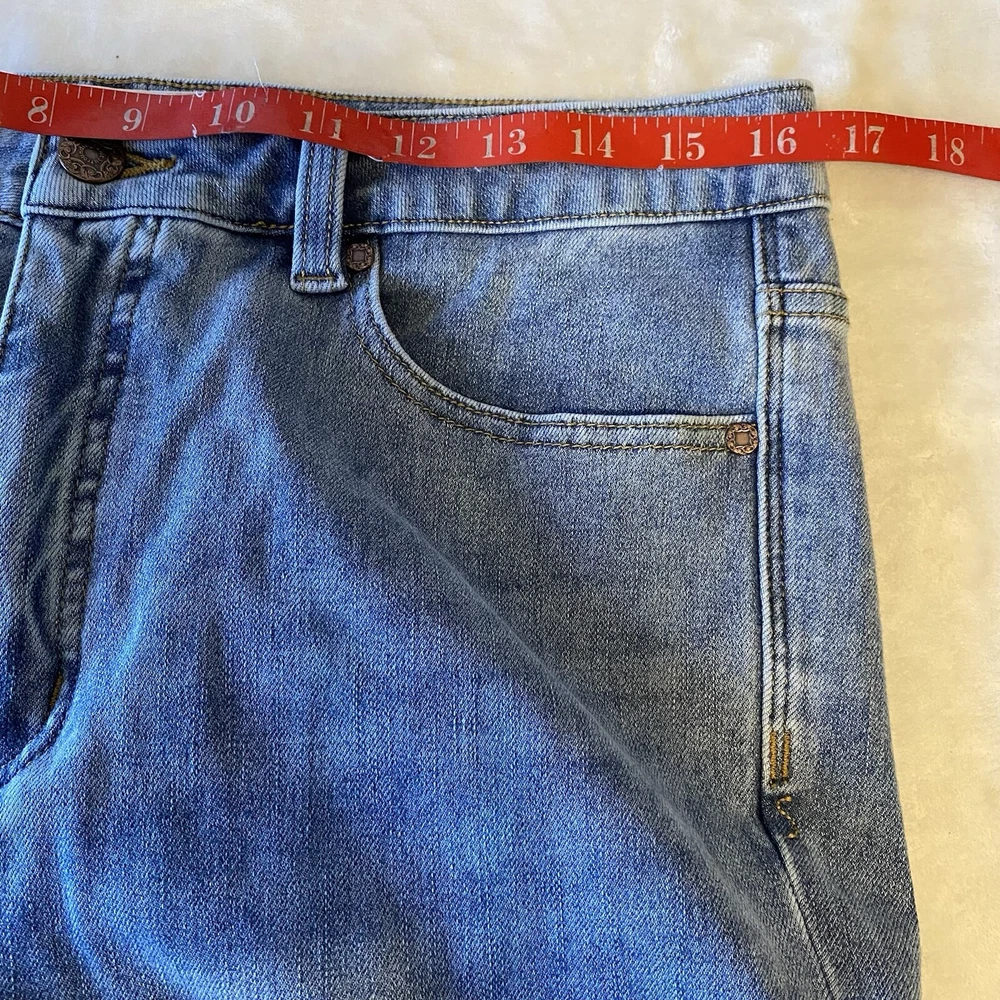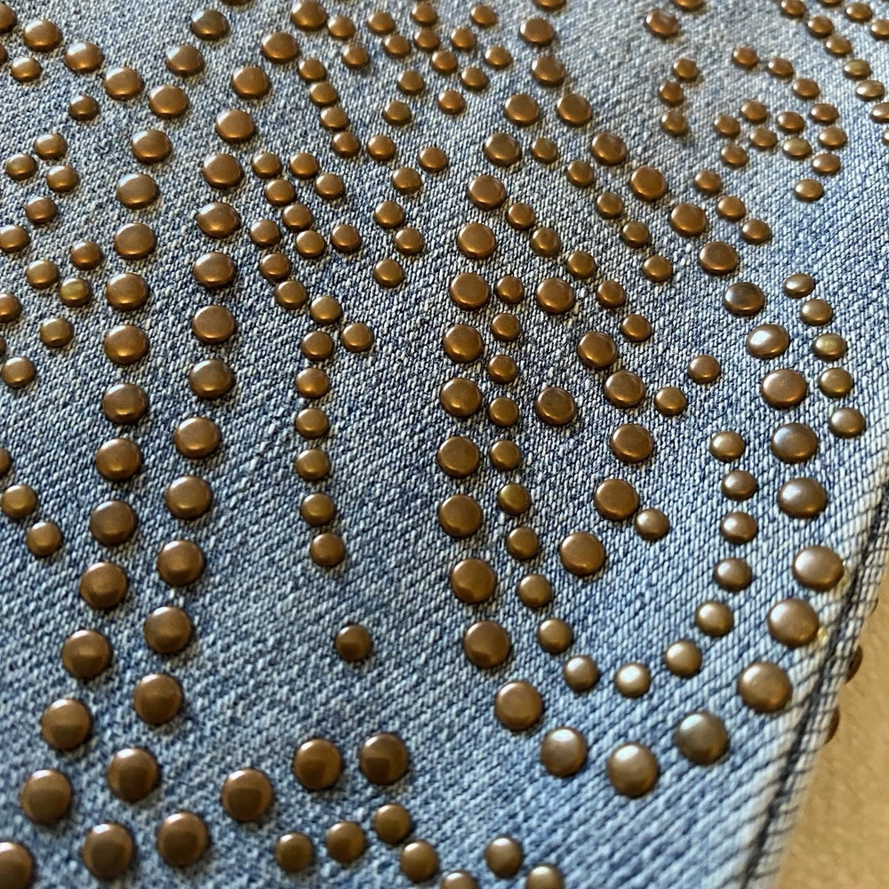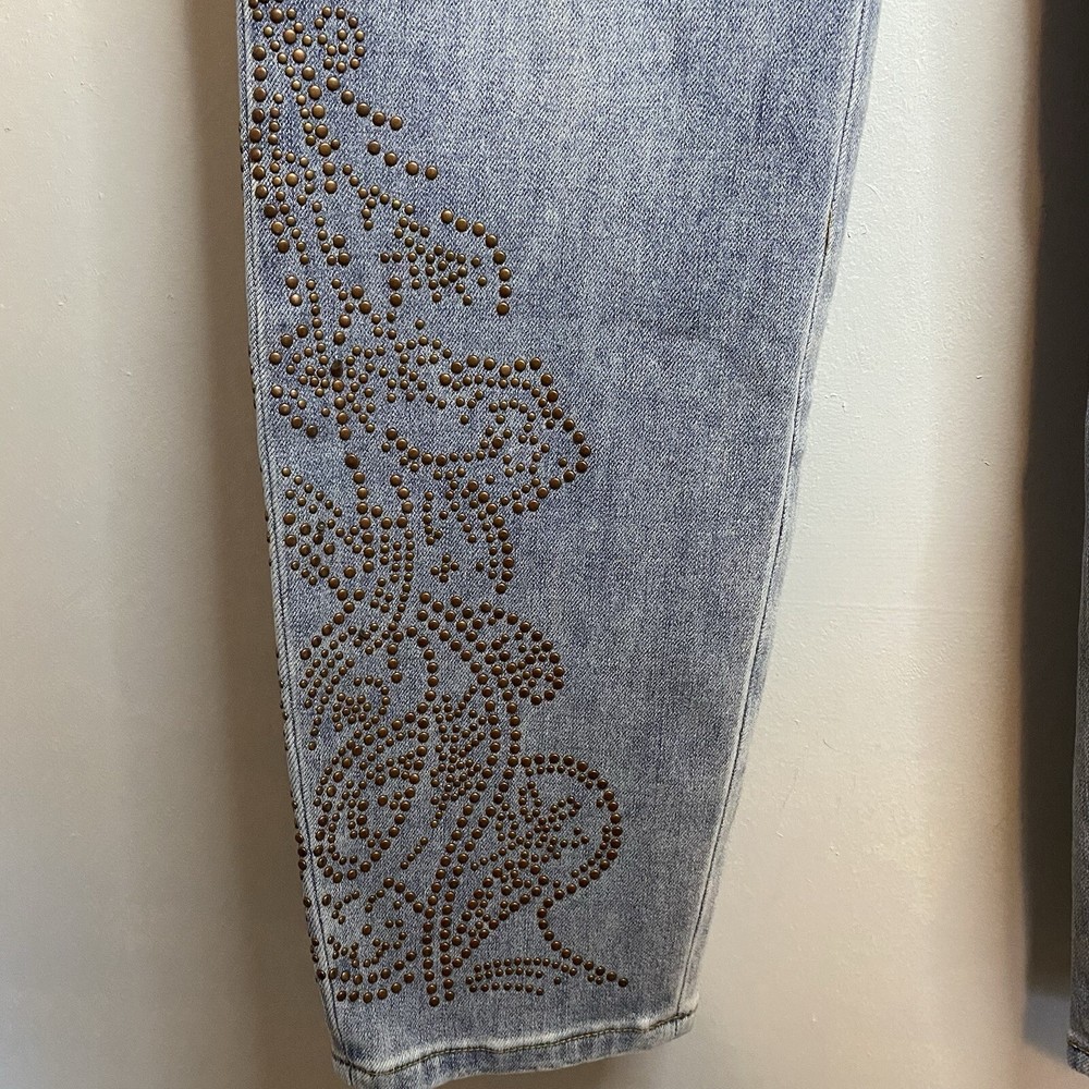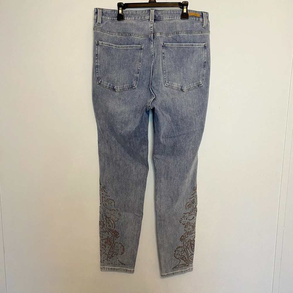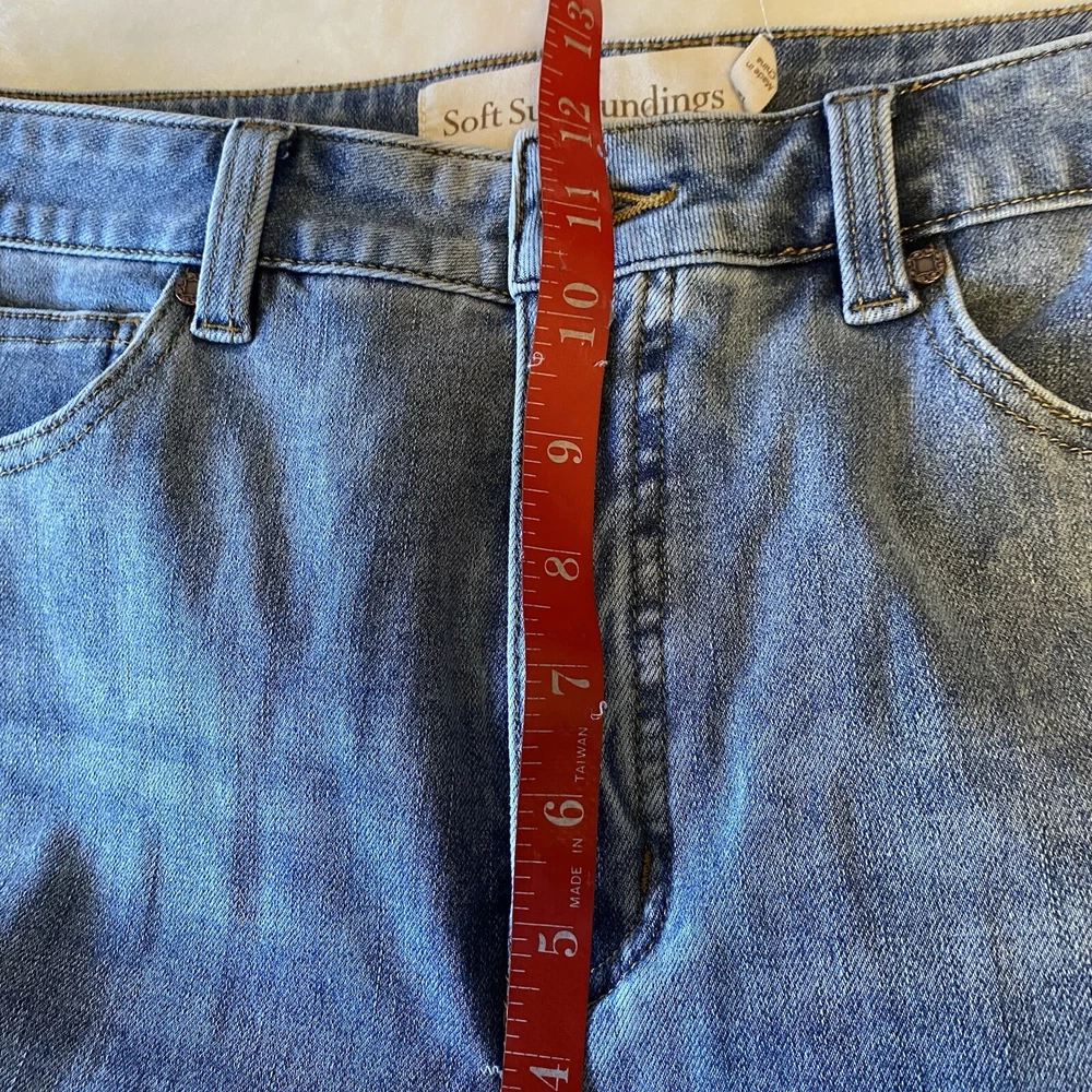 Soft surroundings stone washed bronze studded denim jeans sz 12 Excellent condition High rise Great comfort stretch Button, zip closure Dressy bronze studded detail on lower leg Size 12 Measurements flat Waist 16.5” Rise 12” Inseam 28.5” Smoke free Fast shipping