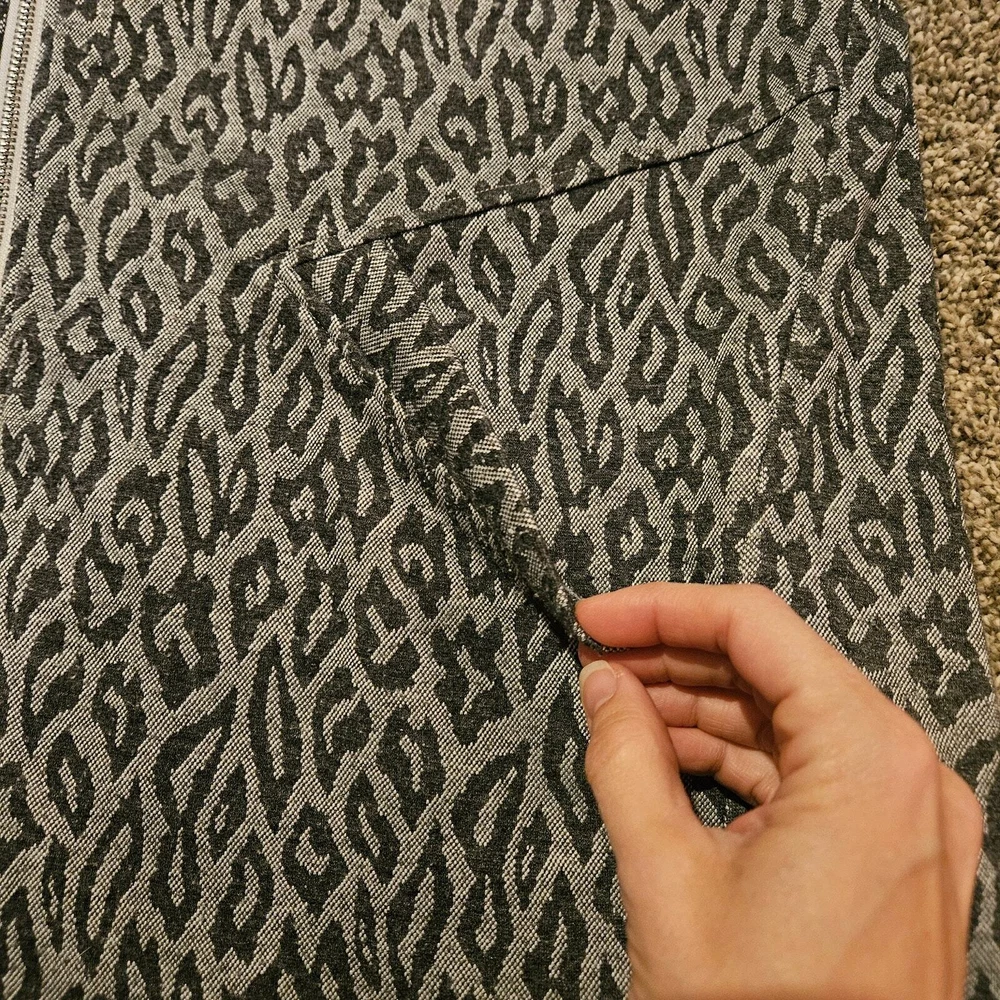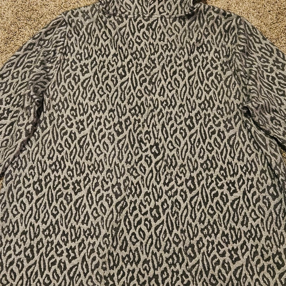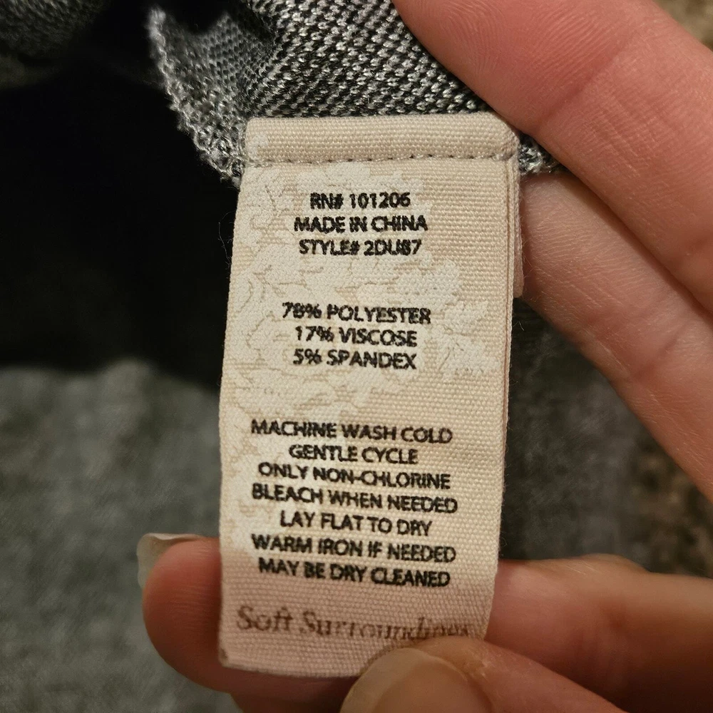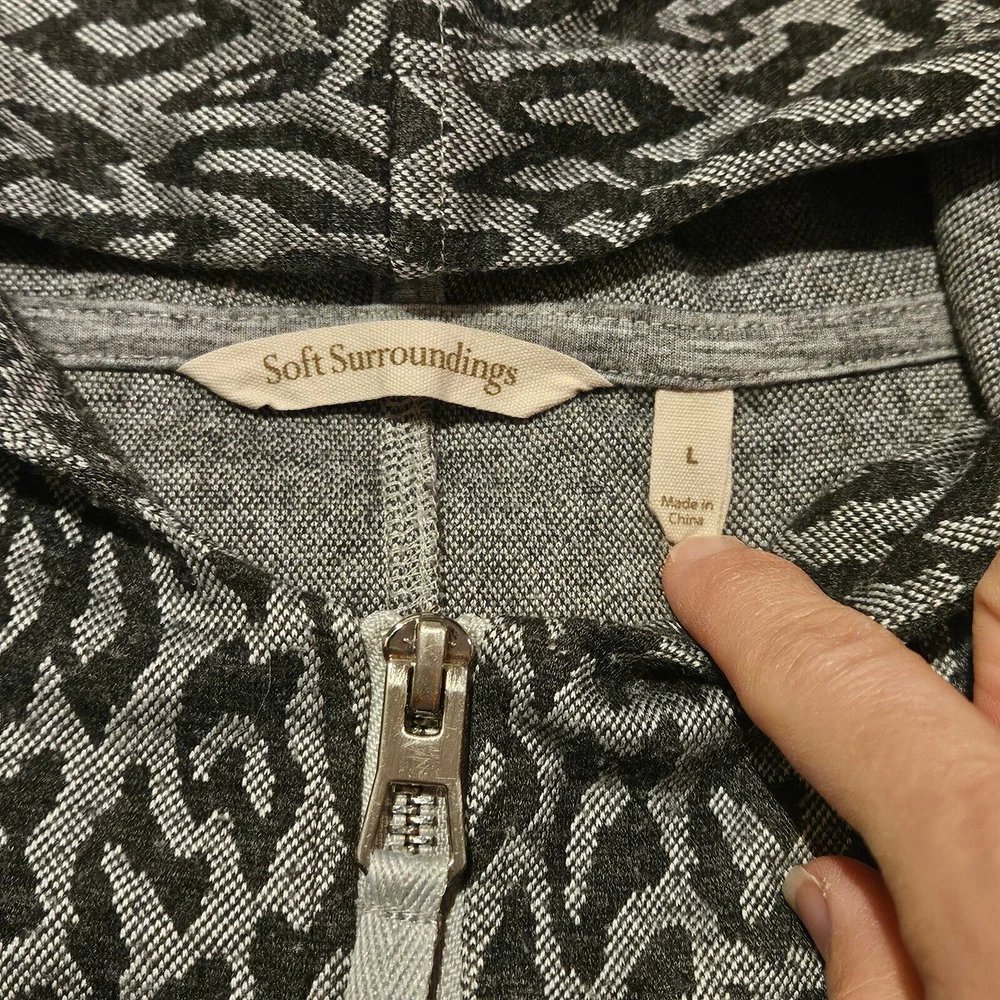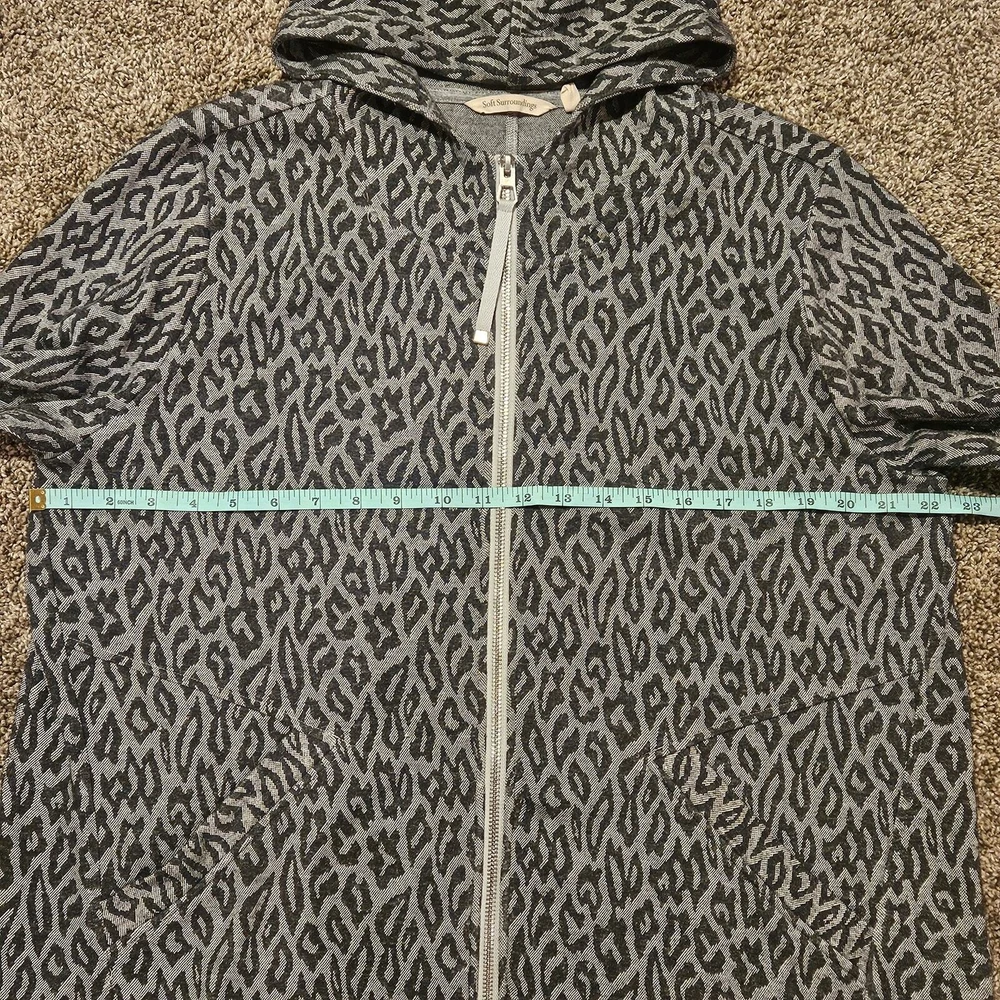 Personalize: No Department: Women Size: L Style: Full Zip Garment Care: Machine Washable Features: Stretch, Pockets, Full Zip Country/Region of Manufacture: China Pattern: Animal Print Occasion: Casual, Travel Material: Polyester, Viscose, Spandex Color: Gray Fit: Regular Closure: Zip Size Type: Regular Type: Hoodie Sleeve Length: Long Sleeve Brand: Soft Surroundings Theme: Casual, Comfort, Neutral Vintage: No Season: Fall, Spring, Winter
