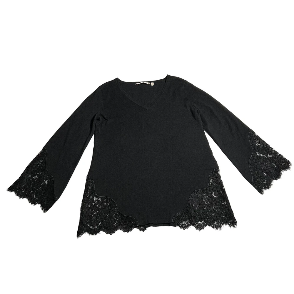 Soft Surroundings V-Neck Wool Blend Lace Trim Sweater Size X-Small Neutral CONDITION: Pre-Owned. Excellent Used Condition. FLAWS/ALTERATIONS: No flaws. COLOR: Black SIZE: Women’s Size X-Small DETAILS: V-Neck Long sleeve Lace trim on sleeves and body Stretch Wool blend Pull over MEASUREMENTS: Chest: 18.5" Full Length: 28.5" **All measurements are approximate and are taken flat** MATERIAL: BODY: 32% Nylon 28% Cotton 27% Wool 13% Viscose LACE: 59% Nylon 18% Viscose 17% Polyester 6% Cotton Bundle 2 OR MORE items to save more! Reasonable offers are welcomed! TAGS: Casual Comfy Fall Winter Contemporary Minimalist Boho Bohemian Cottagecore Neutral Basic Effortless Layers