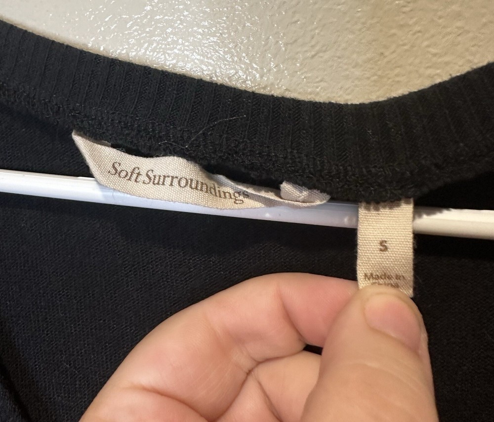 Elevate your wardrobe with this Soft Surroundings women's long sleeve top in size small. The classic black color and solid pattern make it a versatile piece to mix and match with any outfit. The V-neckline adds a touch of femininity, while the classic/fitted sleeves provide a comfortable and flattering fit. Crafted from a blend of polyester, spandex, and viscose, this knit top is lightweight, stretchy, and breathable for all-day wear. The oversized design provides a relaxed and comfortable fit, making it perfect for layering or wearing on its own. This Soft Surroundings top is a must-have basic for any woman's wardrobe. No rips holes or stains! Good Pre-Owned condition!