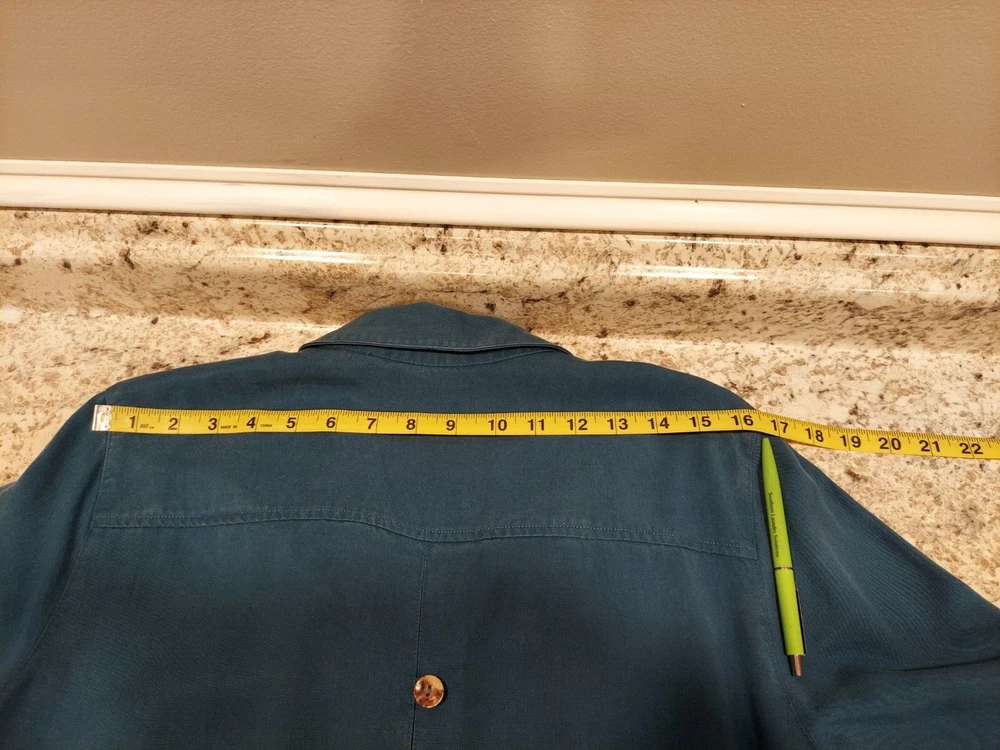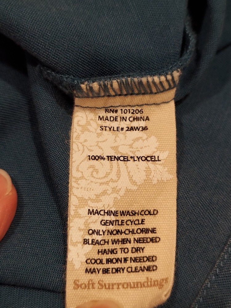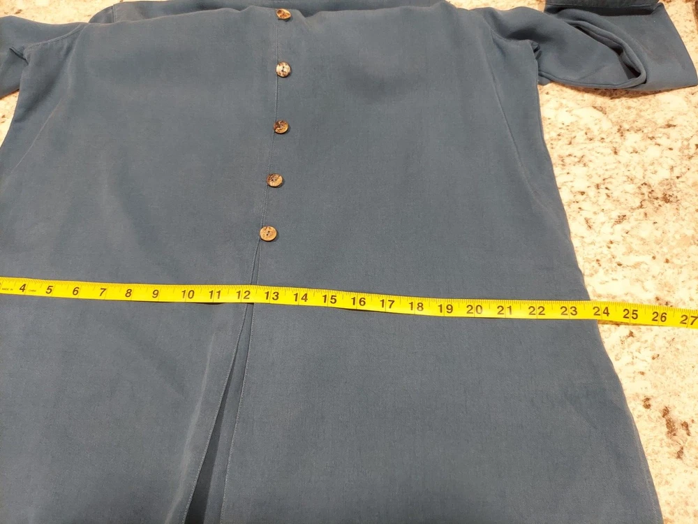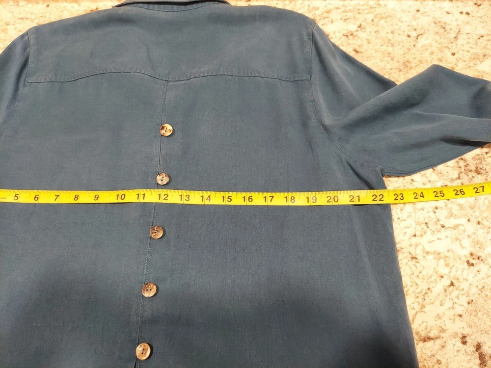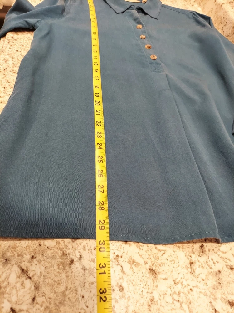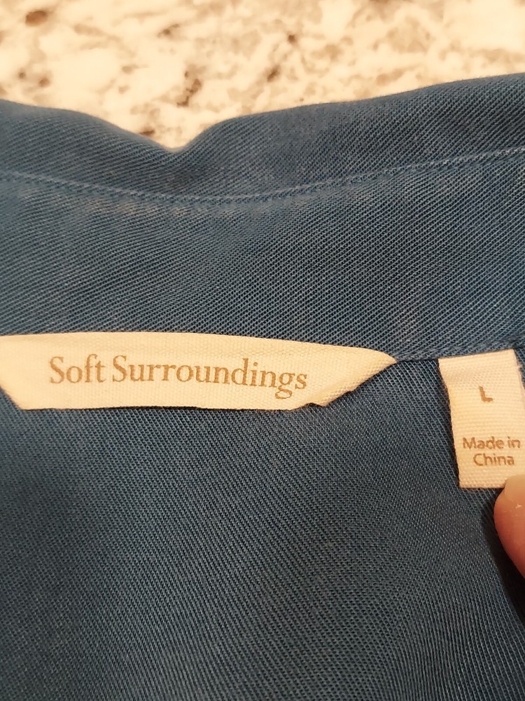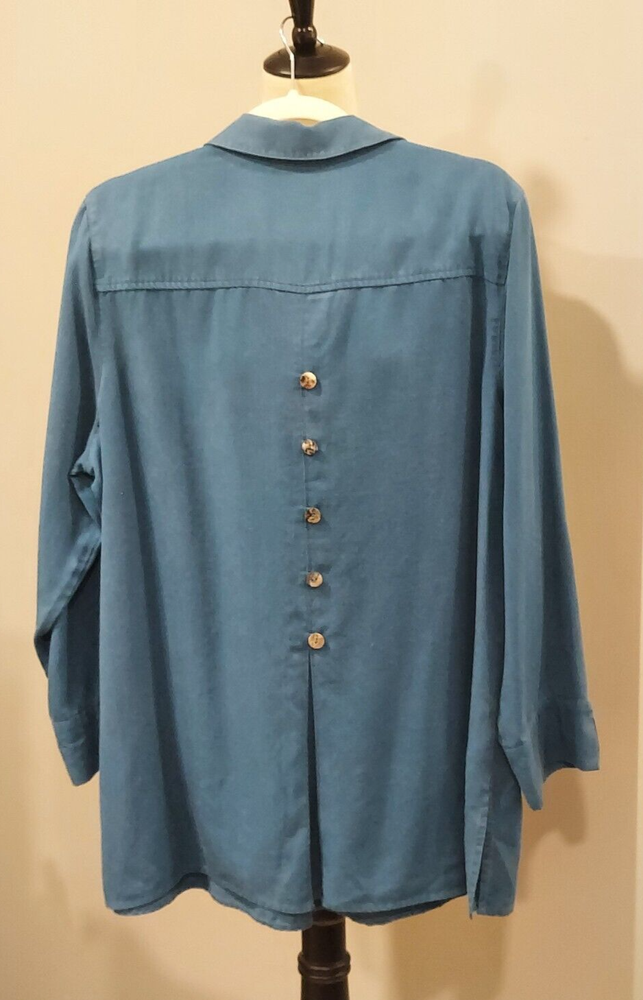 Elevate your casual wardrobe with this Soft Surroundings women's blouse. The button-up design features a solid pattern with a collared neckline and long sleeves, perfect for the cooler seasons of fall, winter, and spring. The pleated back adds a touch of elegance to the relaxed fit and is made from Tencel Lyocell fabric, ensuring a soft and comfortable feel. This tunic style blouse comes in a beautiful blue color and is available in size L for regular size types. Ideal for any casual occasion, this blouse is a must-have for any wardrobe.