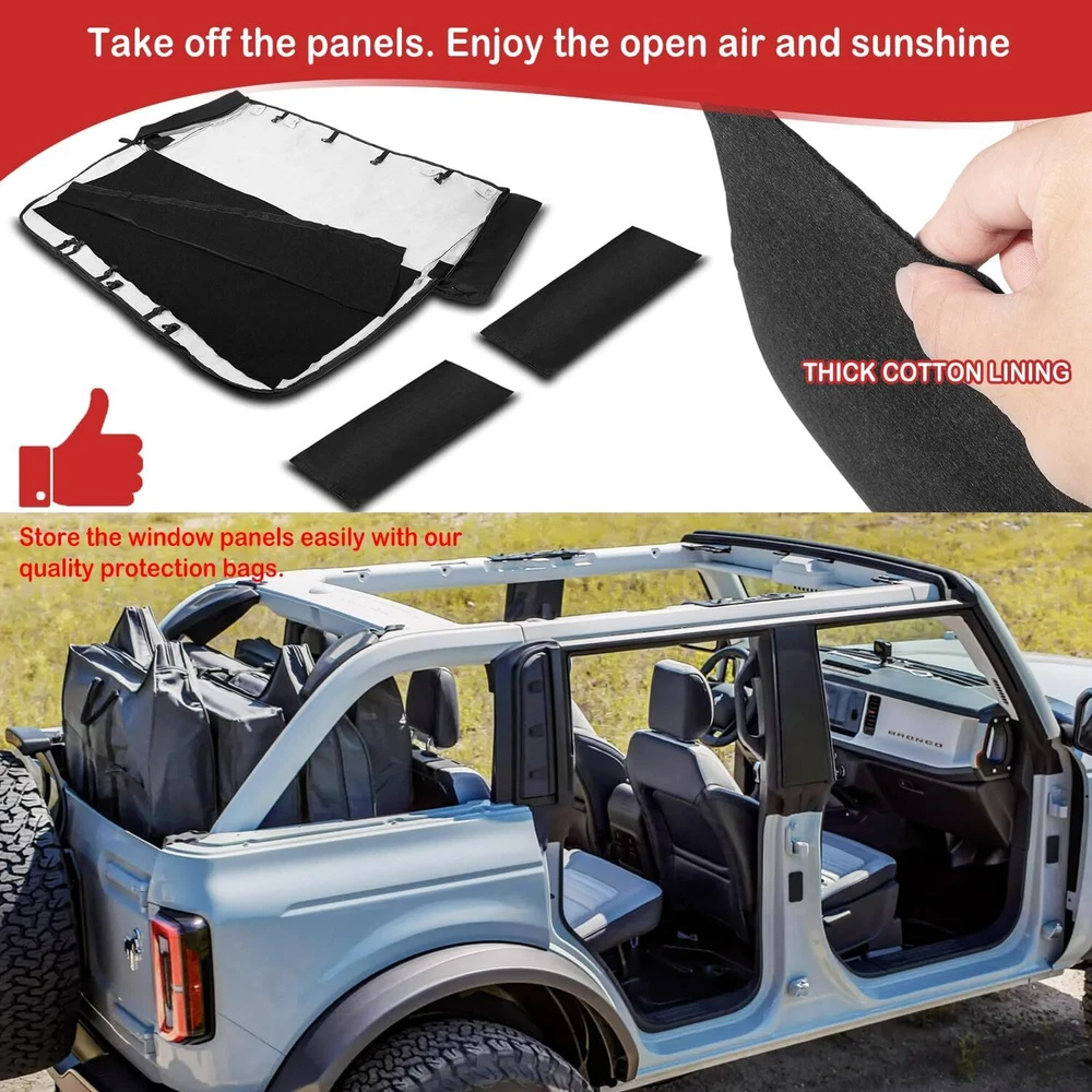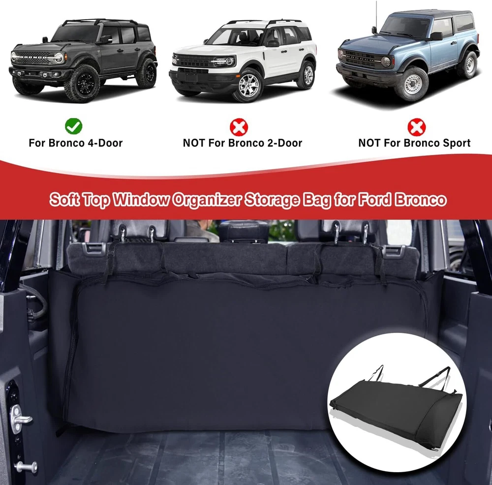【Perfect Fitment】 The soft top window storage bag is compatible with Ford Bronco 2021 2022 2023 2024 4-Door models with soft-top windows. This will NOT fit for Bronco Sport model. Kindly please check your vehicle model before purchase. 【Comprehensive Protection for Soft-Top Window】 This organizer storage bag will effectively protect the soft-top windows from damage, scratches and bends. A must-have storage accessory when you take off the soft-top windows for enjoying the open air and sunshine. Store the window panels easily with our quality protection bags. 【Expertly Made & Superior Quality】 The interior soft lining will separate the panels and avoid collision. To prevent window panels from rubbing and causing scratches, the storage bag is designed with 2 partitions and some buckles, hooks and loop fasteners inside for panels fixed in place. Furthermore, the storage bag is attached with straps for easy carriage and transportation. 【Built to Last】 Made of premium-grade 600D Oxford Cloth with soft inner liner. Waterproof and more durable. Dirt-resistance, anti-impact and anti-deformation for long-lasting reliable use. 【Satisfaction Guarantee】 If you're not satisfied with the product, simply return it in 60 days or get a replacement within 1 year for quality-related issues via our customer service. If your item is defective, incorrect, arrived damaged or any other problems, please contact us (include pictures if possible) and we will reply in 24 hours.