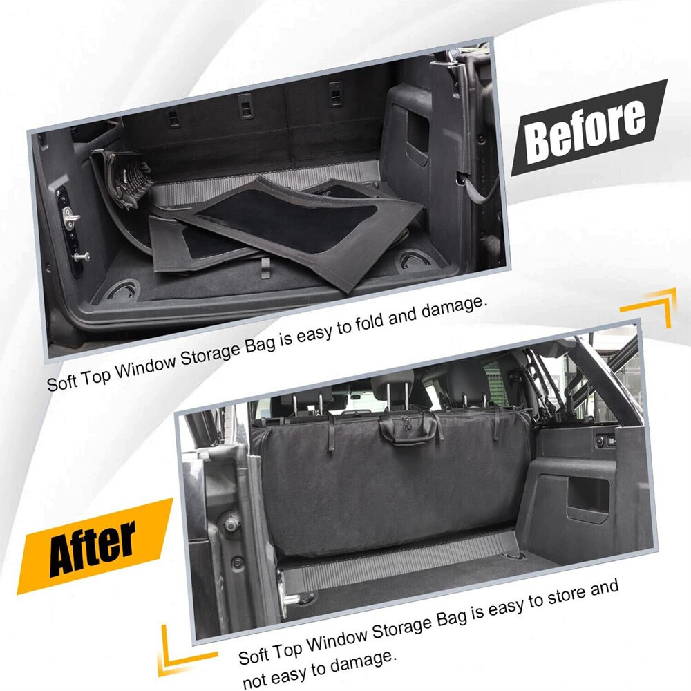Description: 1.The soft top window organizer fits for Ford Bronco 2021 2022 2023 4 Door with Soft-top window. It can protect soft-top windows from scratches and bends.Also,when you take the windows and soft-top off,you can soak up the sunshine and enjoy the fresh air. (NOT for Ford Bronco Sport) 2. Protect your soft top window from scratches and potential damage.Our Bronco soft top window organizer has a mezzanine inside that allows a full set of soft Windows to be placed and separated by soft fabric so that Windows don't rub against each other. In addition,to prevent the hard plastic from scratching the transparent plastic, we designed two partitions,so we will bend the plastic part into the storage bag. 3. After you've stowed away in the soft window, use the clasp to hang it behind the front headrest. There are two ears with a fixed rope below the bag,mounting with straps to the rear side of the back seat. Allowing you to still have ample cargo space. (Note: Tie the straps snug and correctly around the seat so the windows stay in place.) 4. Constructed from waterproof 600D Oxford cloth, strong and durable in use with soft inner liner.Soft Windows do not bend and deform in storage bags. Size: 1.5m * 0.5m Fitment: Compatible with Ford Bronco 4 door, not fit for Ford Bronco 2 Door and Bronco Sport. Package List: 1 * Soft Top Window Storage Bag