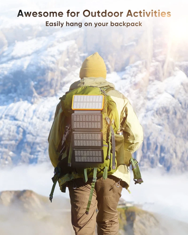 25000mAh High Capacity: The solar power bank charges up 6-8 times for a cell phone and 2.5 times for a tablet, great for a week-long trip. Large Solar Panels: This solar charger comes with 4 high-performance solar panels that can reach 6W in direct sunlight to keep your phone up and running even in places without electricity. Fast Charging: With the upgraded 15W output, the portable solar charger can fast charge an iPhone to 50% in 30 minutes. One USB C port and dual USB A ports achieve the simultaneous charging for three devices. Perfect for Outdoors: Built in bright flashlight; Compact and easy to hang it on your backpack to get sunlight, a must-have for various emergencies. 2.5X Recharging: The USB C port supports both input and output. A full recharge will take about only 8 hours with a PD fast charger (not included). Internal security system protects your device from damage.