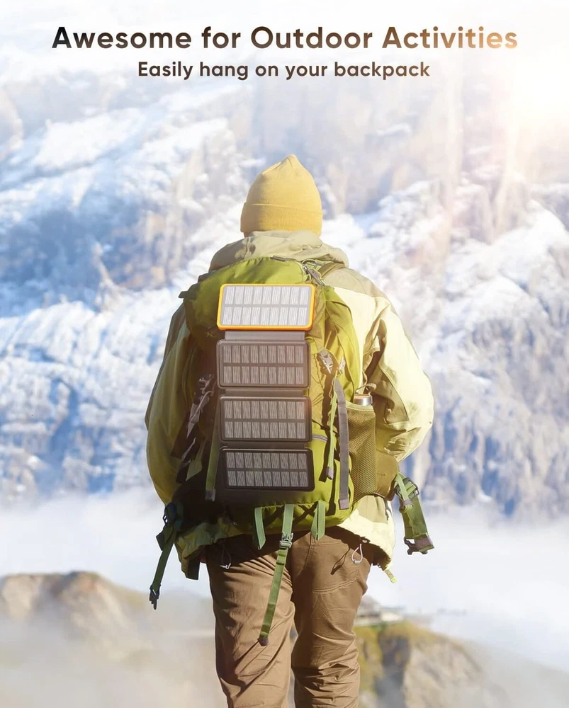 Connector Type USB Type C, USB Type A Brand Hiluckey Battery Capacity 25000 Milliamp Hours Color Orange Special Feature 4 Foldable Solar Panels, 3A Fast Charging, Short Circuit Protection, Built In Flashlight, Over Charging Protection 4 Foldable Solar Panels, 3A Fast Charging, Short Circuit Protection, Built In Flashlight, Over Charging Protection About this item 25000mAh High Capacity: The solar power bank charges up 6-8 times for a cell phone and 2.5 times for a tablet, great for a week-long trip. Large Solar Panels: This solar charger comes with 4 high-performance solar panels that can reach 6W in direct sunlight to keep your phone up and running even in places without electricity. Fast Charging: With the upgraded 15W output, the portable solar charger can fast charge an iPhone to 50% in 30 minutes. One USB C port and dual USB A ports achieve the simultaneous charging for three devices. Perfect for Outdoors: Built in bright flashlight; Compact and easy to hang it on your backpack to get sunlight, a must-have for various emergencies. 2.5X Recharging: The USB C port supports both input and output. A full recharge will take about only 8 hours with a PD fast charger (not included). Internal security system protects your device from damage. Product information Product Dimensions 6.18 x 3.54 x 1.38 inches Item Weight 1.21 pounds ASIN B07FMFGGNR Item model number HI-S025 Batteries 2 Lithium Polymer batteries required. (included) Is Discontinued By Manufacturer No Connectivity technologies USB Special features 4 Foldable Solar Panels, 3A Fast Charging, Short Circuit Protection, Built In Flashlight, Over Charging Protection Other display features Wireless Color Orange Manufacturer Dongguan Jili Intelligent Technology Co., Ltd. Country of Origin China Date First Available July 16, 2018