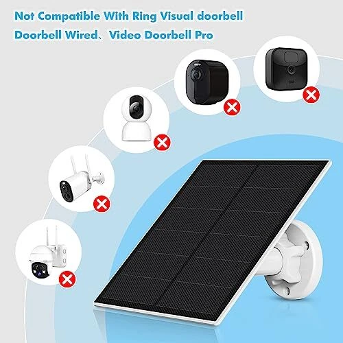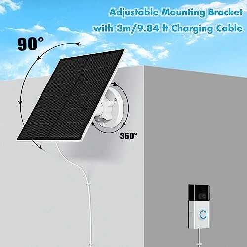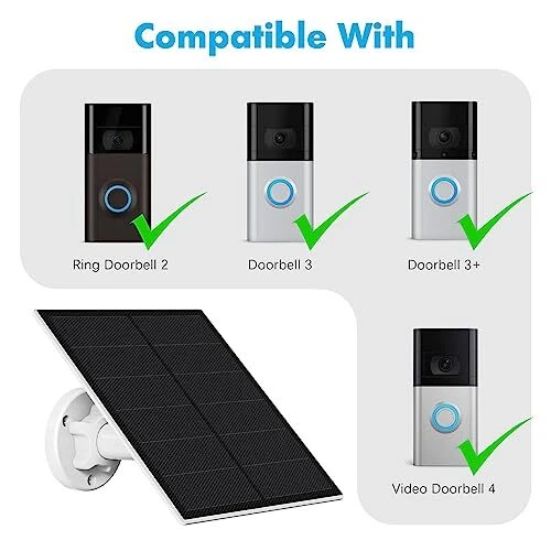 Return Policy Fast Delivery Trusted seller Solar Charger for Ring Doorbell,5W IP65 Waterproof Solar Panel for Ring Doorbell,Solar Panel Charger Compatible with Ring Video Doorbell 2,Video Doorbell 3/3+ &Video Doorbell 4 Product Description Compatible with:The Ring doorbell solar charger Compatible with ring video doorbell 2,video doorbell 3/3+/4 & video doorbell 4.Do not compatible with doorbell Wire,video doorbell Pro. Away From Doorbell Low Battery Warning:The Ring doorbell 3 solar charger can convert solar energy to electrical energy,365Days No-stop Supply power for your doorbell. Your doorbell will not have low battery warning again. 21% Higher Conversion Efficiency:Our ring doorbell solar panel charger is made of monocrystalline silicon,the charging efficiency of monocrystalline silicon is higher than others.Even on cloudy days, it can continuously charge your camera and keep your camera operating. IP65 Waterproof:The ring doorbell 2 solar charger is IP65 waterproof could withstand all the weather including rain, snow, thunderstorm.The working temperature range is -4℉ to 122℉. 10pcs cable clips: Our ring doorbell with solar charger included 10pcs cable clips,the charge cable of the doorbell solar panel can be fixed on the wall,make the doorbell and solar charger looks beautiful and tidy. Easy to install:Please install the bracket according to the steps shown in the description.then Punch two holes in the wall,mount your solar panel and connect the charging cable to your camera. Shipping Returns Payment Shipping Shipping is FREE to all addresses other than APO/PO boxes in the lower 48 states. All our stock ships from US-based warehouses. Shipped via USPS or UPS (depending on location and package weight) Unless stated otherwise, all orders will ship within 24-72 hours of your payment being processed. Check our feedback to see the great reviews of FAST shipping we offer. Returns Seller does not accept returns Payment We currently accept payment via eBay managed payments only. Once payment is cleared, we will dispatch your shipment within 1-3 business days. Please refer to the "Shipping" tab for more information regarding shipping speed to your destination.