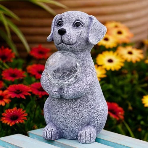 Solar Dog Garden Statues - 8.4 "Dog Decor with Gazing Ball Solar LED Gray Dog