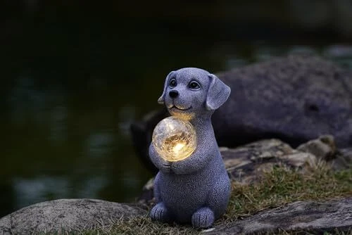 Solar Dog Garden Statues - 8.4 "Dog Decor with Gazing Ball Solar LED Gray Dog