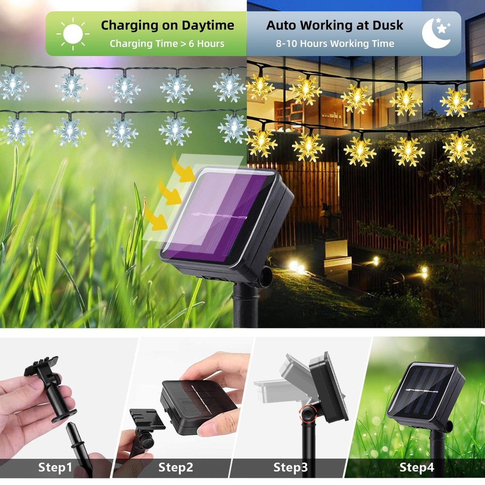 These solar fairy lights are amazing! Super bright and energy-efficient, they charge quickly and last all night. The waterproof design holds up perfectly in rain or snow, and I love that they remember the last setting—no daily reset needed. The warm white glow creates a cozy atmosphere, great for patios, gardens, or indoor decor. Super easy to install, and the solar panel works like a charm. Highly recommend for hassle-free, beautiful lighting!