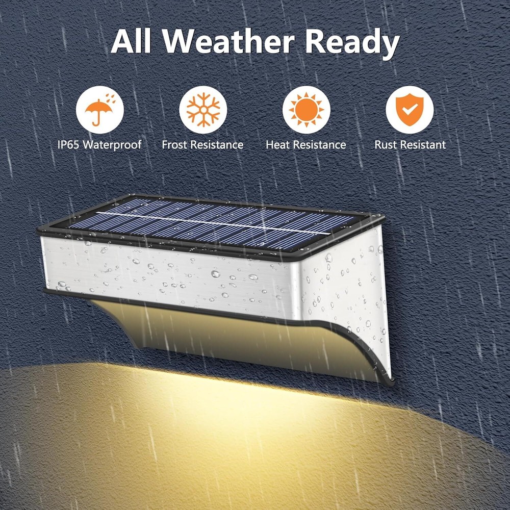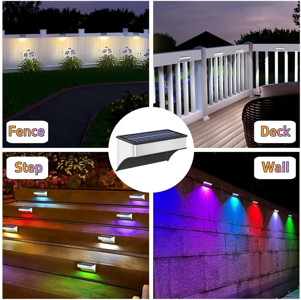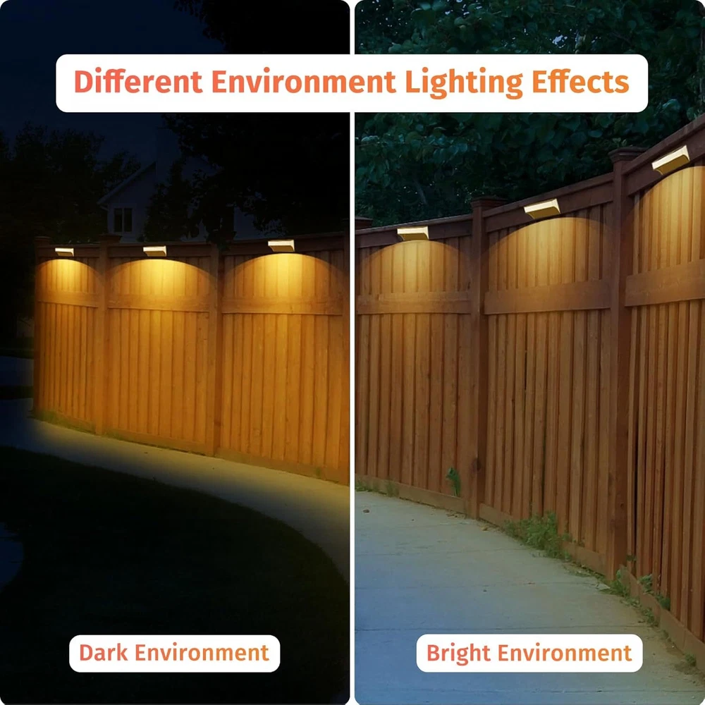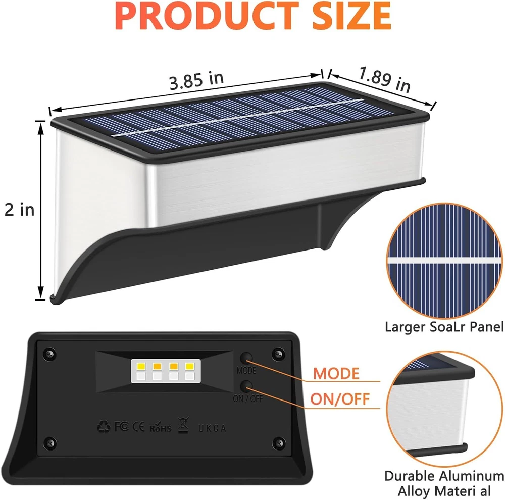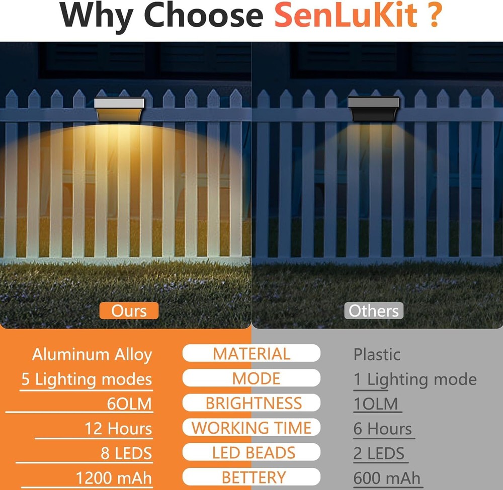 🎁【Unique Light & Dazzling Nights】- SenLuKit solar fence lights feature a 8 leds design. It's unique and special lighting that shines up and down, creating a nice puddle of light on the ground, adding a stunning glow to your home's exterior. This would be perfect for Halloween or Christmas decoration! 🎁【Dusk to Dawn Auto On-Off】- No more hassle of manually switching every day, enjoy the convenience of an intelligent lighting system. Our wall mounted solar lights turn on at sunset, providing beautiful illumination, and turn off at sunrise, utilizing solar power for charging. Ensure a full charge before the first use to optimize battery life. 🎁【 Enjoy Your Colorful Night】- Our outdoor solar patio lights offer 5 modes and 10 color, perfect for walls, porches, entrances, pillars, pool, decks, railings, stairs, patios, backyards various outdoor settings. The color-changing mode creates a delightful atmosphere for outdoor events. 🎁【Bigger Panels, Brighter Nights】- Our solar wall lights come with larger solar panels and a high-capacity 1200mAh battery, making them brighter than others with just small panels and 500mAh batteries. SenLuKit solar stair lights only need 6-8 hours of direct sunlight to provide all-night lighting. 🎁【Upgraded Waterproof & Durable】- With a hard and durable Aluminum Alloy housing and high-quality solar panels, IP65 waterproof backyard lights is designed to withstand wind, rain or snow. The high-efficiency polysilicon solar panels (5V, 200mA) enhance energy conversion, providing stable and reliable performance for longer-lasting illumination compared to conventional batteries. 🎁【Easy Installation and Memory Function】- Our solar fence light is designed for easy installation, requiring no complex steps. Simply set the light to the "ON" position before installation, as it will not charge in the "OFF" position. The outdoor solar light's smart memory function can automatically reverts to your most recently used mode. Use the mode adjustment button to switch between colors and lighting modes, providing consistent and convenient illumination. 🎁【Customer Satisfaction Guarantee】- We stand behind the quality and performance of outdoor solar fence lights. If you have any issues or concerns, our dedicated customer service team is ready to assist you. Invest in our outdoor solar lights for a worry-free lighting solution.