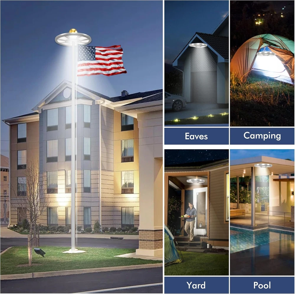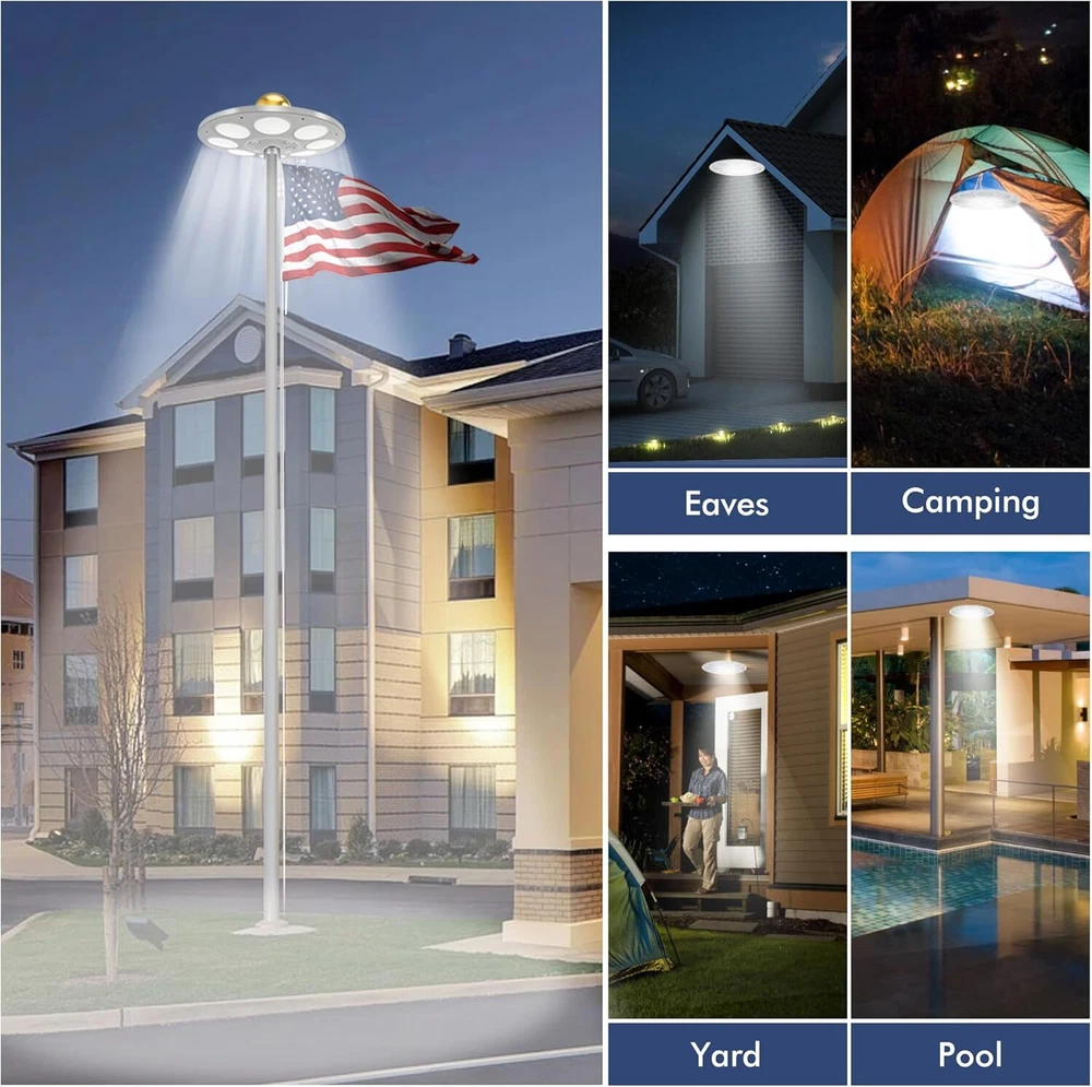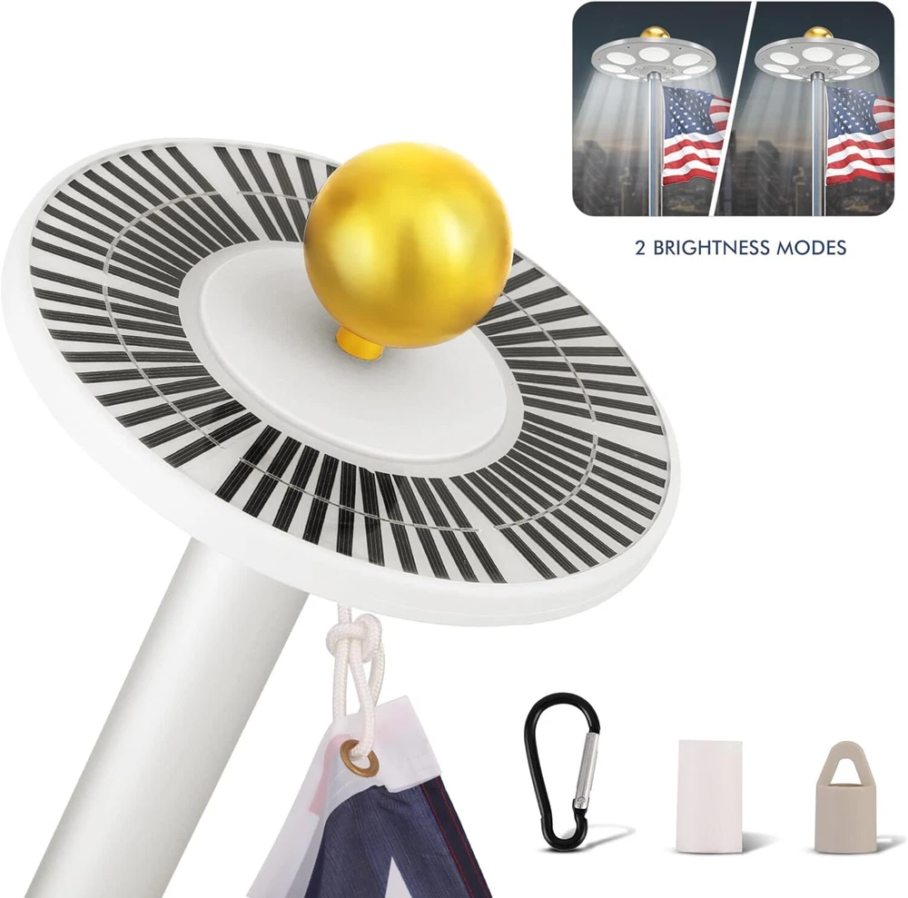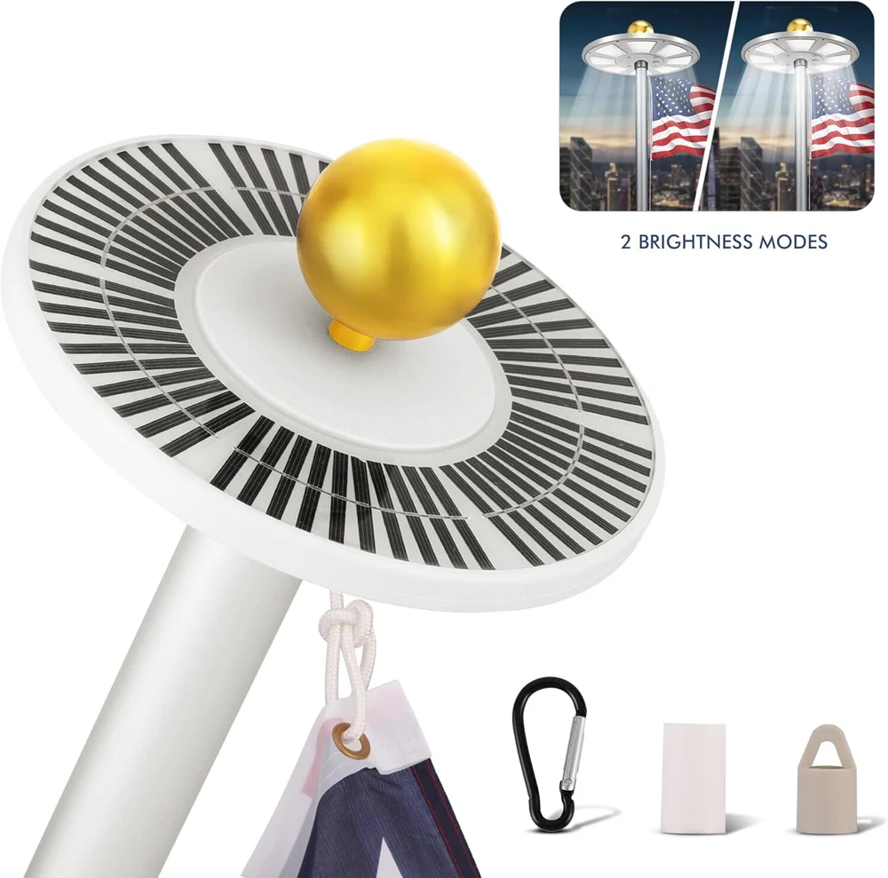 Store Categories Store Categories Other Solar Flagpole LED Light 136LED Flag Pole Light Waterproof Outdoor Pole Top Lamp Product Description Features: 【136 LED Solar Flag Pole Light】Our solar flag light with 136 multi-angle LEDs ensures your flag shines brilliantly even at night. Designed to be U.S. Flag Code Compliant, it perfectly lights up every part of the flag with 100% flag coverage. 【Impressive 10000h Lifespan】Illuminate your flag properly for years with a simple 30-second setup. The solar flagpole light fits standard 15-25 ft flag poles with a shaft diameter of less than 0.63 inches. Please check the specifications to ensure it is compatible with your flagpole. 【66 Solar Panels & Auto On/Off】It is powered by a 2500mAh rechargeable lithium-ion battery and 66 scattered solar panels that store energy from the sun more efficiently. This allows the solar light to last for up to 10 hours consistently from dusk to dawn. To use the light, push the "ON" switch in either of the two lighting modes. 【Reliable 1-Year Warranty】The flagpole light comes with 1 Solar light, 1 Tube, 1 Hook & 1 Clip, all backed by our commitment to quality. Please Note- It does NOT include a Top Ball, Flag & Pole. 【Experts in Eco-friendly Lighting】The US Brand PPQ (Perfect Product Quality) is a leading expert in yard solar lighting. Our fire retardant technology ensures a safe yard and a carbon-free green lifestyle. By illuminating your flag with our flagpole light, you can show pride in your patriotism, honor the Stars and Stripes, and show love for veterans Specifications: - Color: White - Material: ABS - Light-emitting chip: 136 LED Package Included: 1 x Solar Flagpole Light 2* Hanger Accessories Tips: 1. Please use a 15-20 foot flagpole with a 0.5"-0.6" pole on the top. 2. Please tear off the protective film on the solar panel for the first time. 3. Make sure that the light switch is in the ON position before installation. 4. If you want to get the best performance of 128 LED solar lights, please ensure 8 hours or more sunlight, about 10 hours of lighting, 5. Please note that this list only applies to solar flag lights. Does not include balls, bolts, decorations, flags or flagpoles. The props in the product pictures are only for demonstration and application purposes. 6. The maximum brightness of the flagpole is 640 lumens. If you want your flagpole to light up longer at night, please select "I" level. If you want to get 640 lumens of brightness at night, please choose the "II" level. Copyright © 2023 Dianxiaomi