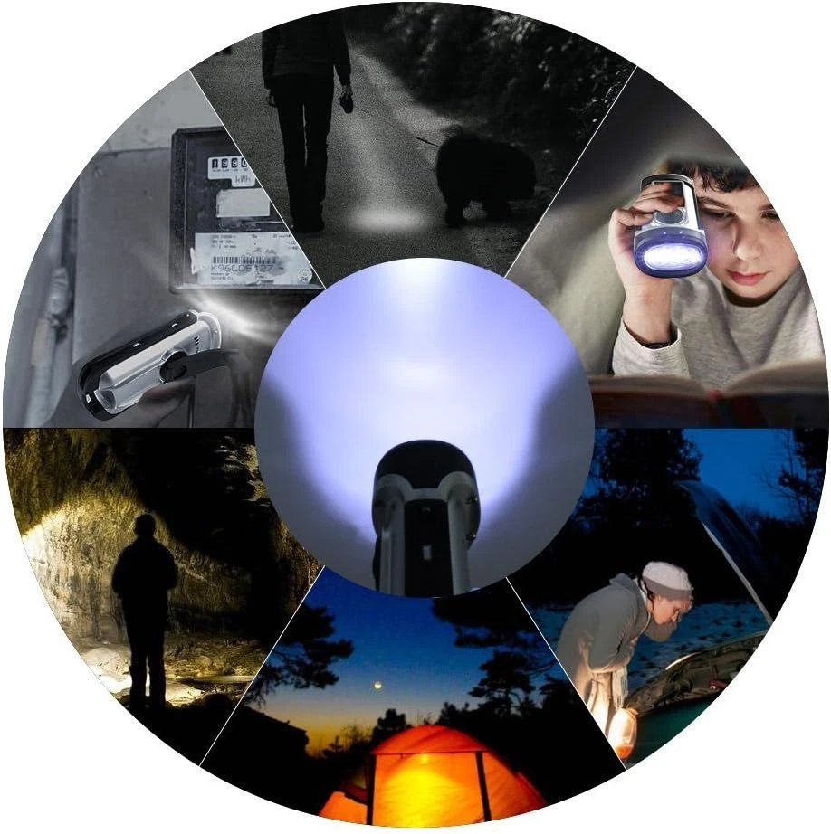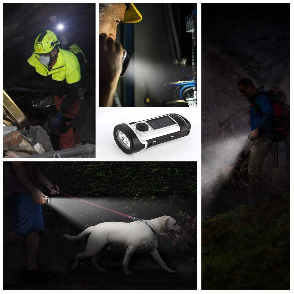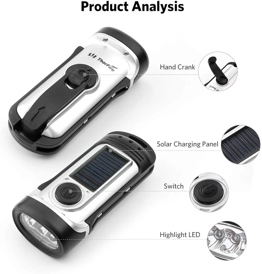 3 Lighting Models: THORFIRE cank flashlight has three modes:1 LED Mode; 3 LEDs Mode; SOS Flash Mode. This hand crank flashlight is equipped with LED bulb. Very compact and bright flashlights. Must have one for home or outdoor use Product Description High Efficiency of Energy Conversion Just 1 minute of hand cranking yields 1 hour of light and the efficient battery can store power all day. After 1 Minute Hand Cranking: 80 Minutes light with 1 LED/ 60 minutes light with all 3 LED's/110 Minutes of flashing. When the battery runs out you can recharge it immediately by either using the hand crank or exposing the solar panels to direct sunlight. After 1 Hour Direct Sunlight: 120 Minutes light/140 Minutes of flashing. IPX6 Waterproof and Submersible up to 45 feet It's one durable and handy tool flashlights for home and outdoor use especially for extreme weather such as for Vehicle use, Camping, Hiking, Traveling Etc. This dynamo flashlight is solar powered with a hand crank, so there's no need to depend on external power. I t is an excellent survival tool for extended power outages. Very handy and useful self powered flashlight. ThorFire cranking flashlight will be your best companion When you going camping, hiking, travelling and go outdoor adventure. When the battery runs out you can recharge it immediately by either using the hand crank or exposing the solar panels to direct sunlight. Main Features: Solar & Hand crank powered flashlights no batteries needed. This no battery flashlight is ideal for emergencies, power outages or anytime you need light. High Efficiency of Energy Conversion Cranking Flashlight: Just 1 minute cranking will generate enough power for 1 hour long using time. IPX6 Waterproof and Submersible up to 45 feet. Very durable and handy tool for home and outdoor use. Such as for Vehicle use, Camping, Hiking, Travel Etc. Whether you do survival adventure or rock climbing this no battery spotlight is a must have. Bright Flashlight:This solar powered torch light is equipped with high quality LED bulb. Very portable and bright flashlights. Put it in the sun or wind it up to recharge. 3 Lighting Models 1 LED Mode; 3 LEDs Mode; SOS Flash Mode; This solar powered torch light is equipped with LED bulb. Very compact and bright flashlights. Must have one for home or outdoor use. Ideal Companion This flashlight is the ideal companions in emergency situations that Works up to 4 hours at a time; The beauty of this flashlight is that you will not need to replace it or buy a battery for a LONG time. It provides timely illumination without the necessity of external batteries. It also fits perfectly into any practical use such as at home, for vehicle, camping, hiking, etc.