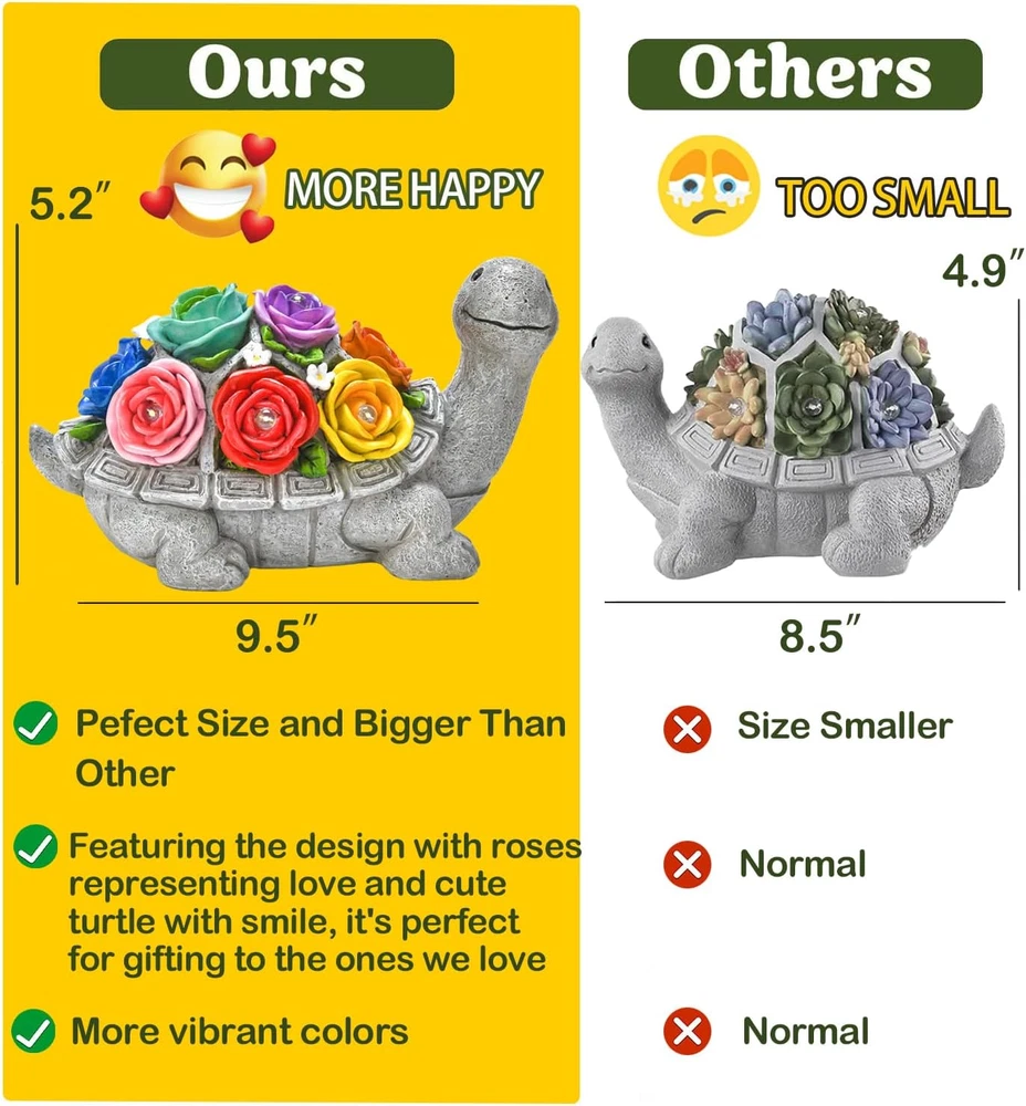 Store New Arrivals Add to Favorite View Feedback Contact Solar Garden Decor Turtle with Rose and 7 LED Lights - Outdoor Decor Tortoise Statue for Patio, Balcony, Yard Ornament, Unique Gifts for Mom. Description Item model number OGL_A008 Style Garden" or "Statue Number of Items 1 Color Turtle Material Resin Country of Origin China Item Weight 2.05 pounds Theme Animals Cartoon Character Turtle Recommended Uses For Product Outdoor Seasons All Seasons Collection Name All Special Feature Rechargeable Product Dimensions 9.5"D x 5.2"W x 5.3"H Occasion Housewarming ENDLESS LOVE - We express love in many ways, and roses are surely one of the timeless ways to show your affection to the one you love most. This turtle garden statues featuring 7 vibrant rose flowers, is a pefect gift for your beloved ECO-FRIENDLY GARDEN SOLAR LIGHTS - A renewable, clean energy source - powered by electricity, converted from sunlight during the day - stored in rechargeable batteries - with a runtime of up to 8 hours on a full day of sunlight. PERFECT SIZE - This backyard decor at a full 24 cm in width and 13 cm in height,, making it an impressive addition whether you place it on the patio, courtyard, yard, lawn, or even a spacious windowsill. EASY TO USE - Simply place the solar turtle outdoor statues in a spot with sunlight and keep the switch in the 'on' position. The garden gnome light will charge for 6-8 hours during the day and automatically illuminate for over 8 hours at night. FANTASTIC GARDEN GIFT - The solar garden statues comes in its own beautifully designed box. It's the perfect choice for giving to your mom/grandma/wife/daughter/sister/girlfriend/boyfriend/aunt,your wedding anniversary, child's birthday, mother's birthday or Mother's Day, Father's Day, Thanksgiving, Valentine's Day and Christmas.housewarming gifts for new house Product Description ABOUT US We offer the best prices around on high quality products. Our E-store includes media such as books, movies, music and games while offering electronics, toys, sporting apparel, clothing, tools, general home, garden items and more. SHIPPING We are always working hard to ensure your package arrives as soon as possible. Please understand that some factors like weather, high postal traffic, and the performance of shipping companies are outside of our control. We offer free shipping to the lower 48 states and ship within 2 business days of payment, usually sooner. We do not accept P.O. Boxes. Please provide a physical address. For shipping outside of the continental USA, we only use eBay's Global Shipping Program.The item is shipped to KY and then sent to the rest of the world. International customers are responsible for all duties and taxes. Continue to check out in order to calculate costs for shipping the item to your country. Messages regarding eBay's Global Shipping Program MUST be directed at eBay EXCLUSIVELY. RETURNS We offer a 30-Day Return Policy on items which you are not completely satisfied with. You have the option for a full-refund or an exchange of the item. No returns are available on items shipped outside of the USA. PAYMENT We accept PayPal. CONTACT US This page content is yet to come Please ad us to your favorite seller and visit again later Thank You CUSTOMER SATISFACTION We try our very best to make sure every customer is completely satisfied. If there's a problem, message us! We're happy to help. WE ACCEPT Copyright © 2021 AutoDS. | All Rights Reserved
