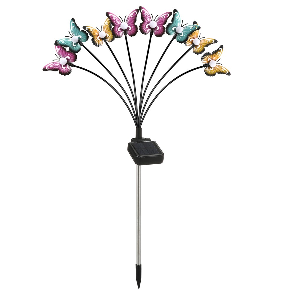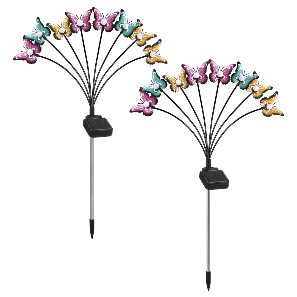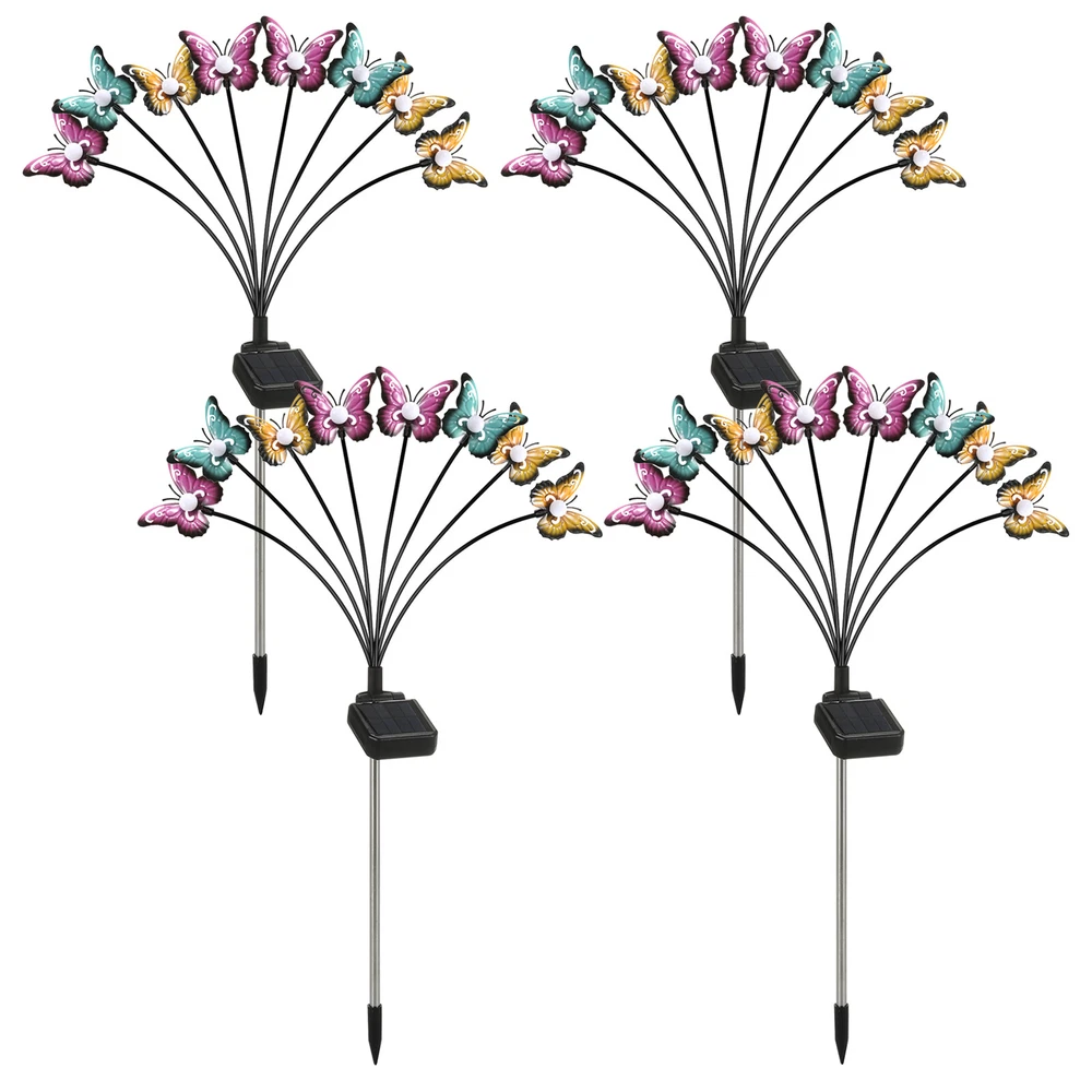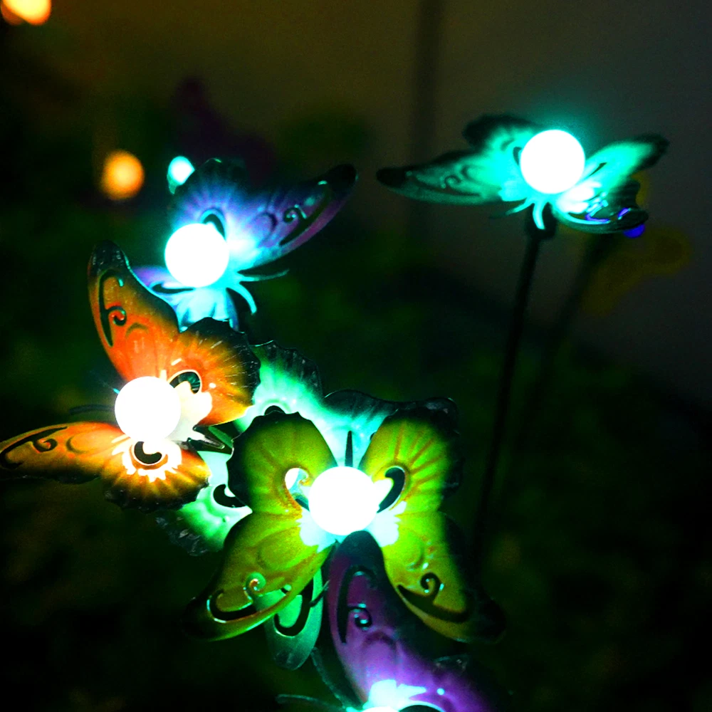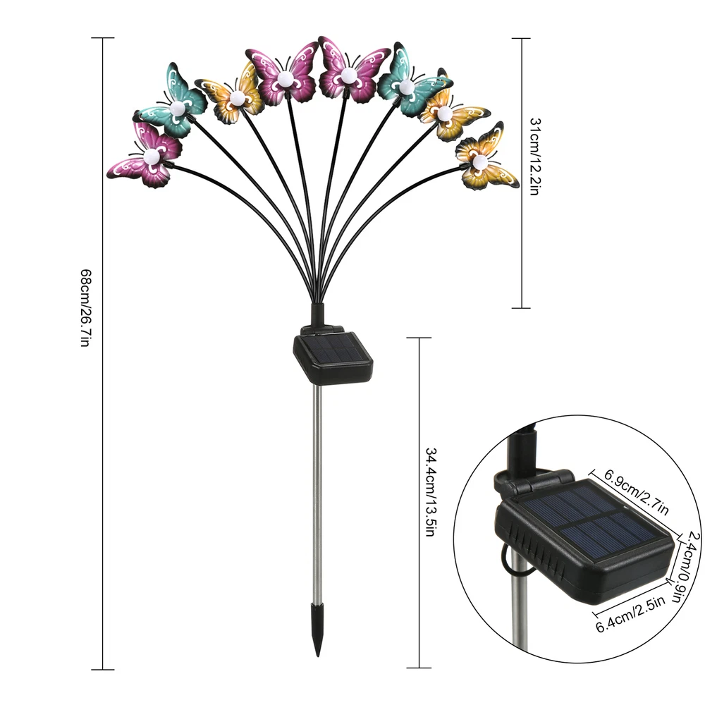 Overview: This solar powered butterfly lights is bright enough to light up pathway or walkway. The garden lamp swaying and dancing in the wind looks like butterflies flying in the yard, creating a very dynamic and romantic atmosphere. Perfect for patio, garden, lawn, villa, balcony, flowerbed and any outdoor areas. Features: Swaying Lights: The solar-powered butterfly landscape lights are supported by flexible wires that will sway when the wind blows, which looks like butterflies dancing and flying in the yard, creating a very lively and romantic atmosphere. Easy to Install: Just connect the lights with the metal ground stake provided, push the switch to the ON position, and then insert into the ground where there is direct sunlight. It will automatically turn on at night and turn off at dawn, convenient to use. Energy-saving Solar Powered: Monocrystalline silicon solar panel can effectively convert light energy into electricity. Supports 8-15 hours of working time when fully charged. Make sure that the solar panel can get 4-6 hours of direct sunlight. Landscape Path Light: Insert into the ground as a landscape light. Warm light and colorful light are optional, adding a special flair to the path, yard, garden, lawn, trail and anywhere you want to place. It can add a lot of vitality to your space. Outdoor Use: Made of high strength ABS and stainless steel, IP65 waterproof, it can withstand rain and other terrible weather. Colorful iron butterflies won't rust even for long time use. Smooth edge does not hurt hands. Note 2: Make sure the button on the back of the solar panel remains in the ON position. Specifications: Material: ABS+Stainless Steel+Iron Solar Panel: Monocrystalline silicon solar panel, 6.5*6.0cm, 2V/160mA Battery Capacity: 1.2V/800mAh Ni-mH Charging Time: 4-6 hours direct sunlight Working Hours: 8-15 hours Induction Mode: Light induction Light Color: Colorful light Lamp Heads Quantity: 8-head Lamp Quantity: 1 Pack, 2 Packs, 4 Packs (Optional) Waterproof Grade: IP65 Color: Black Total Lamp Length: 70cm Package List: 1/2/4 * 8-Head Solar Lamp(Optional) 1 * User Manual