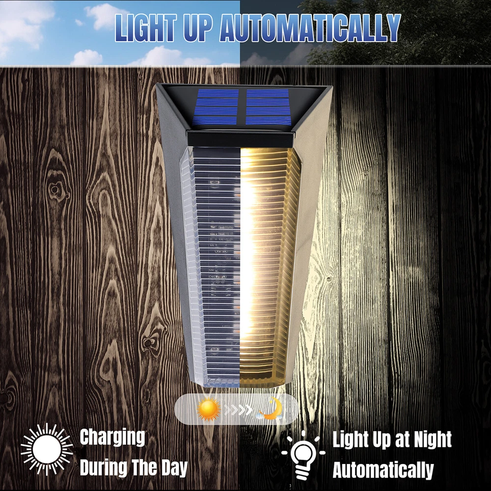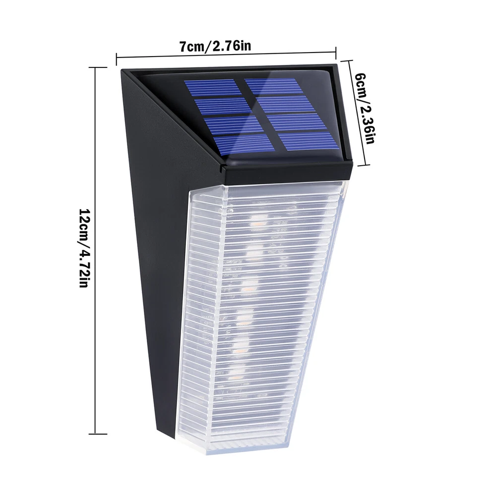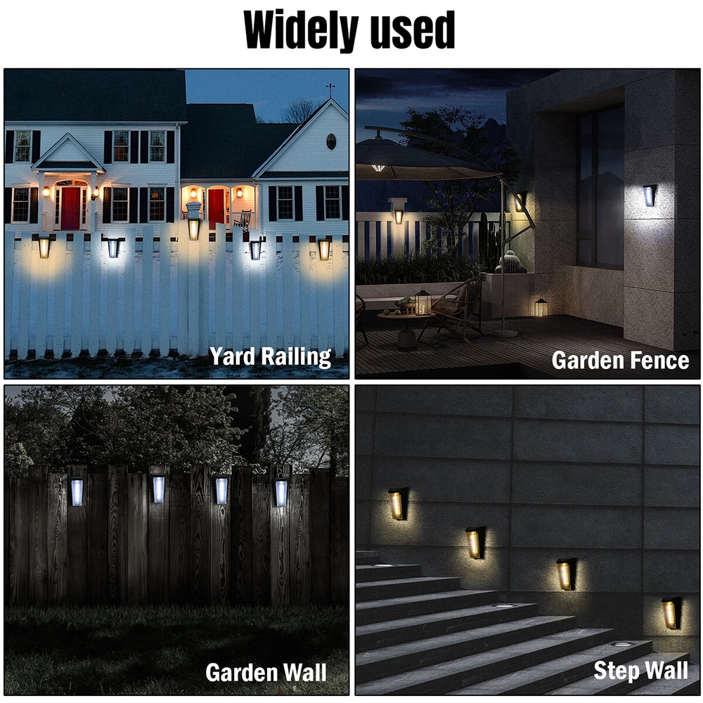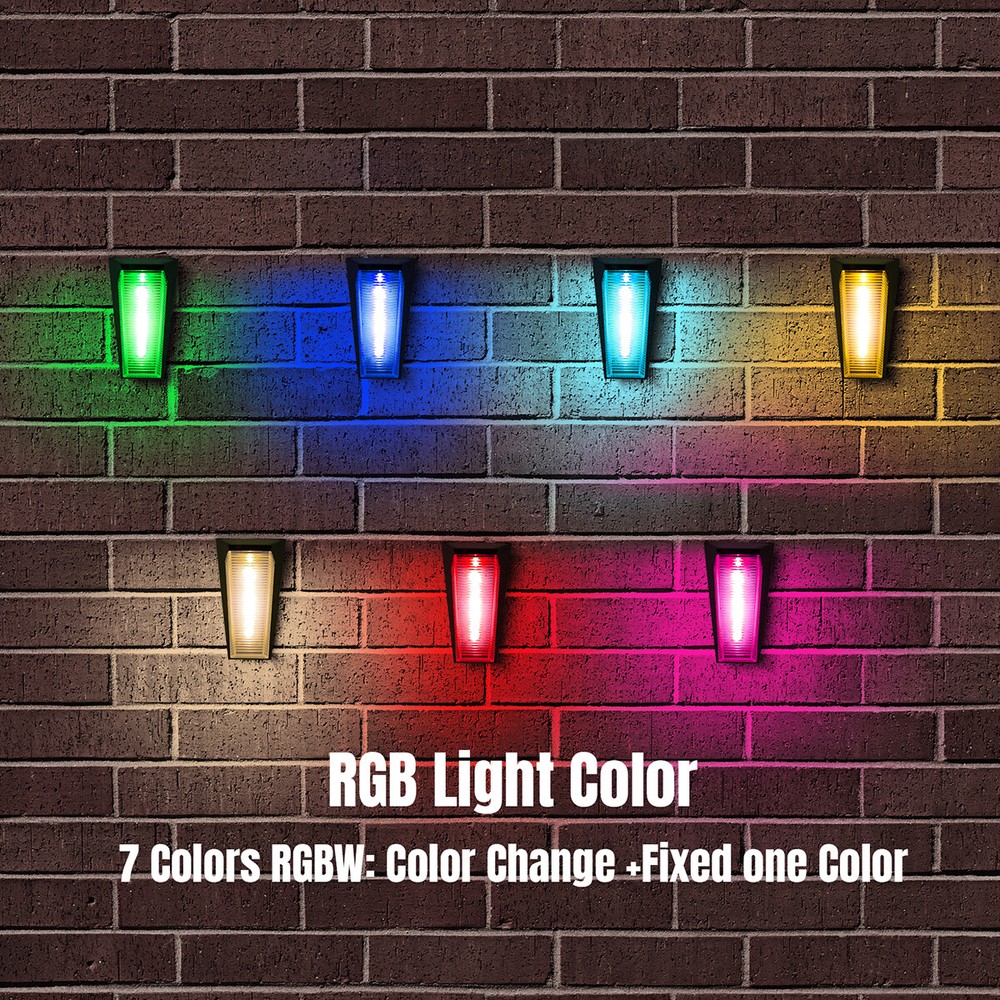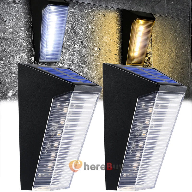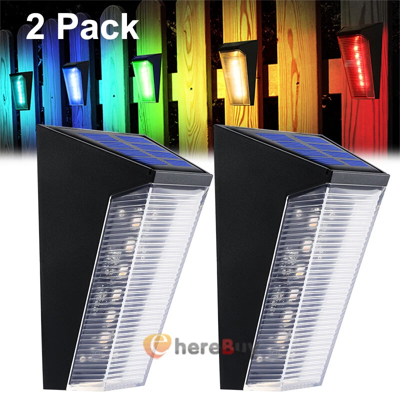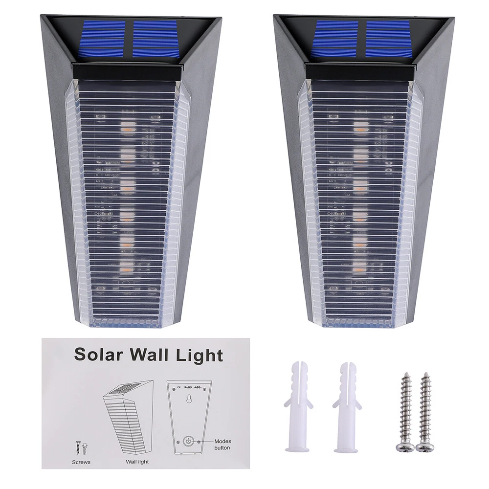 LED Solar Deck Lights Outdoor Garden Patio Pathway Stairs Step Fence Wall Lamp Product Feature 1.Solar Charging: The Solar Wall Light can be charged by solar energy, absorbing energy during the day and automatically lights up at night. 2.Outdoor Waterproof: The Solar Wall Light has IP55 waterproof rating, fearless of wind and rain, and can be used normally on rainy days. 3.ABS Material: The Solar Wall Light is made of ABS material with excellent impact resistance, which can effectively prevent damage due to accidental impact during use. 4.Intelligent Light Control System: Solar Wall Light adopts intelligent light control system, which can intelligently sense the change of external light and automatically turn on and off the light. 5.Easy to Install: Solar Wall Light is an independent power generation system, no need to lay complicated wires and cables, installation is more convenient and quick. [Warm Light + White Light] Working Mode: Solar Wall Light has 8 working modes, 1 speed white light, 2 speed warm light, 3 speed full mode cycle, 4 speed dual color fast cycle, 5 speed dual color slow cycle, 6 speed dual color gradient, 7 speed dual color fast cycle fast flash, 8 speed dual color mixed fast flash. Product Specification Solar Panel: polycrystalline silicon 2V*130mA Battery Parameters: Ni-MH AA 1.2V/600mA Voltage: 1.2V Power: 3W Light Source: Dual (2-color) *6 pcs warm/pure white LED ( 8 working modes ) 7 color change *6 pcs RGBW SMD ( 5 working modes ) Charging Method: solar charging Charging Time: >8 hours Working Hours: >8 hours Waterproof Grade: IP55 Switch Mode: hand control + light control Material: ABS Color: black Size: 6x7x12cm/2.36x2.76x4.72in Package Includes 2x Solar Wall Lights 2x Screws 2x Expansion Tubes