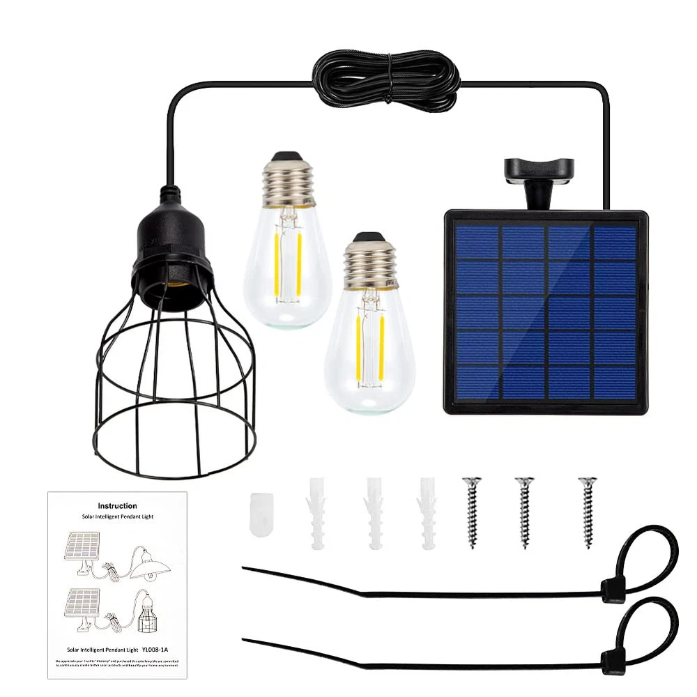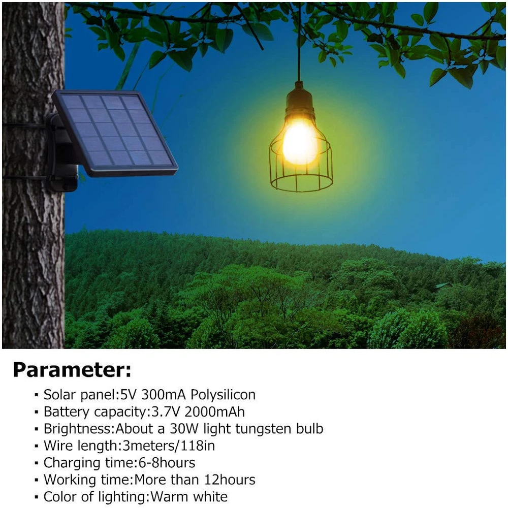【Solar Powered & Dusk To Dawn Outdoor Lighting & Long Working Time】This solar shed light is automatic and charges by itself using solar energy. As soon as the sun goes down, the light automatically comes on. You don't have to turn it on or off, and no electricity is needed, save money. We use special bulbs that cannot be replaced with other bulbs at will. However, rest assured, we include a spare bulb, and each bulb lasts five years, so feel confident in your purchase 【Adjustable Solar Panel & Small Design & Style】The 180-degree adjustable solar panel allows you to adjust the angle for optimal daylight exposure. The flexible angle can meet different needs. The small design is in a style, and the iron art lantern includes an E27 warm white LED bulb. It has a sturdy rack with screw mounting and a hermetically sealed solar module 【Waterproof IP65 & Sturdy & Long Battery Liftspan】With a solar rechargeable universal battery in the solar panel and a switch located on the panel for easy control, this solar light is both waterproof and dustproof with an IP65 professional protection level. It maintains very bright brightness even after prolonged exposure to the outdoors, thanks to its durable and long battery lifespan 【Simplistic to Install & Suitable for Outdoor and Indoor Use】The cord between the light and the solar panel is 9.8 ft, making it perfect for hanging from a shed, porch ceiling, cabin roof, tree, doorway, garden, barn, playhouse, barn, gazebo, deck, outdoor kitchen or anywhere outdoors. You can also place the solar panel outdoors and install the lantern for indoor lighting 【What's In The Box & After Sales Service】The package includes a chandelier light with a solar panel, pieces of E27 bulbs, screws and screw stoppers, and a fixing strap. An extra bulb is also included in the package to prevent breakage during installation. Please check whether the solar light bulb can be used normally before installation to avoid unnecessary trouble. Please feel free to us if you have any questions. We focus on providing quality brands and services