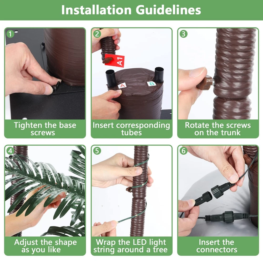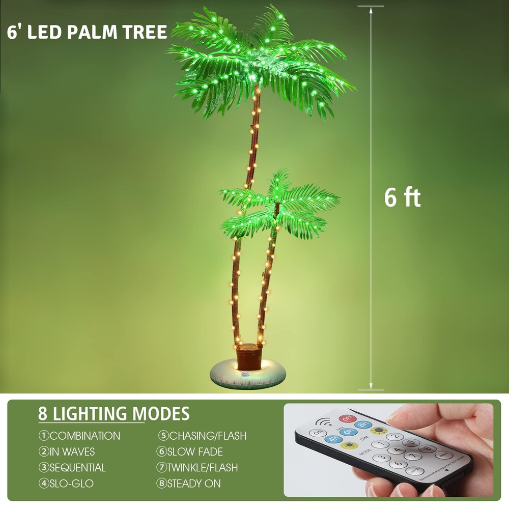 Solar Lighted Palm Trees for Outside Patio, Bar Pool Deck Outdoor Decorations Decor, Light Up LED Artificial Fake Tree Lights for Yard Tropical Party Christmas Solar Powered: Use solar energy to charge during the day and enjoy Hawaiian style lights at night. Only takes 5-10 hours to be fully charged, providing 8-10 hours of lighting for LED solar lights. IP65 Waterproof for indoor/outdoor use. 8 Lighting Modes & Timer - Solar Palm Tree Lights with 8 pre-programmed lighting modes (IN WAVES/SLO-GLO/FLASH, and so on). You can use the remote control to adjust the light mode and set the 4/6/8 timer to save energy. Steady On is the last mode. Sturdy Metal - Compared to the plastic materials used by others, palm tree uses a metal trunk wrapped in nylon rope, with a heavy-duty base and 4 ground stakes, which is beautiful and sturdy. Ideal Unique Decorations - Unique shape of two trees. You can freely adjust the shape of the trees to bring you different tropical styles. Ideal for Summer Bar themed parties and Christmas Eve event. Note: The item can be used outdoors but not extreme weather. US Patent Protected. If you encounter any problems during use, you can check the troubleshooting manual on the page or let us know directly.