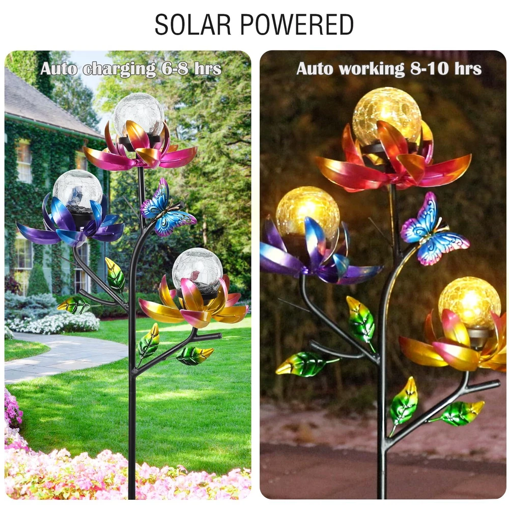 Catch the breeze and create a mesmerizing display of movement with this triple flower solar wind spinner. Brightly colored flowers in yellow, pink and blue rotate horizontally. Wind spinner outdoor is a beautiful piece of garden art in the daylight and, when the sun sets, the solar-powered globes illuminate to give you a magical nighttime experience. Every flower in this solar wind spinner is with integrated solar panels. Place garden solar lights decorative in direct sunlight and allow it to get 6-8 hours of direct sunlight to ensure a full charge. When fully charged, the stake should stay lighted for 6-8 hours. Swirling with color and light, this triple kinetic flower spinner makes the cutest holiday gift that breathes beauty and life into any garden! The weather resistant material allows enjoyment day and night, season after season. These solar garden stakes lights are equipped with a stake for easy placement. So you can place this decorative solar light in your garden, walkway or flower bed by staking on the ground.