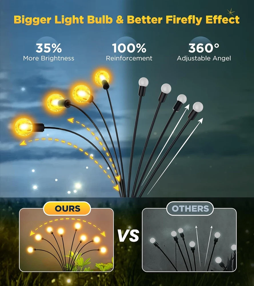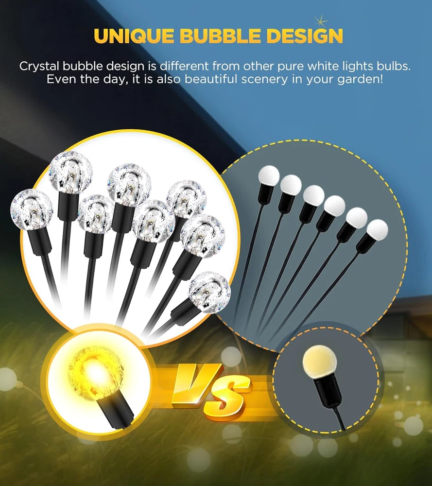 Store New Arrivals Add to Favorite View Feedback Contact Solar Lights for Outside, New Upgraded Solar Garden Lights with 48 LED Crystal Bubble Bulbs, Solar Lights Outdoor Waterproof, Firefly Lights Outdoor Yard Patio Pathway Christmas Decorations Description Item model number XLTD-731 Light Source Type LED Style Classic Number of Items 6 Power Source Solar Powered Number of Light Sources 48 Lighting Method LED Lamp Type LED Assembled Height 30 inches Cartoon Character Firefly lights Room Type Office Bulb Shape Size B10 Installation Type Freestanding Product Dimensions 4 x 4 x 30 inches Material Acrylonitrile Butadiene Styrene Assembled Width 4 inches Efficiency 25.7% Finish Type Painted Specific Uses For Product Walkway Included Components Bulb Indoor/Outdoor Usage Outdoor Water Resistance Level Waterproof Item Weight 1.98 pounds Shade Material Iron, Polyvinyl Chloride Connectivity Technology USB Special Features Rechargeable Special Feature Rechargeable Part Number 6 Shade Color multicolor Mounting Type Floor Mount Color Warm White Is Cordless? Yes Base Material Iron Is Waterproof True Shape Round Voltage 5 Volts (DC) Recommended Uses For Product Decoration Assembled Length 4 inches Finish types Painted Size 6 PACK WATCH FIREFLIES DANCE IN THE BREEZE - Experience unique solar decorative lights that sway like fireflies in the wind. Our solar firefly lights are crafted with specialized iron wire and heavy-duty bulb base that enhances the swaying motion, creating a captivating 360° dance. Setting solar lights for outside apart from common white bulbs, our solar garden lights feature a crystal bubble design that seamlessly blends with day and night surroundings, making your home and garden shine anytime! EXTRA LONG DUSK TO DAWN SHINE BRIGHT - Featuring an enlarged monocrystalline solar panel with an impressive 25.7% conversion efficiency, our solar garden lights charge quickly even on cloudy days. With a built-in 600mAh Ni-MH rechargeable battery, our solar outdoor ligths provide up to 12 hours of longer-lasting lighting after charging in the sun for 6-8 hours. You can use these outdoor solar lights year-round for holidays, parties and the coming Christmas. 2 X 8LED BULBS=35% MORE BRIGHTNESS -Brighten up your garden like never before with our solar garden lights. Unlike other firefly lights offer just six small LED bulbs, our solar lights feature impressive 8 large LED bulbs with up to 5 lumens brightness. Crafted from high-quality PVC, the lampshade boasts a 20% increase in transparency, making our solar garden lights 35% brighter than other solar yard lights. Illuminate your garden with these magical outdoor solar garden lights. MAINTENANCE FREE & ULTRA WATERPROOF - Our solar firefly lights are easy to install. Simply place your firefly lights in a sunny spot and let the sun do the rest for you. With IP65 waterproof grade, you can use these solar lights outdoor waterproof in gardens, lawns, flower beds, patios, paths, and decks without worry about extreme weather. These outdoor lights solar powered are automatically turn on at dusk and off at dawn, making them easy to use while saving you money on electricity. Product Description URAGO 2023 New Upgraded Solar Garden Lights with Crystal Bubble Bulbs The video showcases the product in use. The video guides you through product setup. The video compares multiple products. The video shows the product being unpacked. ZERO WIRES +100% SOLAR POWERED = ZERO ENERGY BILL. Simply stake the firefly lights in a sunny spot and let the sun do the rest! Firefly Garden Lights Solar Outdoor can be used for a variety of occasions, from gardens and patios to weddings and events, it is the ideal gift for a variety of occasions such as Halloween, Christmas, Mother's Day, Valentine's Day, weddings, parties, anniversaries, birthdays and more. ABOUT US We offer the best prices around on high quality products. Our E-store includes media such as books, movies, music and games while offering electronics, toys, sporting apparel, clothing, tools, general home, garden items and more. SHIPPING We are always working hard to ensure your package arrives as soon as possible. Please understand that some factors like weather, high postal traffic, and the performance of shipping companies are outside of our control. We offer free shipping to the lower 48 states and ship within 2 business days of payment, usually sooner. We do not accept P.O. Boxes. Please provide a physical address. For shipping outside of the continental USA, we only use eBay's Global Shipping Program.The item is shipped to KY and then sent to the rest of the world. International customers are responsible for all duties and taxes. Continue to check out in order to calculate costs for shipping the item to your country. Messages regarding eBay's Global Shipping Program MUST be directed at eBay EXCLUSIVELY. RETURNS We offer a 30-Day Return Policy on items which you are not completely satisfied with. You have the option for a full-refund or an exchange of the item. No returns are available on items shipped outside of the USA. PAYMENT We accept PayPal. CONTACT US This page content is yet to come Please ad us to your favorite seller and visit again later Thank You CUSTOMER SATISFACTION We try our very best to make sure every customer is completely satisfied. If there's a problem, message us! We're happy to help. WE ACCEPT Copyright © 2021 AutoDS. | All Rights Reserved