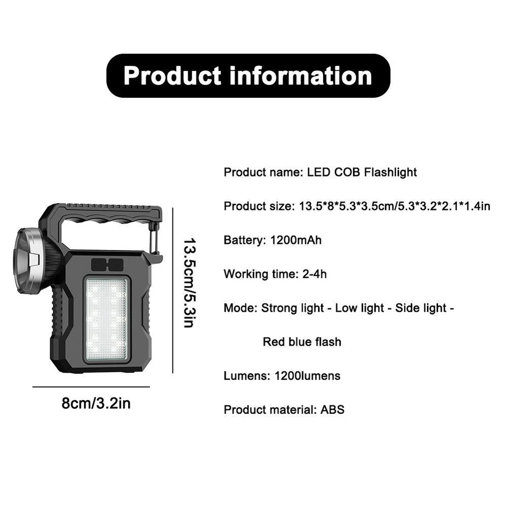 Description Description&Preview shipping&policy Description: Product name: LED COB Flashlight Product size: 13.5*8*5.3*3.5cm/5.3*3.2*2.1*1.4in Battery: 1200mAh Working time: 2-4h Mode: Strong light - Low light - Side light - Red blue flash Lumens: 1200lumens Product material: ABS Product features: 1. Solar-powered handheld flashlight with strong long-range beam for enhanced visibility. 2. Equipped with side lights for wide-angle flood illumination in white light, as well as red and blue flashing modes. 3. Features fast Type-C charging capability for quick and convenient power replenishment. 4. Built with a metal hook for easy attachment and portability. 5. Ideal for outdoor activities, emergency situations, and versatile needs. Precautions: 1. As we all know , the different computers display colors differently, the color of the actual item may vary slightly from the following images. 2. If you feel difficult to choose the size, you can feel free to contact me we will give you some suggestion, but it is for you reference only. Package includes: 1 pc Flashlight Preview: Thank you for your purchase Problems? You can follow below process to contact us. There is a time zone difference,but we will do our best to quickly response to your questions: Shipping ● We will arrange shipping for you within 24 Hours after payment cleared except the holidays. ● We always send the item to the address you give us on Payoneer to ensure the security of the item. If you have changed your address, or want us to ship to another address, please change to the new address when you pay us with Payoneer, otherwise we will not be responsible if the package is lost. Payments We accepts Payoneer only If you have any questions about the payment,please contact us through eBay message. Import Duties In case some duty is due Upon delivery, it is your responsibility to meet that expense and this may cause delays to delivery schedule and you may have to pickup goods at the customs office. Terms & Conditions By bidding on this item,the Buyer agrees to all of the terms and conditions as outlined in this listing .please ensure to read and agree to All eBay terms and Conditions before bidding. All pictures are for illustration purpose only and Colours may vary slightly. Our store obeys all eBay Rules and Policies. Returns Policy To Return an item you must contact us and take photos of your item to clearly show any damage or unusual aspects of it. Approved returns will be subject to inspection on arrival. Items must be returned in original condition with all original packaging. All shipping and handing charges are non-refundable Return delivery costs are the responsibility of the buyer. We will cover the cost if sending replacement/repaired items. Within 7 days after receiving your products, we offers a no-hassle 7 day exchange/replace only if your items are found to be defective by manufacturer.