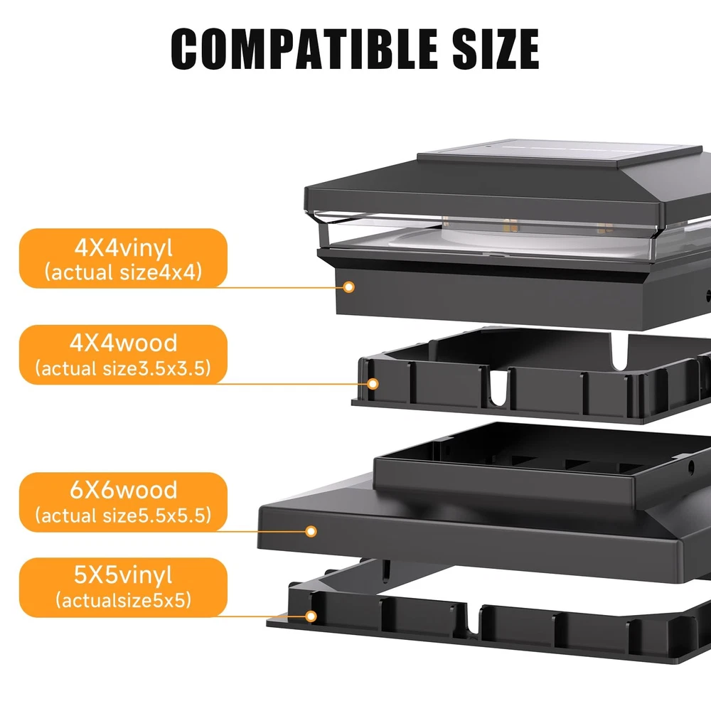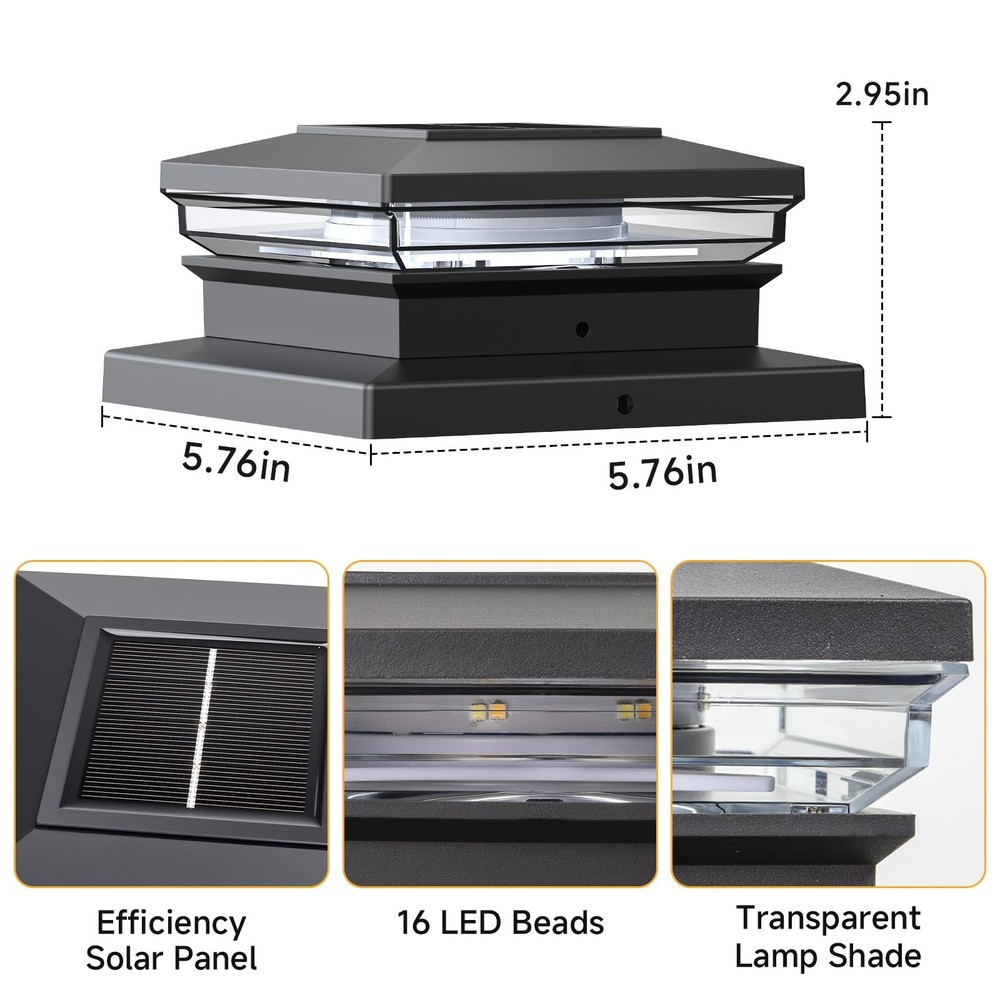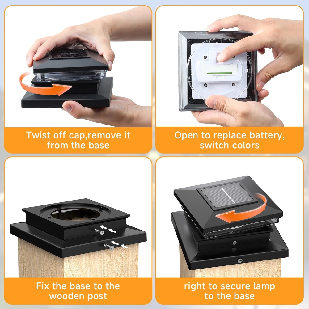 Light up your outdoor space with this 12-pack of solar post cap lights, perfect for fences, decks, patios, and garden posts. Each light is equipped with a high-efficiency solar panel that charges during the day and automatically turns on at dusk, providing soft, atmospheric lighting throughout the night. With dual lighting modes (warm white and cool white), you can easily customize the atmosphere to suit any occasion. Built with ABS material and IP64 waterproof design, these lights are designed to withstand rain, snow, and everyday outdoor conditions. Easy to install, they’re a stylish and energy-efficient way to elevate your home’s exterior. ✔️【2 Color Modes】The solar post cap lights offer two lighting modes - warm white or cool white. Warm white gives a relaxing glow, and cool white gives a bright glow. The light color can be easily adjusted using the switch located at the base of the solar post cap light. Equipped with 16 LED beads, it is 20 lumens of bright light, which is perfect for evening parties, garden decoration, outdoor lighting, deck decoration, fence decoration, and patio decoration ✔️【IP64 Waterproof Design】12pack fence post solar lights have been upgraded to IP64 waterproof, no need to worry about light rain, snow, frost, or sleet, etc. Our fence solar lights are made of weather-resistant ABS material, suitable for long-term outdoor use. Ensure durability and stable performance in various weather conditions. Ensure stable operation throughout the season. In stormy weather, please place the solar lights indoors to avoid damage to the solar panel ✔️【Easy installation】4x4 post solar lights come with installation instructions on the outside and inside of the packaging fence post solar lights are designed with multiple base options, making them compatible with standard, 4x4, 6x6 wood, 4x4, 5x5 vinyl, or plastic posts for easy installation. Mount the solar light on the fence post using the included mounting screws. If you encounter problems during the installation, you can contact after-sales support ✔️【Solar powered& Longer Lasting】Equipped with high-efficiency solar panels, it requires no electricity. Powered by the sun, automatically absorbs sunlight and stores energy during the day, and automatically turns on the light at night. It fully charges in 6–8 hours under direct sunlight and can keep a bright light at night. Each light includes an 1000mAh NI-MH AA rechargeable battery, allowing your outdoor space to glow long time and creating a green lifestyle easily ✔️【Garden/Patio/Decoration 】The 4x4 post solar lights single Dimension: 5.8 x 5.8 x 3.54 inches, mount on fences, deck railings, or boundary pillars throughout your front garden, enhancing pathways, drive approaches, patio, and garden borders. Solar post cap lights project radiance to accentuate flowerbeds, highlight architectural features. decorate your fence, deck, patio, porch, and landscaped gardens while complementing outdoor living spaces