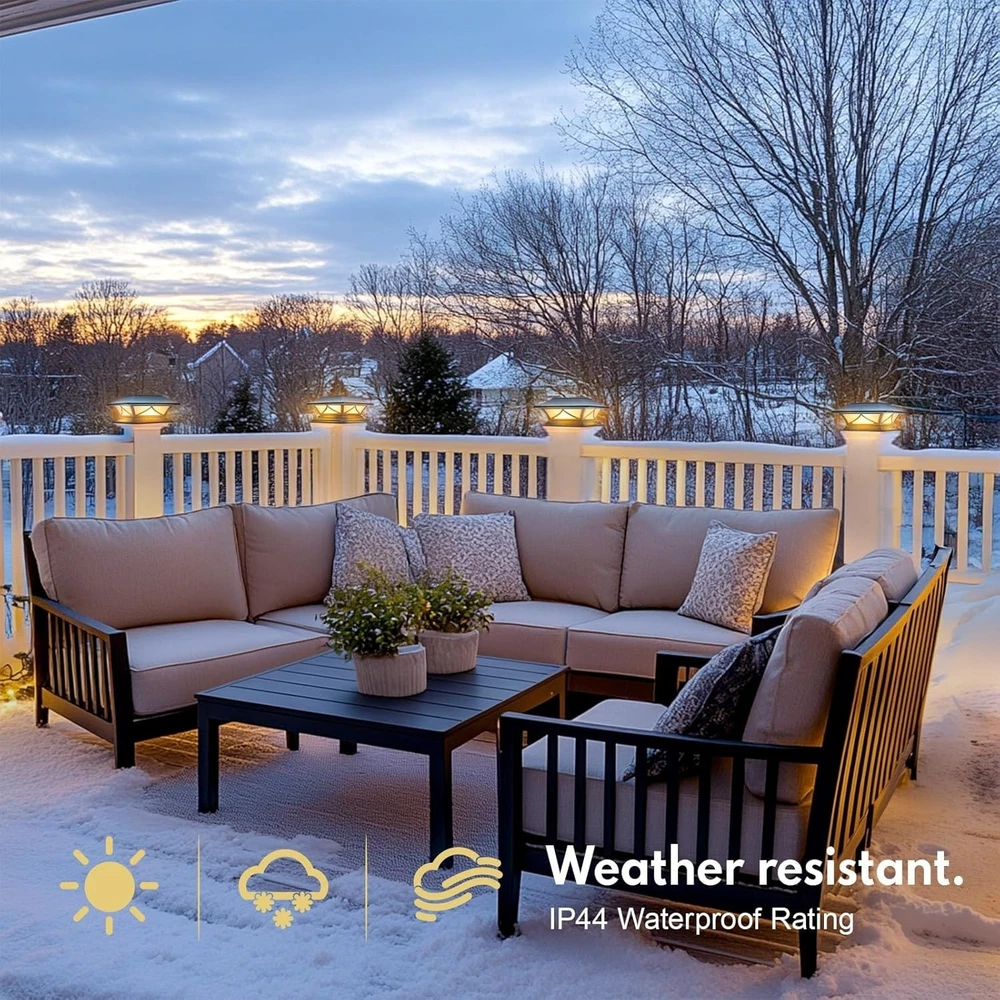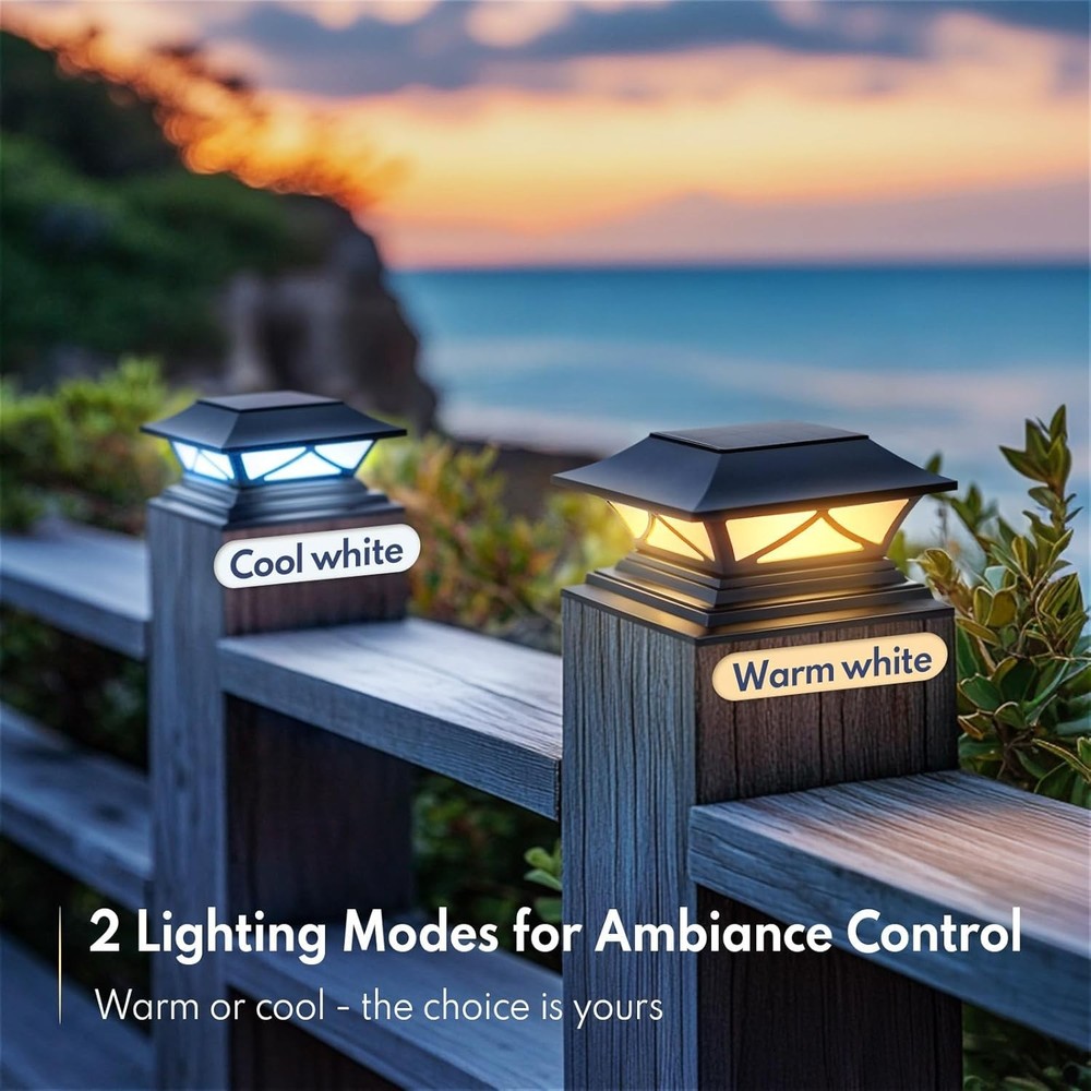 PASAMIC Solar Post Cap Lights 2 Pack, Solar Post Lights Outdoor Waterproof with 2 Color Modes, IP44 Deck Solar Powered for 4x4, 5x5, 6x6 Vinyl/Wooden Posts, Decorate Deck, Patio, Porch, Fence About this item DUAL COLOR MODES: Elevate your outdoor space with our solar post cap lights, designed to offer an ideal blend of warmth and brilliance. Choose between 2 elegant lighting modes: a soft, inviting warm white for a tranquil atmosphere or a cool white for vibrant clarity. With 8 precision-engineered LED beads, these solar post lights offer a harmonious glow ENERGY EFFICIENT & AUTOMATIC ON/OFF: Say goodbye to electric bills. Our solar post cap lights charge effortlessly throughout the day, requiring just 6-8 hours of sunlight for a full charge. As night falls, they illuminate your space for 10-12 hours, powered by the sun. The intuitive automatic on/off feature ensures that your 4x4 post solar lights turn on at dusk and off at dawn, allowing you to enjoy a seamless lighting experience EASY TO INSTALL: Designed with simplicity in mind, our solar post cap lights are easy to install. With 3 different base sizes to fit 4x4, 5x5, and 6x6-inch posts, they integrate beautifully with your outdoor posts, fences, and decks. No wiring is needed - just screw the post light onto your posts and secure it with the included screws. It's a smart, simple solution that enhances your space without the hassle of complex installations WEATHER-RESISTANT: Crafted from sturdy ABS material, our solar post cap lights are as durable as they are elegant. With an IP44 waterproof rating, they are built to withstand rain, snow, heat, and cold, making them the great companion for your outdoor sanctuary in every season. Whether under the summer sun or a winter snowstorm, these solar post lights outdoor waterproof provide reliable, enduring beauty WARM REMINDER: Operating these solar post cap lights is a breeze. Simply activate the power button, place the deck post lights solar powered in direct sunlight for a full 8-hour charge, and enjoy the peaceful ambiance they bring. Each set comes with clear, easy-to-follow instructions for a smooth setup. Please refer to the included manual for proper setup and use. Your outdoor space will shine with understated elegance and comfort