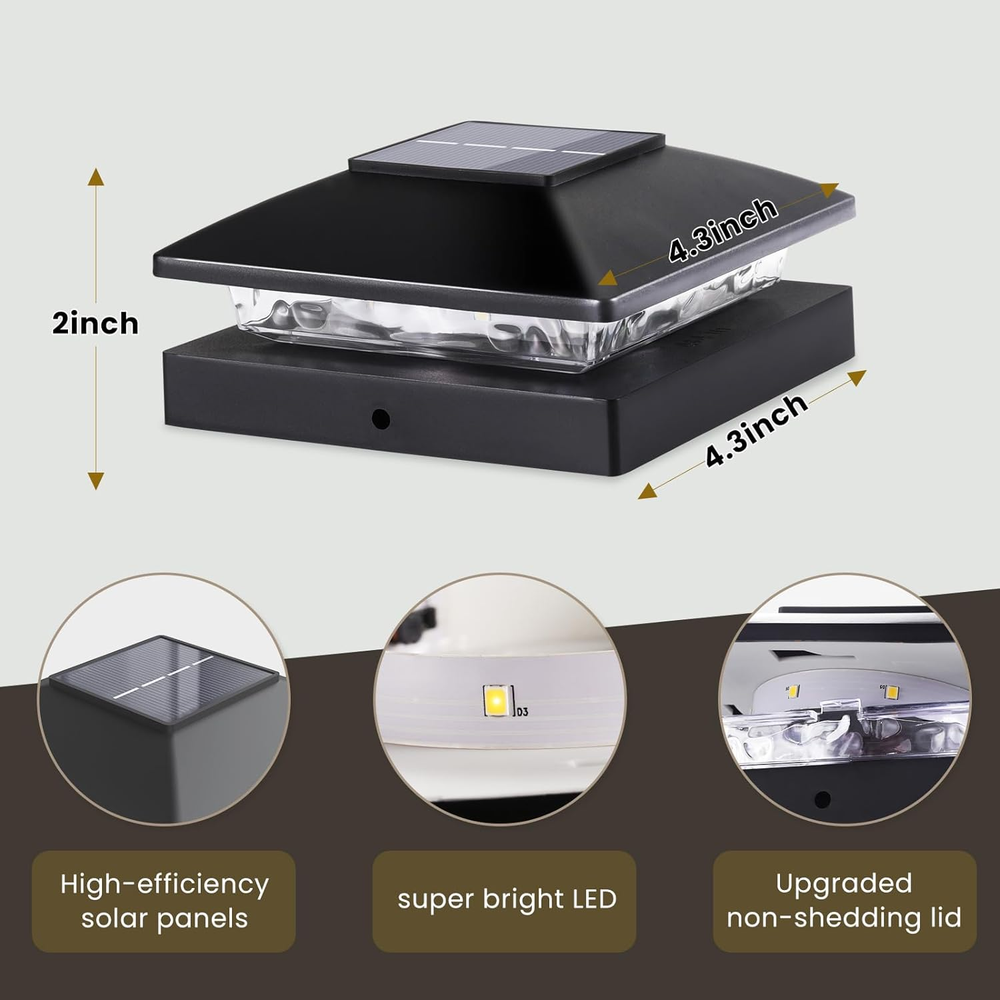 Store New Arrivals Add to Favorite View Feedback Contact Solar Post Cap Lights Outdoor 8Pack, Black Waterproof Solar Powered Deck Fence Post Lights Fit 4X4 Wood/Vinyl Posts, Bright Warm White Solar Post Lights Decorate Deck, Patio, Porch, Fence Description Item model number -TD10 Light Source Type LED Style Classic Number of Items 8 Power Source Solar Powered Number of Light Sources 8 Control Method App Warranty Type Limited Theme Solar Post Cap Lights for Outdoor Yard Garden Patio Fence Deck Batteries Included? No Lighting Method Downlight Unit Count 8.0 Count Room Type Outdoor space Assembly Required Yes Product Dimensions 1"L x 1"W x 1"H Material Plastic Installation Type Screw-in/Direct Mount Model Name -TD10 Finish Type White, Vinyl Specific Uses For Product Garden, Balcony, Deck, Fence, Patio Indoor/Outdoor Usage Outdoor Country of Origin China Light Color warm white Batteries Required? No Item Weight 2.53 pounds Light fixture form Path Special Features Energy Efficient, Waterproof, Cordless, Water Resistant Special Feature Energy Efficient, Waterproof, Cordless, Water Resistant Part Number -TD10 Shade Color White Mounting Type Post Mount Color Black Shape Square Shade Material Wood Finish types White, Vinyl Included Components LED Lens, Shade Size 8pack [Upgraded Post Light]Upgraded JOFIOS solar post cap lights enhances its utility while adding elegance to your outdoor space! First, the 8pcs 15 lumen LEDs refract more ambient light through the upgraded lens. Secondly, the upgraded lampshade is less likely to be knocked off when you are walking or running. [Weater Resistant] Solar outdoor lights for fence and deck is made of IP44 waterproof material, which can endure high temperature, heavy rain, wind and snow. Whenever night falls, the waterproof solar powered fence post lights will automatically light up rain or shine. [Easy Installation] These solar deck post cap lights are suitable for 4x4 wooden posts and 4x4 vinyl posts. To install these 4x4 Waterproof Black Fence Post Cap Lights, you just need to screw into the wooden/vinyl post and remove the tab on the light cover. NOTE: When you are mounting on a 4x4 vinyl post, remove the 3.5x3.5 adapter built into the base! [Save Energy] Bright warm white fence post solar lights charge in the sun for 4-6 hours during the day and automatically light up at night for 10+h continuous lighting.Solar-powered outdoor deck post lights without wire save labor and power costs while being environmentally friendly. [wide usage&Customer Service] You can install our post cap lights in gardens, pathways, decks, driveways, fences, patios, mailboxes, yards, porches, patios and any other places where the sun shines. No matter what problems you encounter during installation and use, please and we will provide you with prompt and professional after-sales service. Product Description JOFIOS SOLAR POST LIGHTS Excellent easy to install. Simple installation steps can be done independently by the elderly and women. Bright and soft light. Bright light spills through the frosted lens on the decks or fences to add a touch of elegance. Dusk to Dawn. automatically turn the lights on at dusk and off at dawn. No daily manual operation required. Quality materials. JOFIOS post cap lights are made of high quality thick plastic for durability. No risk of rusting. Solar Powered Powered by solar energy. Charge in direct sunlight for 4-6 hours during the day and light up for 10-12 hours at night. Warm White Light Simply remove the insulating tabs and the 4x4 post cap light will automatically come on at night emitting a bright warm white light. Unique Design Smaller and more sophisticated than other solar post lights, JOFIOS fence post light is a great way to decorate a deck without looking out of place. 8pc Light Beads 8 ultra-bright light beads form a strip, refracting more light through the corrugated lens to better illuminate the fence. ABOUT US We offer the best prices around on high quality products. Our E-store includes media such as books, movies, music and games while offering electronics, toys, sporting apparel, clothing, tools, general home, garden items and more. SHIPPING We are always working hard to ensure your package arrives as soon as possible. Please understand that some factors like weather, high postal traffic, and the performance of shipping companies are outside of our control. We offer free shipping to the lower 48 states and ship within 2 business days of payment, usually sooner. We do not accept P.O. Boxes. Please provide a physical address. For shipping outside of the continental USA, we only use eBay's Global Shipping Program.The item is shipped to KY and then sent to the rest of the world. International customers are responsible for all duties and taxes. Continue to check out in order to calculate costs for shipping the item to your country. Messages regarding eBay's Global Shipping Program MUST be directed at eBay EXCLUSIVELY. RETURNS We offer a 30-Day Return Policy on items which you are not completely satisfied with. You have the option for a full-refund or an exchange of the item. No returns are available on items shipped outside of the USA. PAYMENT We accept PayPal. CONTACT US This page content is yet to come Please ad us to your favorite seller and visit again later Thank You CUSTOMER SATISFACTION We try our very best to make sure every customer is completely satisfied. If there's a problem, message us! We're happy to help. WE ACCEPT Copyright © 2021 AutoDS. | All Rights Reserved