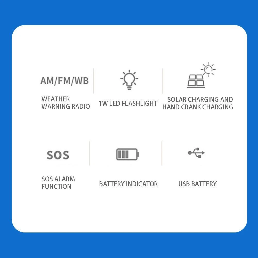 Free and fast shipping , shipping take up 1-7 Business Days 30 Day Return Accepted EASY PAYMENT via PayPal, Credit Card, PayPal Credit, Google Pay... Solar Power Bank 2000mah Mobile Phone Plastic Small Multicolor Radio Flashlight Functional Features 1. 3 LED illuminated flashlight. 2. AM/FM/WB (NOAA) radio. 3. 3. Emergency charging for cell phone (USB DC 5V output). 4. Multiple ways to charge the radio: a. Hand-cranked internal generator. b. Solar panel charging c. Charging with AC/DC adapter. d. Charging via USB charging cable connected to the USB port of the computer. 5. Waterproof IPX3 6. Battery overcharge or weak power protection. Technical Parameters. 1. external size: 129*60*50mm 2. Net weight about 220g 3. Maximum power consumption: 0.5W 4. Operating voltage: 2.7V-4.2V 5. Frequency range: AM 530~1620KHz FM 87~108MHz NOAA Weather band. 162.400 162.425 162.450 162.475 162.500 162.525 162.550MHZ. REVIEWS The product came very well packaged. I'm very happy. thank you for everything. Seller strongly recommended. This is great! I definitely recommend! Product looks amazing Delivery was fast. Excellent seller, great communication. I advise everyone to buy it!
